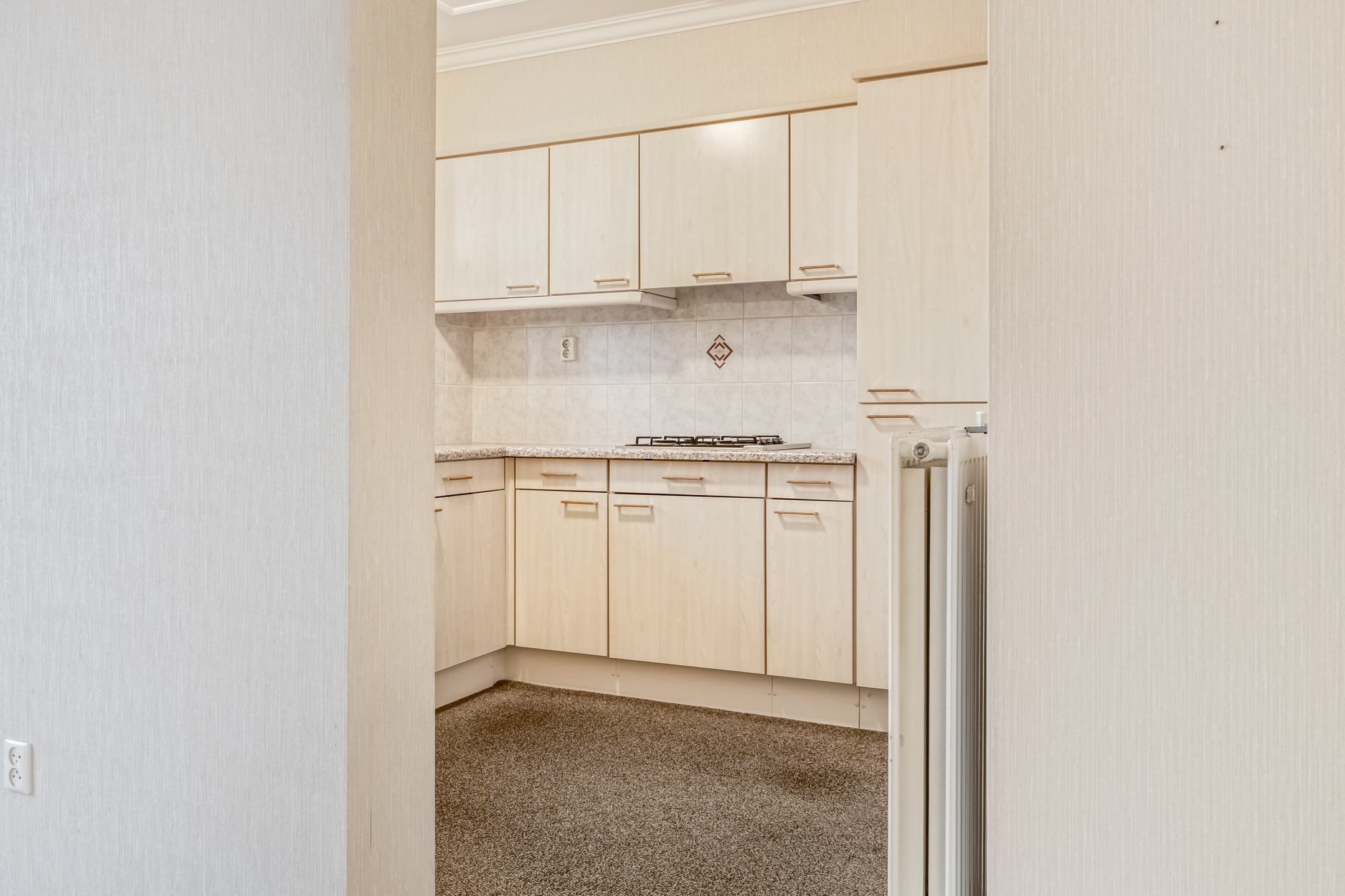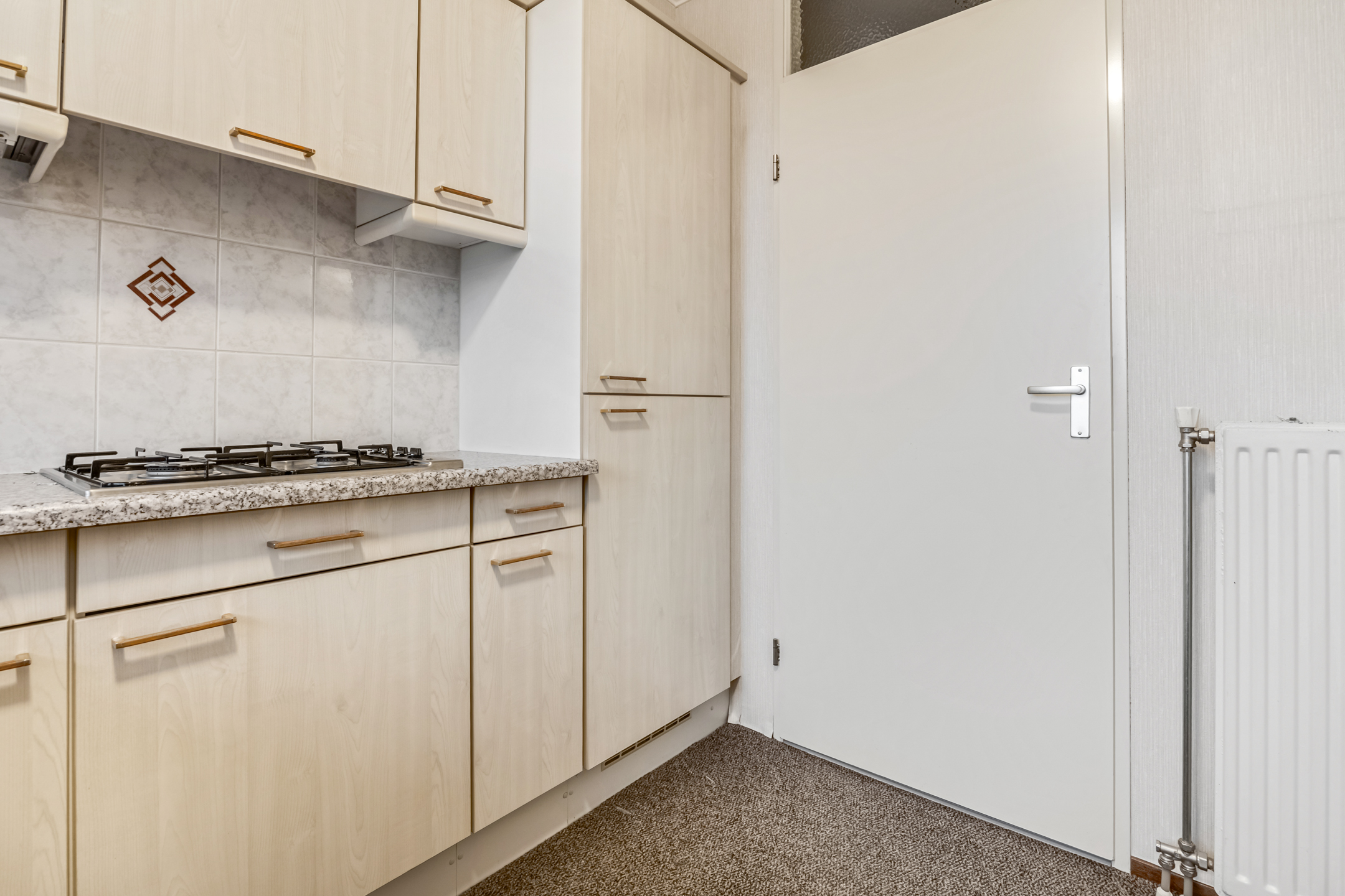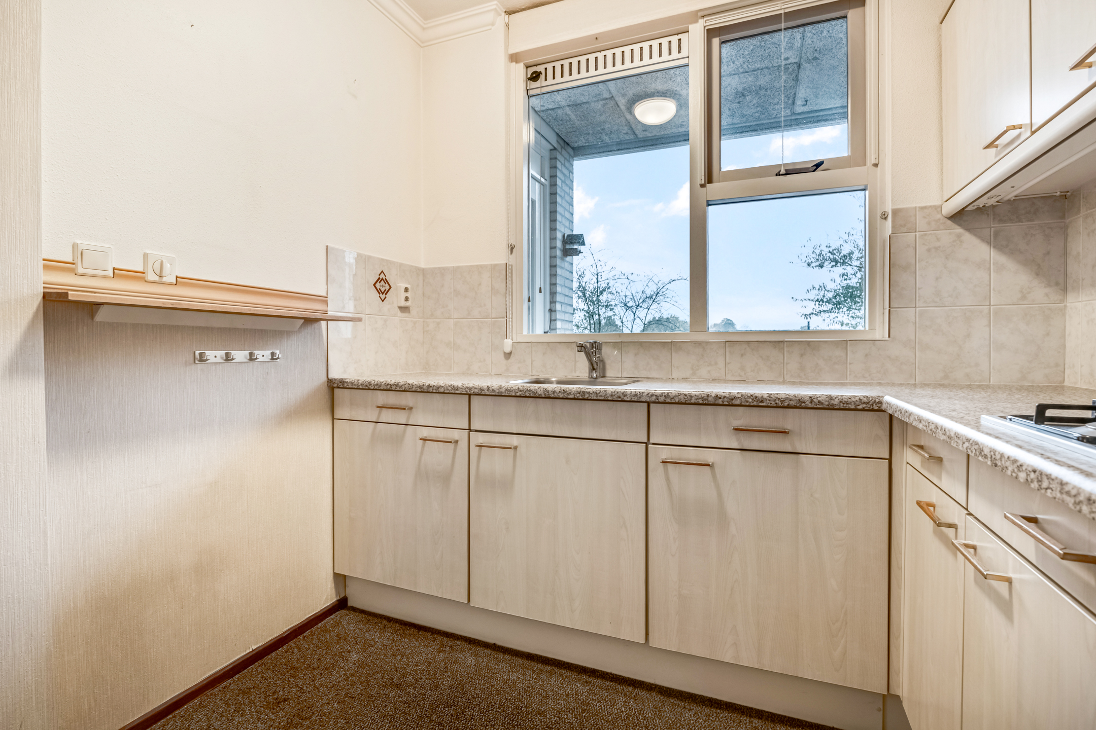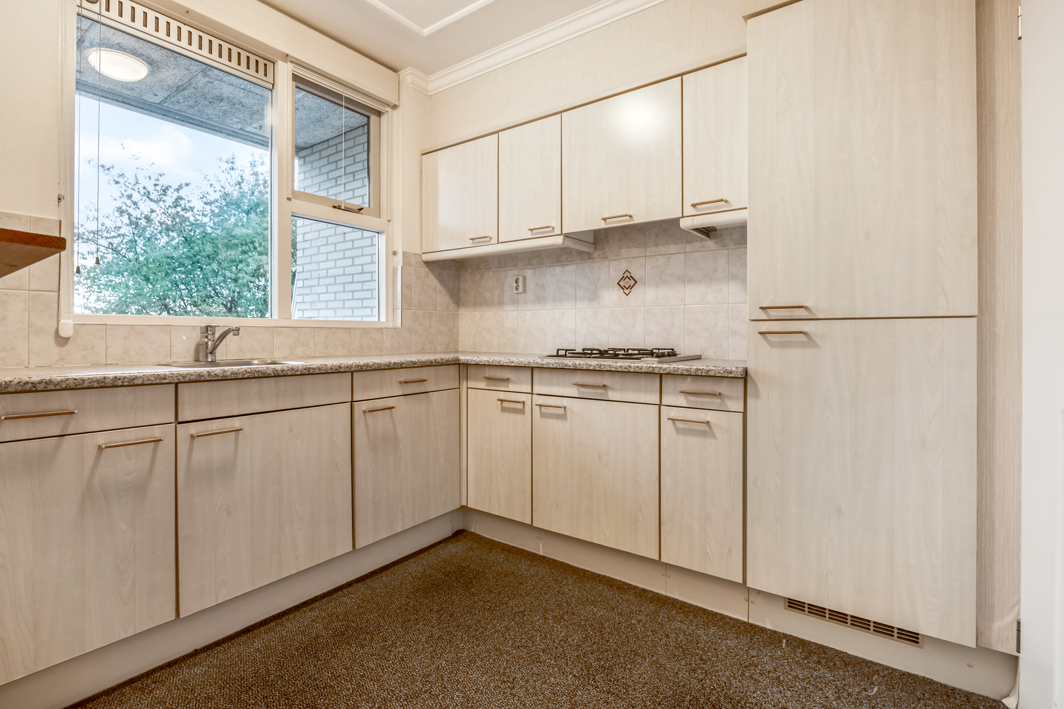 De halfopen keuken is in een praktische U-opstelling geplaatst en voorzien van diverse inbouwapparatuur. Dankzij het raam boven het aanrecht heeft u prettig daglicht én zicht naar buiten.