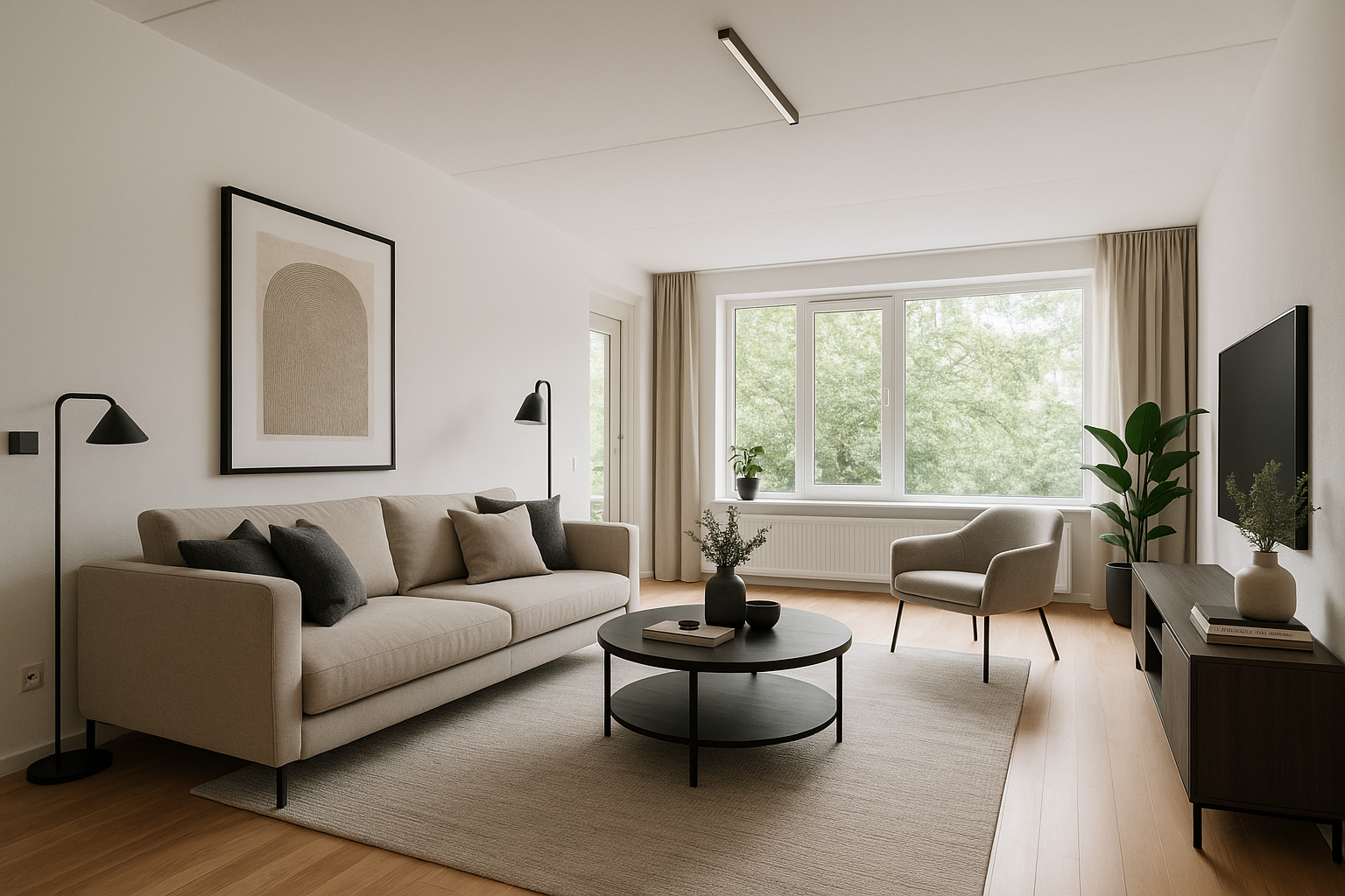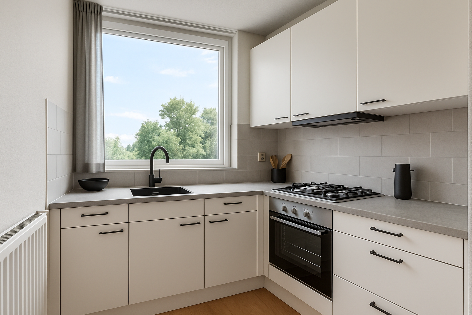 Lichte woonkamer met grote raampartijen en elektrische screens. Er is genoeg plek voor een gezellige zithoek en eettafel. Via de woonkamer stapt u zo het zonnige balkon op, ideaal voor een rustig moment buiten. De halfopen keuken grenst aan de woonkamer en is voorzien van een 4-pits gasfornuis, afzuigkap, koel-/vriescombinatie en combi-oven. Het appartement beschikt over twee slaapkamers, geschikt als slaap-, werk- of hobbyruimte. De badkamer is licht afgewerkt en voorzien van een douche, wastafel en aansluiting voor de wasmachine. Er is een apart toilet met fonteintje in de hal. Ook is er een interne berging met cv-ketel (Vaillant) en extra opbergruimte.
