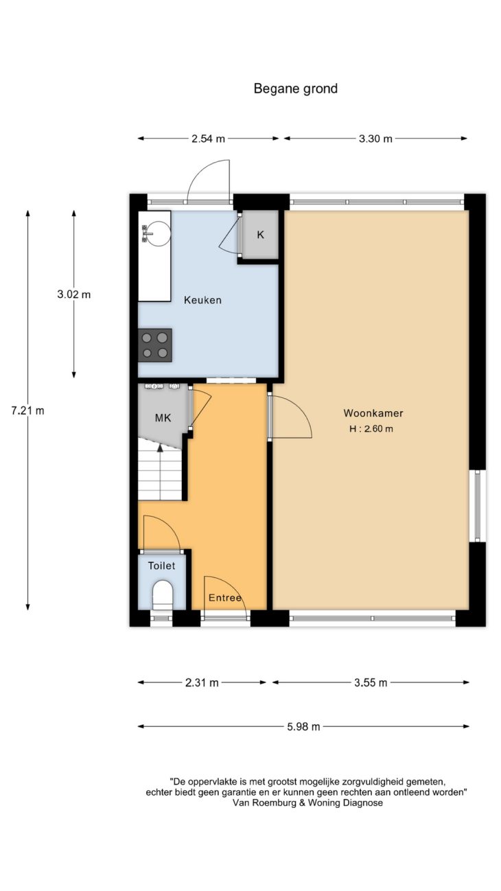 Je komt binnen in de hal met toegang tot het toilet, meterkast en de trapopgang. De doorzonwoonkamer is licht en ruim, met een grote raampartij aan de voorzijde. De dichte keuken aan de achterzijde is eenvoudig van opzet, maar biedt directe toegang tot de achtertuin. Hier kun je bijvoorbeeld kiezen voor een open leefkeuken met zicht op het groen.