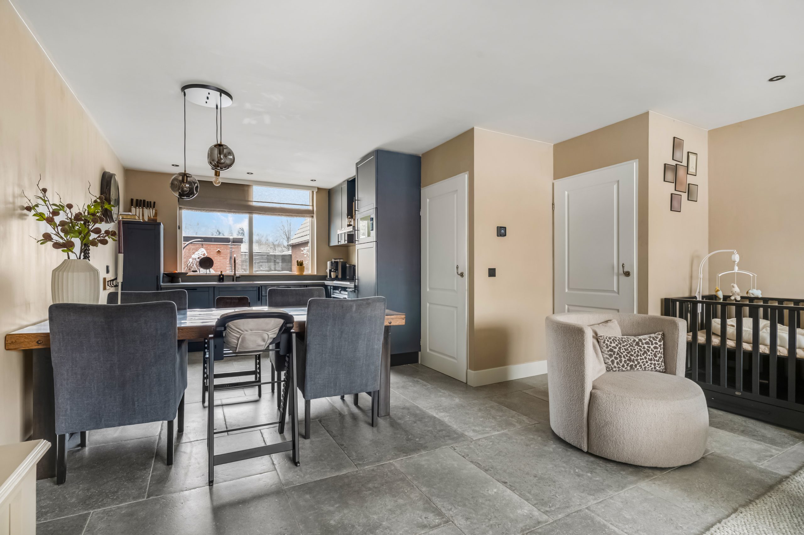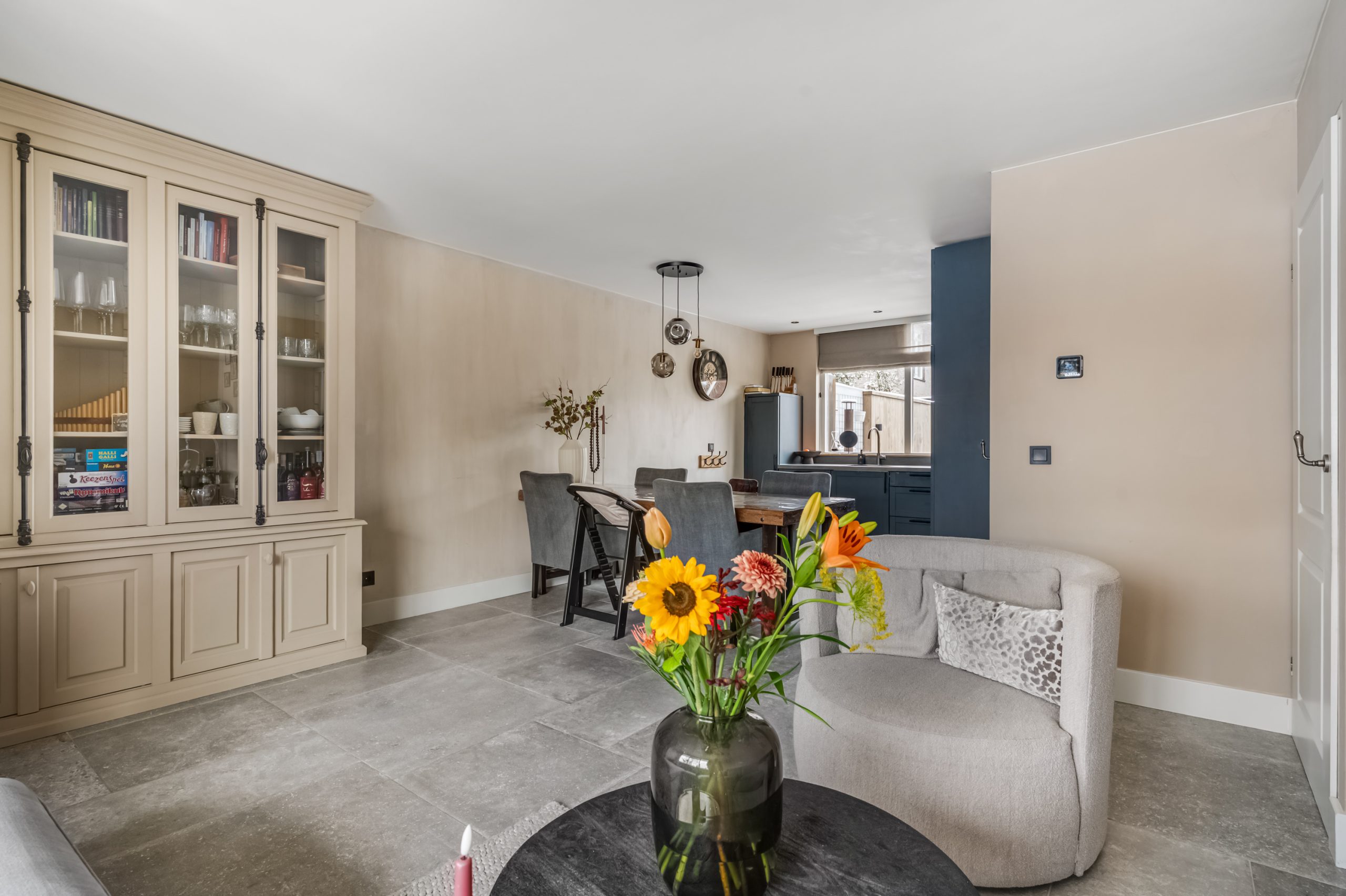 Je komt binnen in de hal die toegang geeft tot de woonkamer. De woonkamer is heerlijk licht dankzij de grote raampartijen aan de voorzijde. De warme kleuren en de fraaie tegelvloer zorgen voor een rustige, luxe uitstraling. Bovendien is de begane grond voorzien van vloerverwarming. Er is volop ruimte voor een royale zithoek en een eettafel waar je gezellig met vrienden of familie dineert.