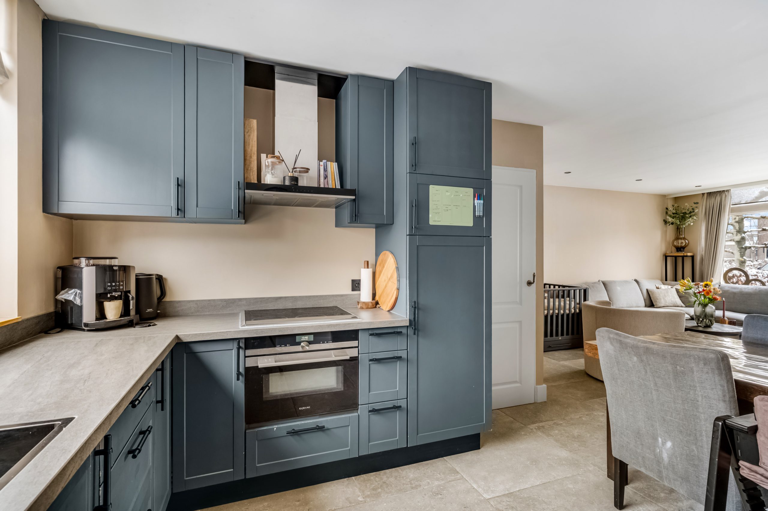 Aan de achterzijde van de woning bevindt zich de ruime open keuken, voorzien van diverse inbouwapparatuur, waaronder een kookplaat, afzuigkap, combi-oven/magnetron, koelkast, vriezer en vaatwasmachine. Dankzij het royale werkblad is dit een plek waar koken een plezier wordt.