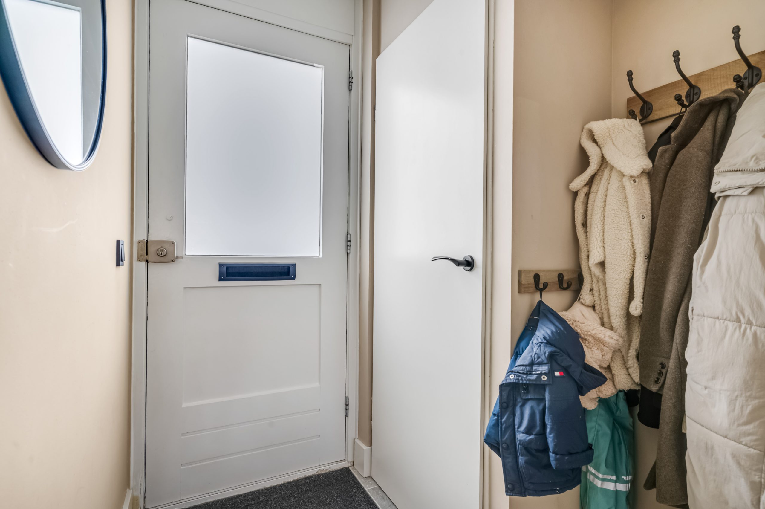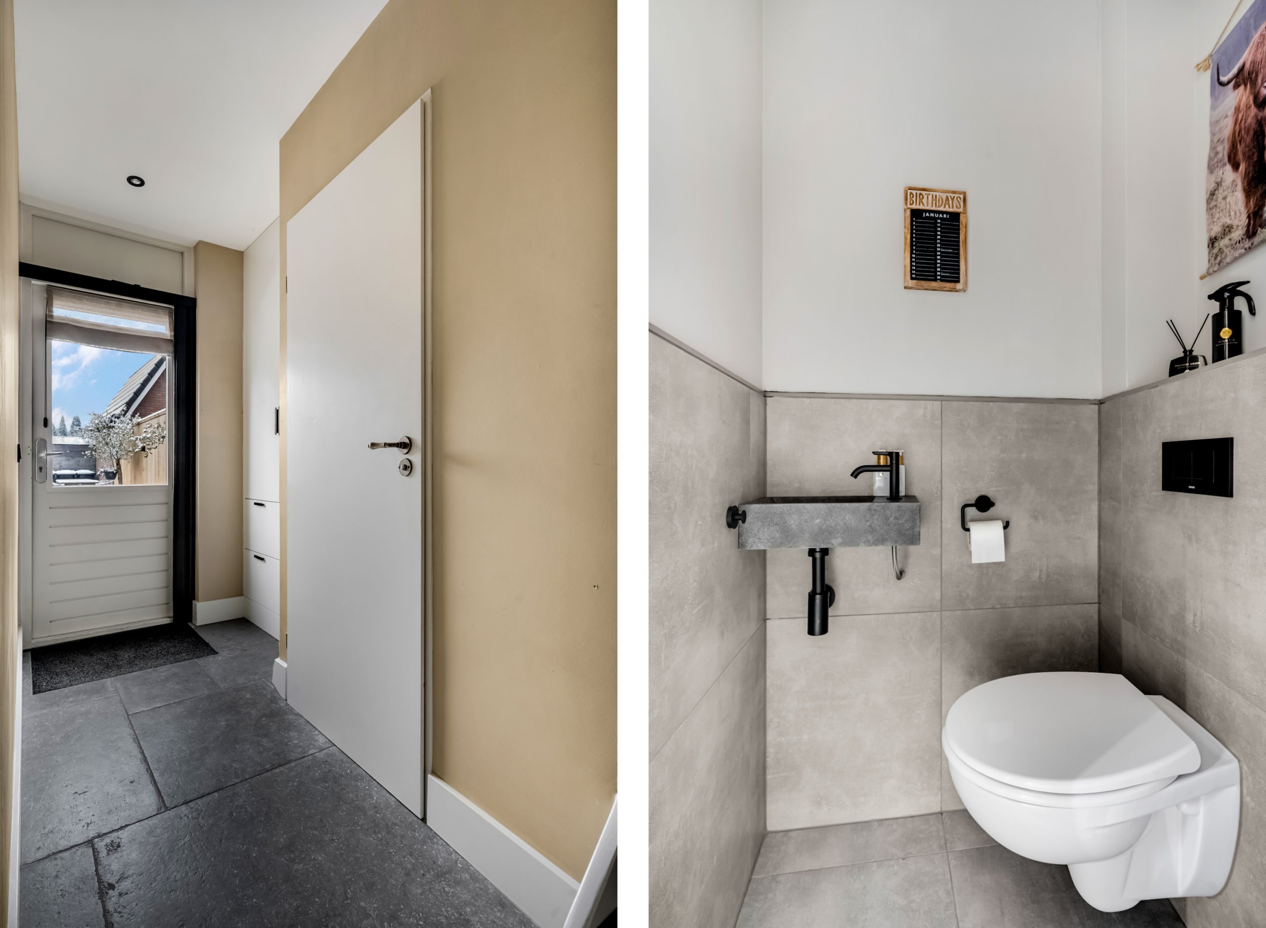 Naast de keuken bevindt zich een tweede hal, voorzien van een modern toilet met fontein en die toegang geeft tot de achtertuin.