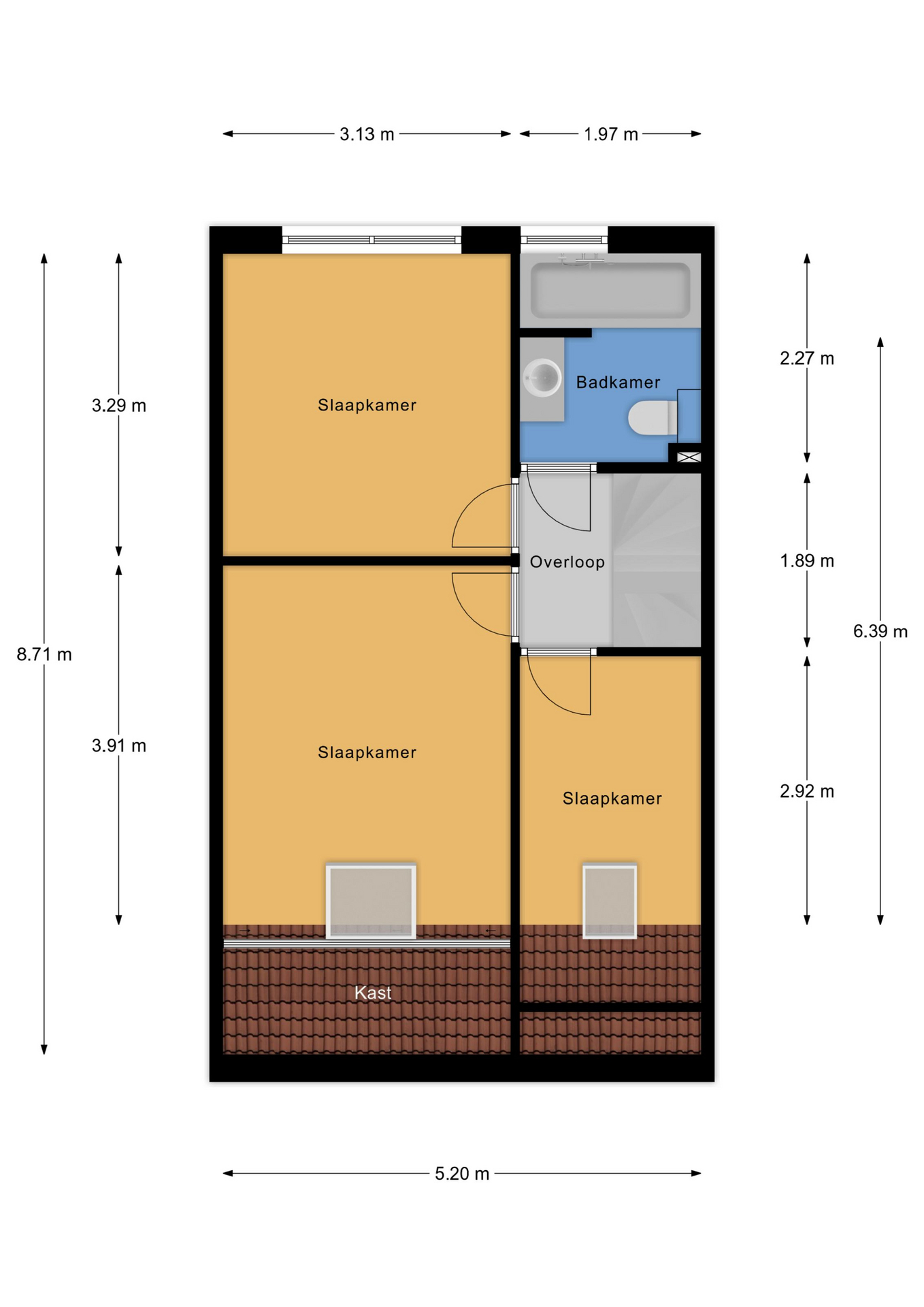 Op de eerste verdieping tref je drie keurig afgewerkte slaapkamers. Twee slaapkamers zijn voorzien van dakramen. De ouderslaapkamer beschikt daarnaast over extra bergruimte achter de knieschotten.