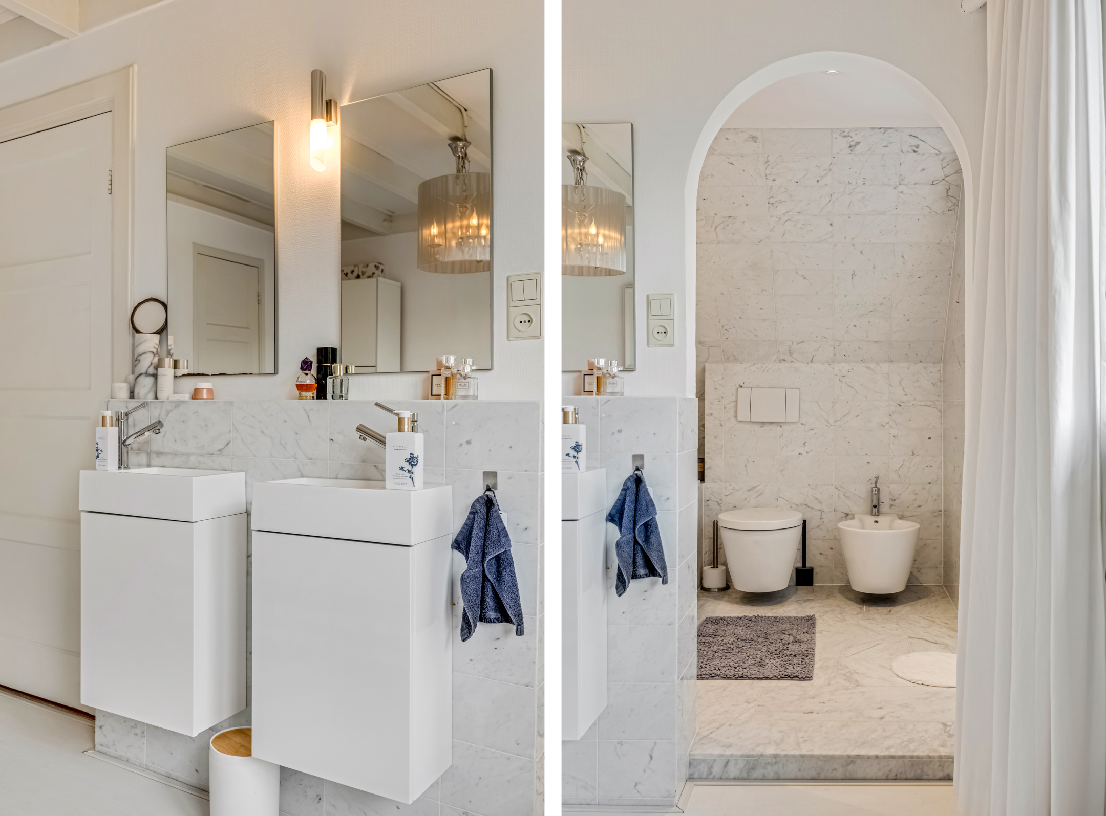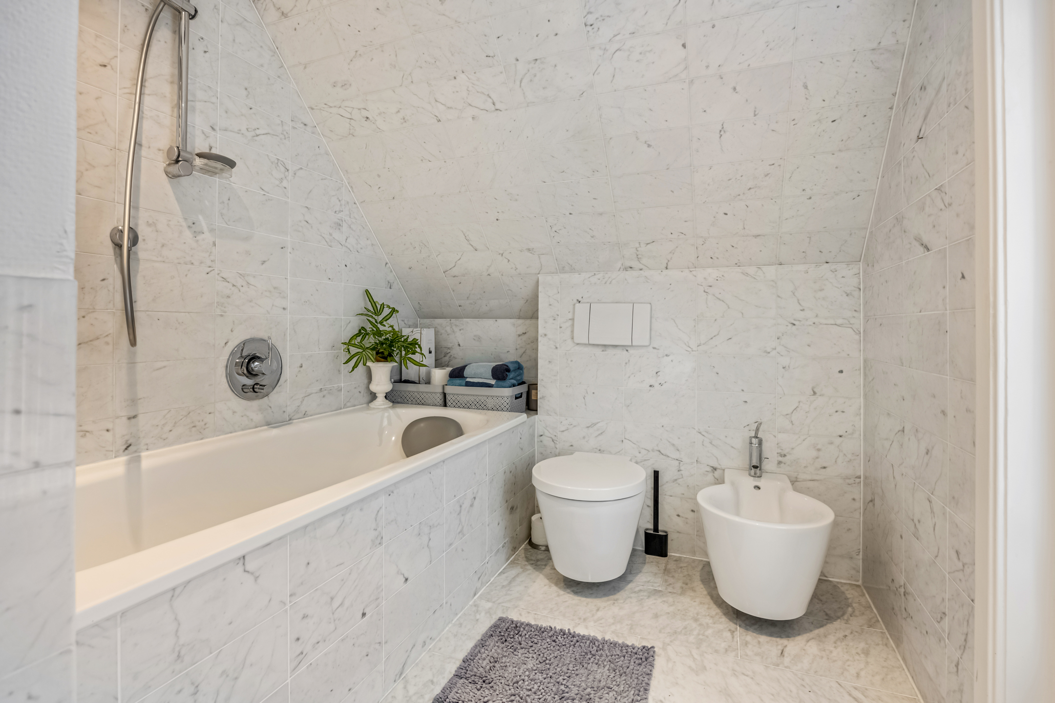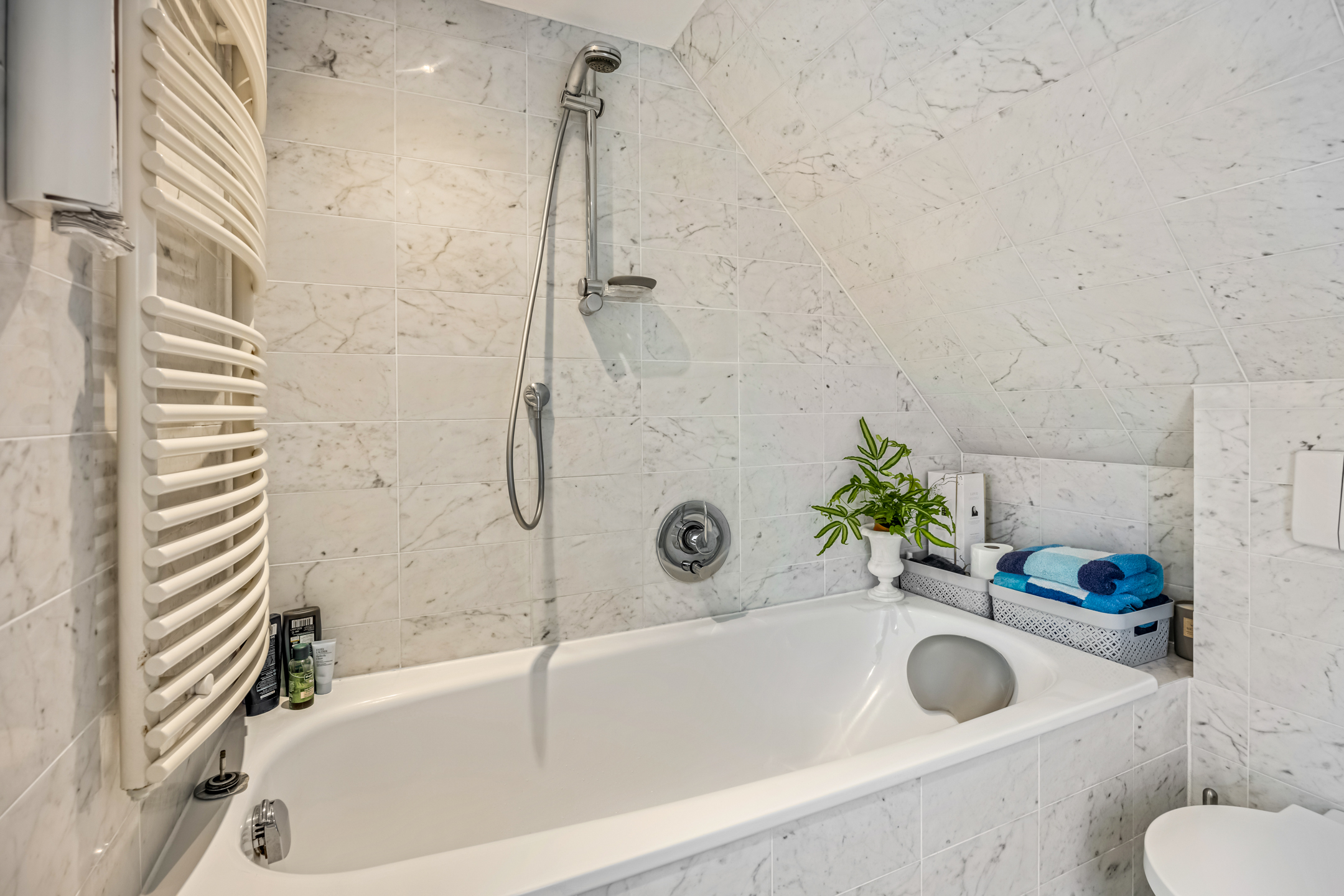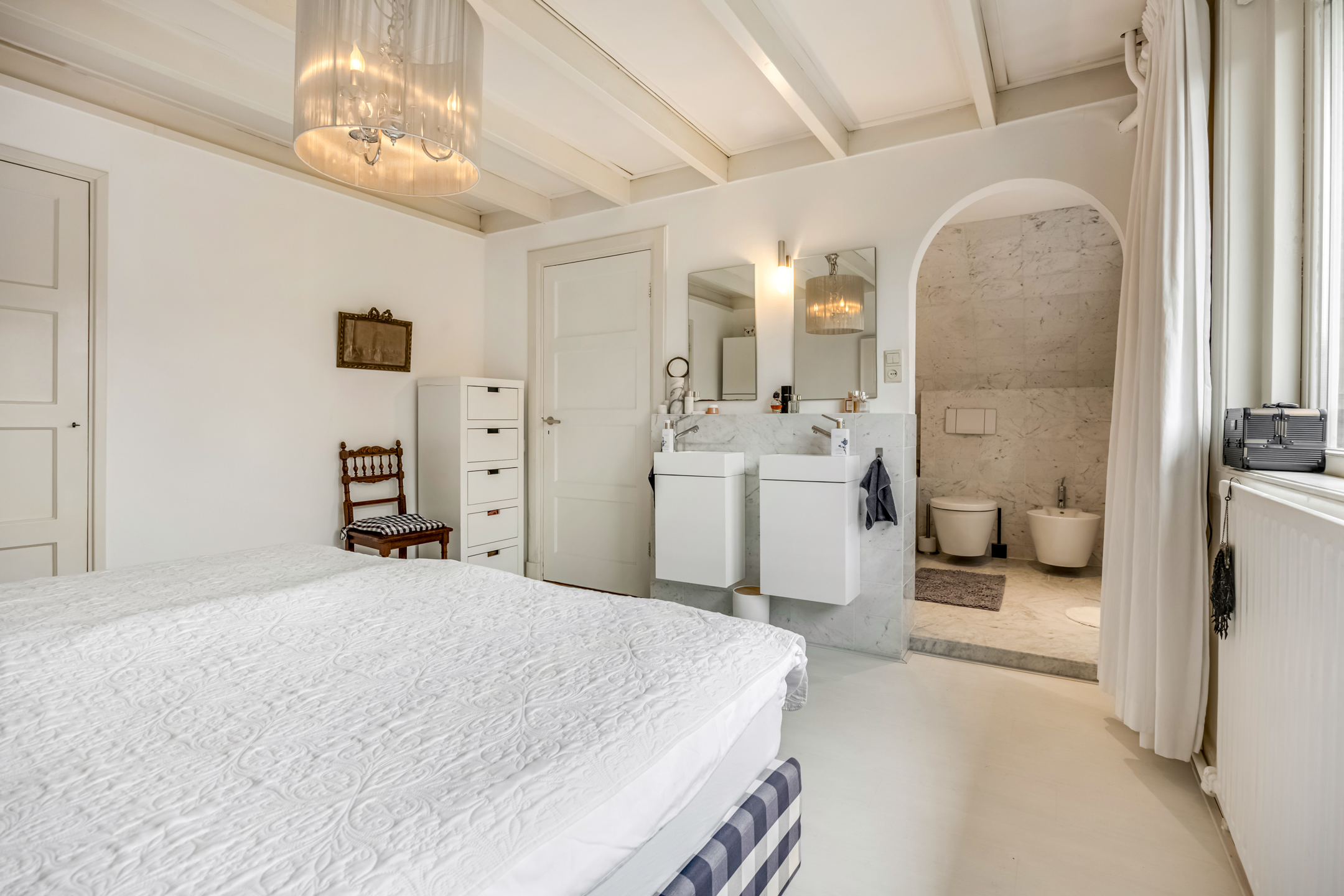 1e verdieping: overloop, slaapkamer met dakkapel, ruime slaapkamer aan de voorzijde met inbouwkast, ouderslaapkamer met inbouwkast en dubbel wastafelmeubel, aangrenzende badkamer voorzien van ligbad, bidet en toilet.