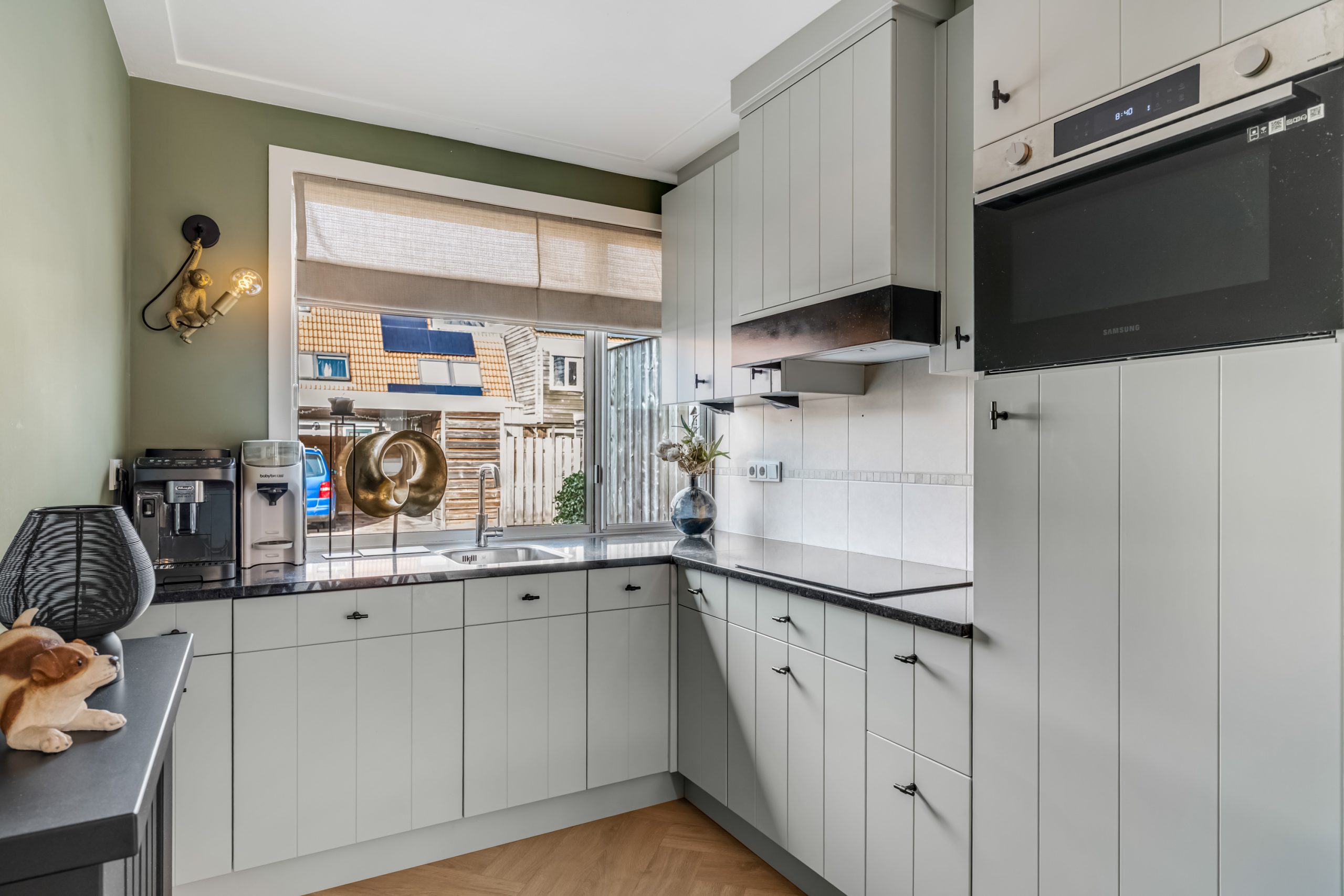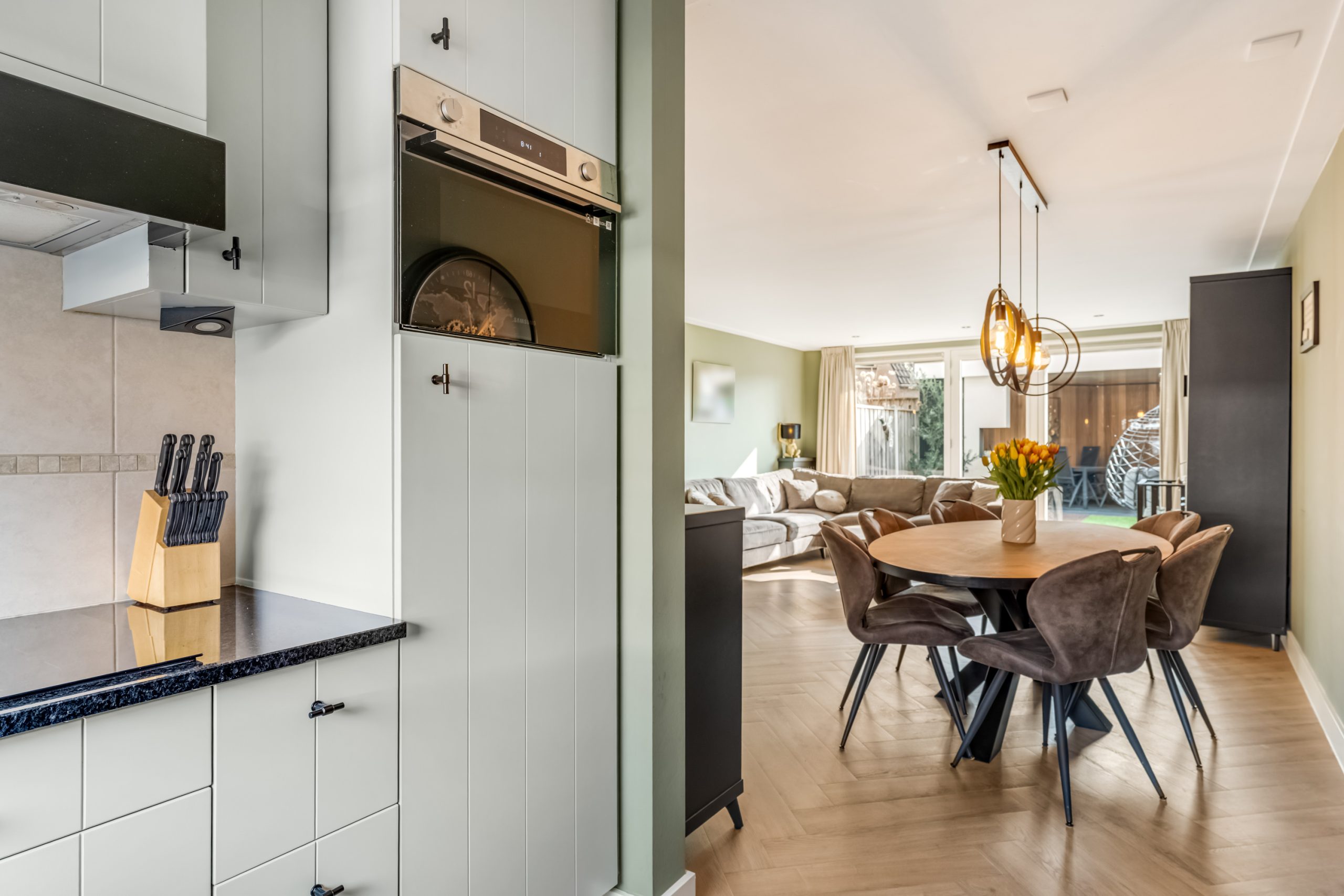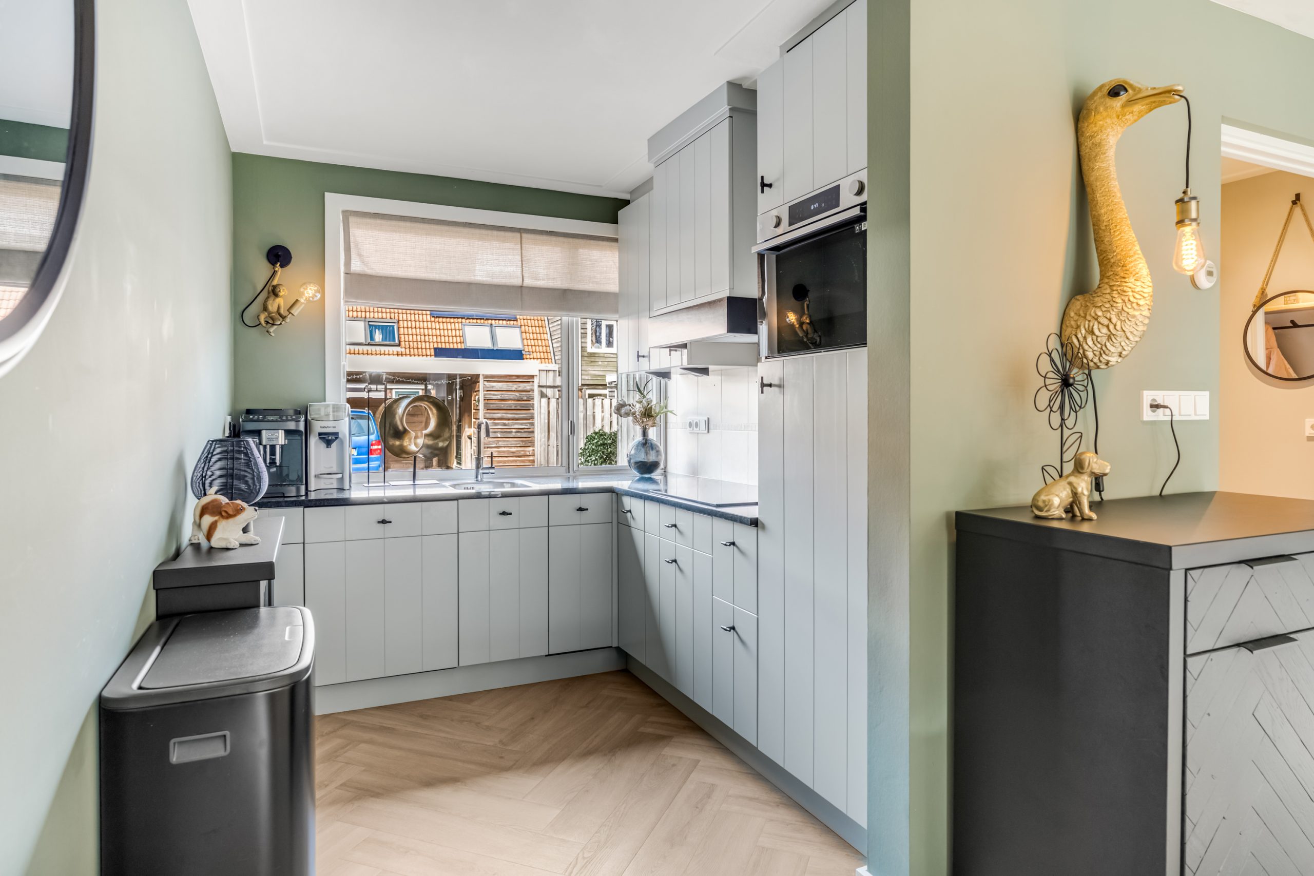 Aan de voorzijde van de woning bevindt zich de strakke keuken uitgerust met diverse inbouwapparatuur, waaronder een combi-oven, koelkast, afzuigkap en vaatwasser.