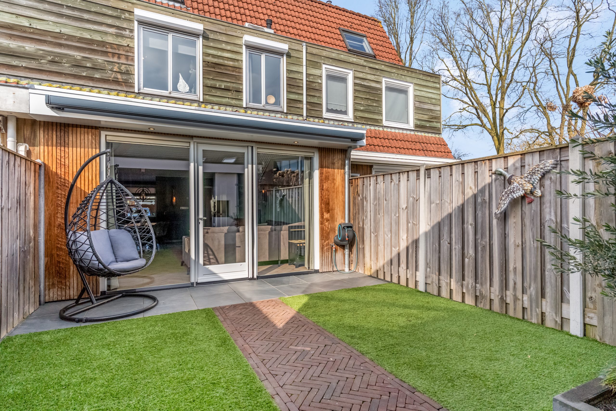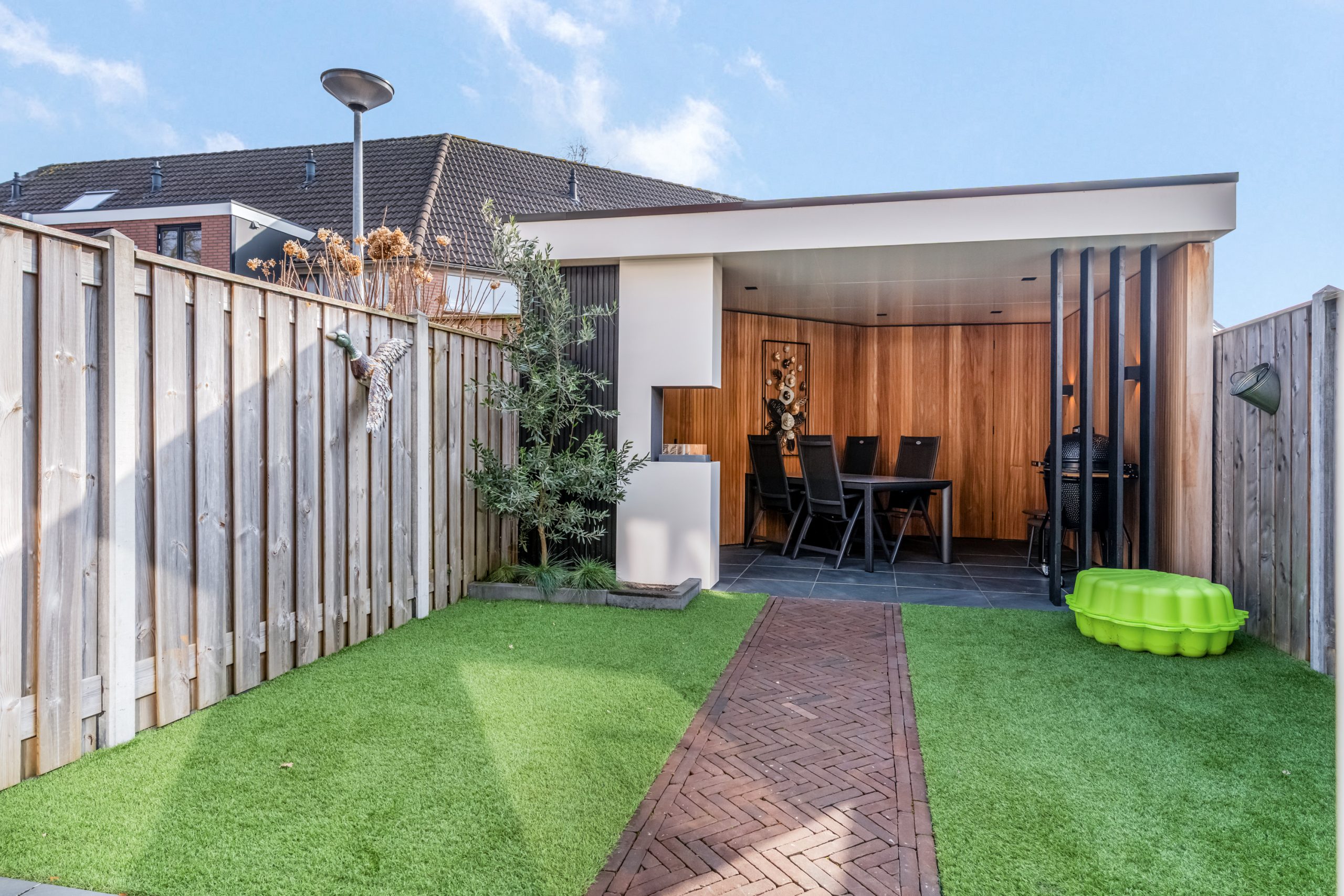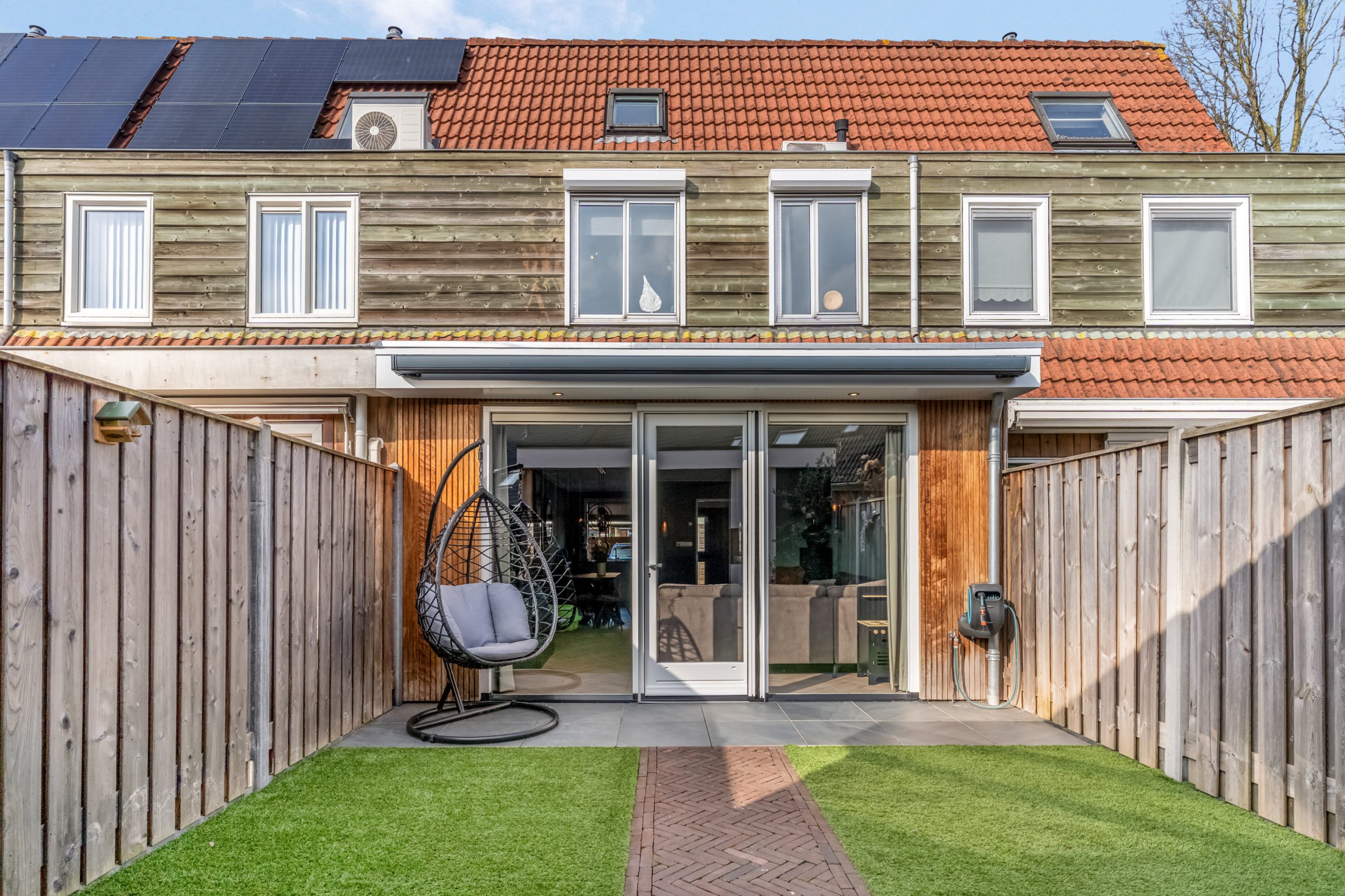 De achtertuin is onderhoudsvriendelijk aangelegd en biedt volop privacy. Achter in de tuin bevindt zich een prachtige, moderne veranda met houten afwerking, een echte eyecatcher! Hier kun je het hele jaar door genieten van lange zomeravonden, gezellige etentjes of een ontspannen moment voor jezelf. De tuin is bovendien voorzien van een achterom.