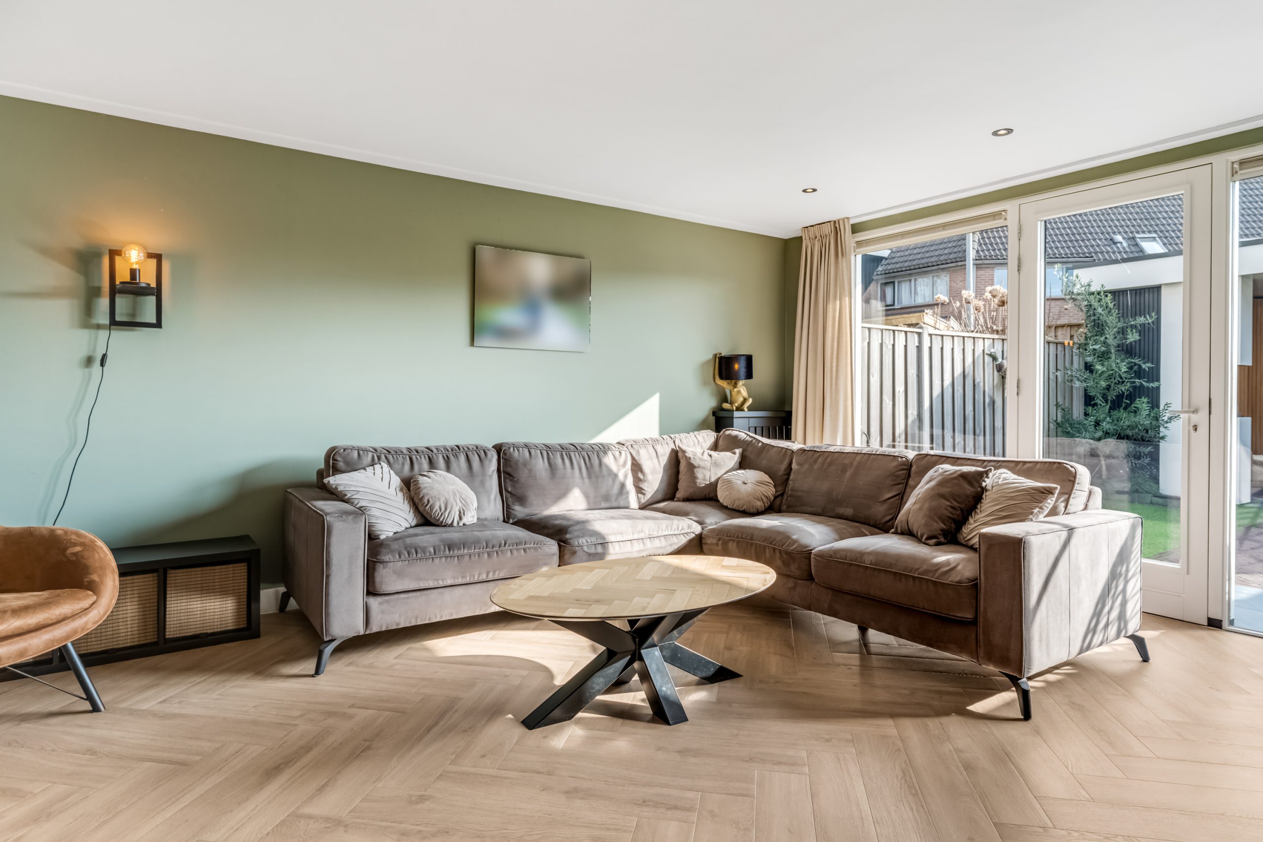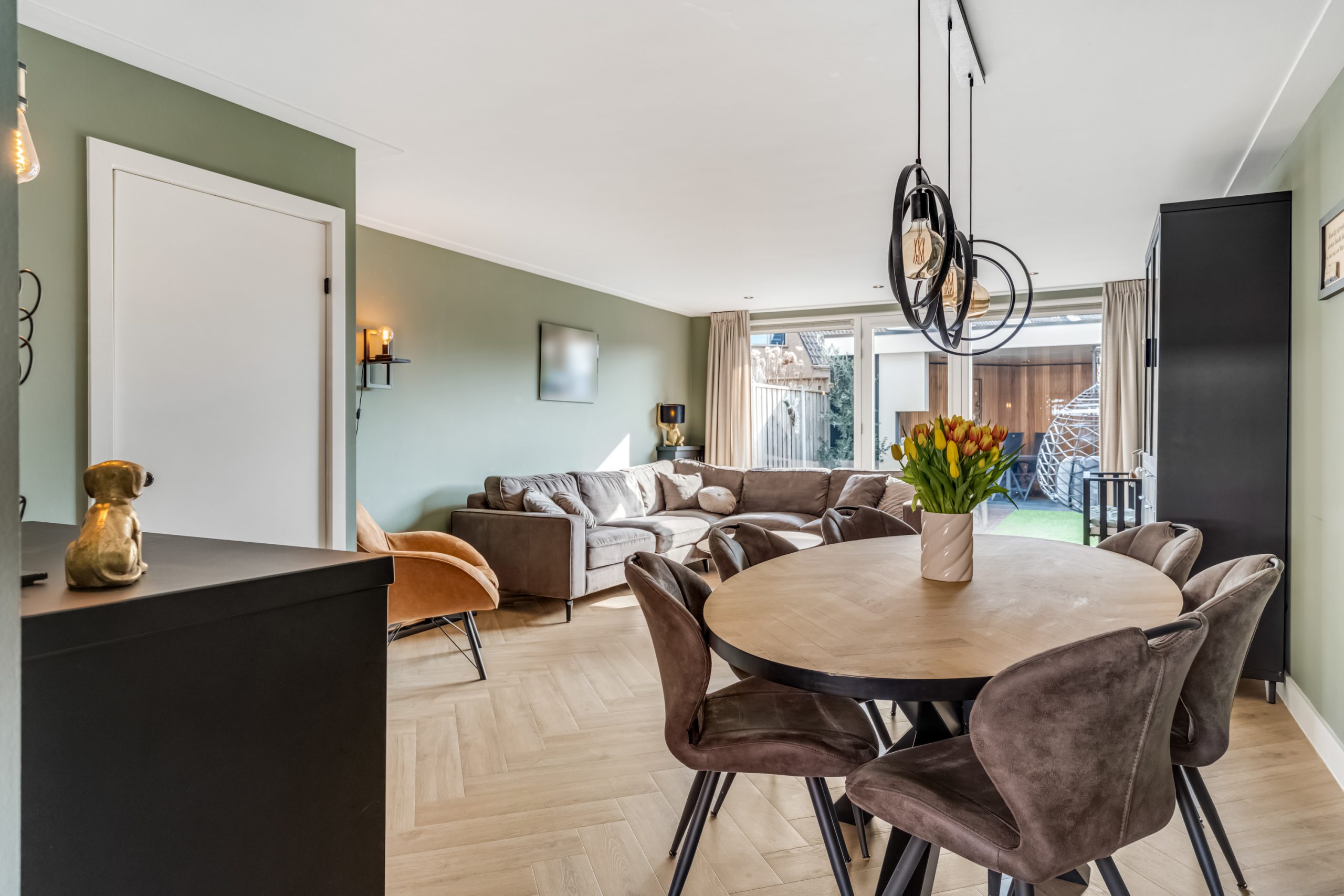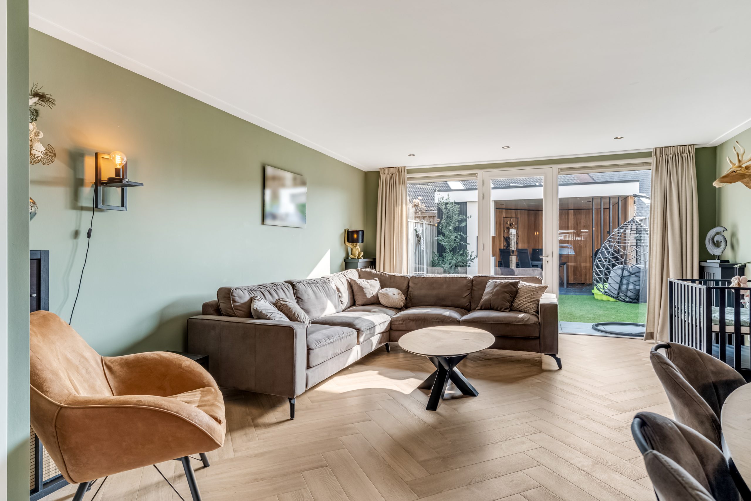De woonkamer is tuingericht en heerlijk licht dankzij de grote raampartijen. De moderne pvc-vloer zorgt voor een warme uitstraling en is onderhoudsvriendelijk.