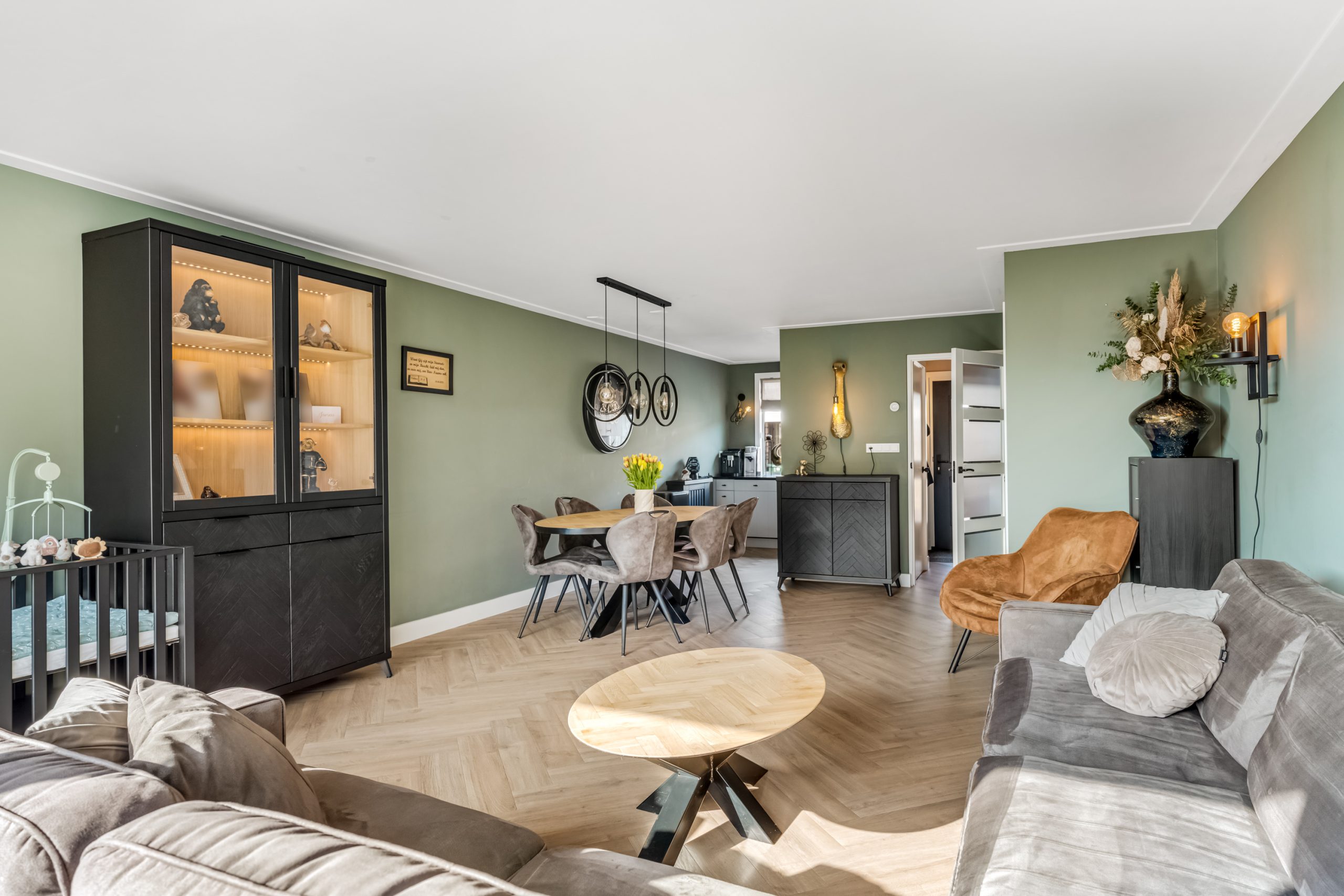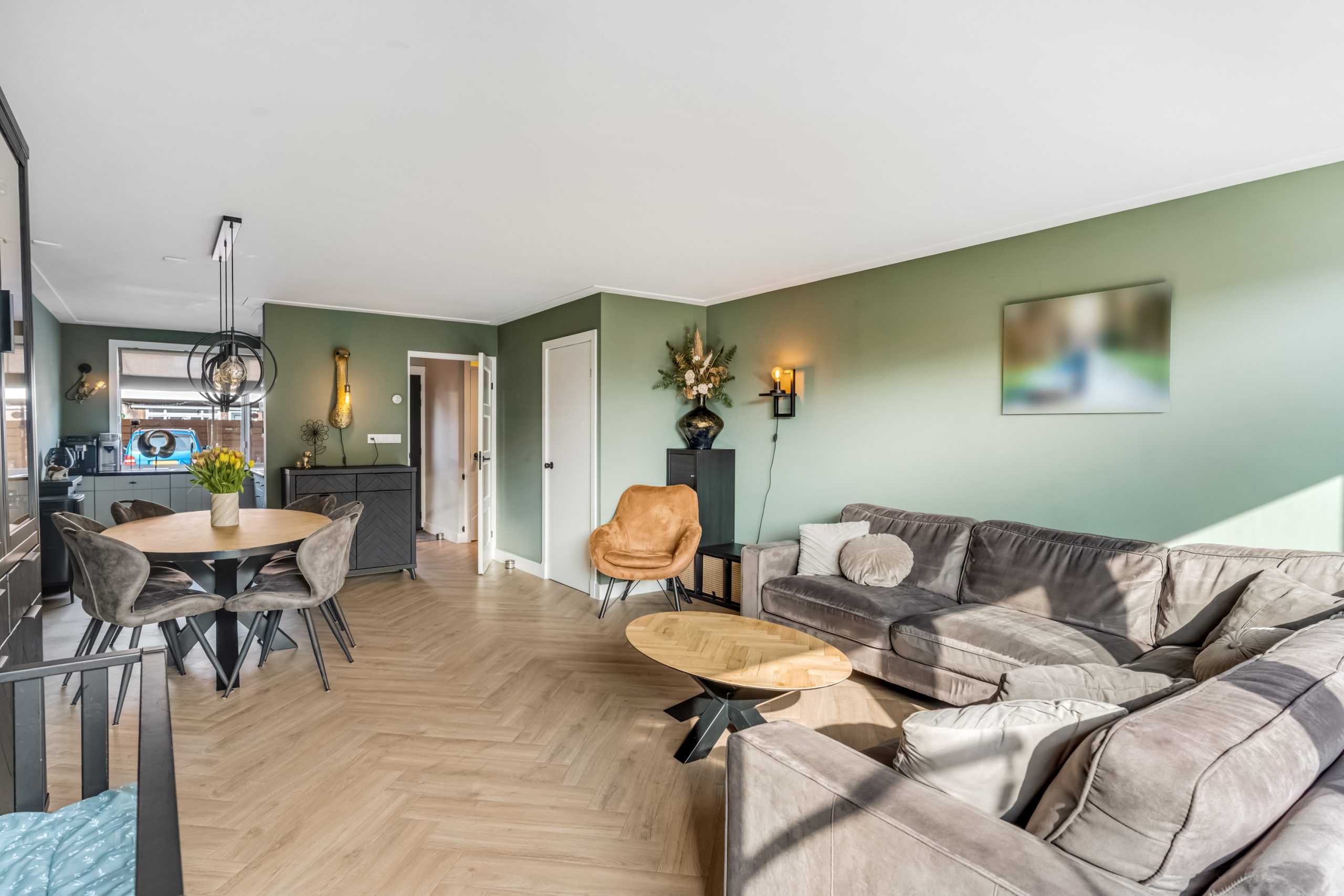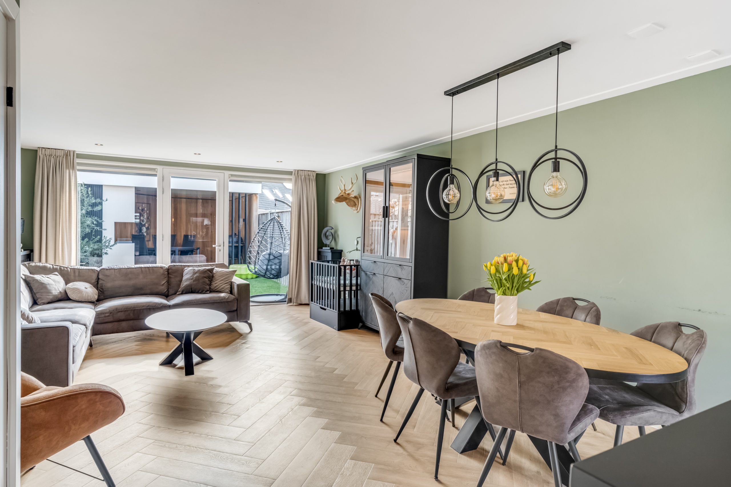 De woonkamer is tuingericht en heerlijk licht dankzij de grote raampartijen. De moderne pvc-vloer zorgt voor een warme uitstraling en is onderhoudsvriendelijk.