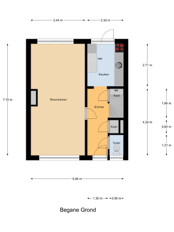 Entree/hal met toiletruimte, garderobekast en trapkast, dichte keuken met toegang tot de achtertuin en aansluiting wasmachine. Vanuit de hal is de woonkamer toegankelijk, de woonkamer is een echte doorzon woonkamer met grote raampartijen zowel voor als achter.