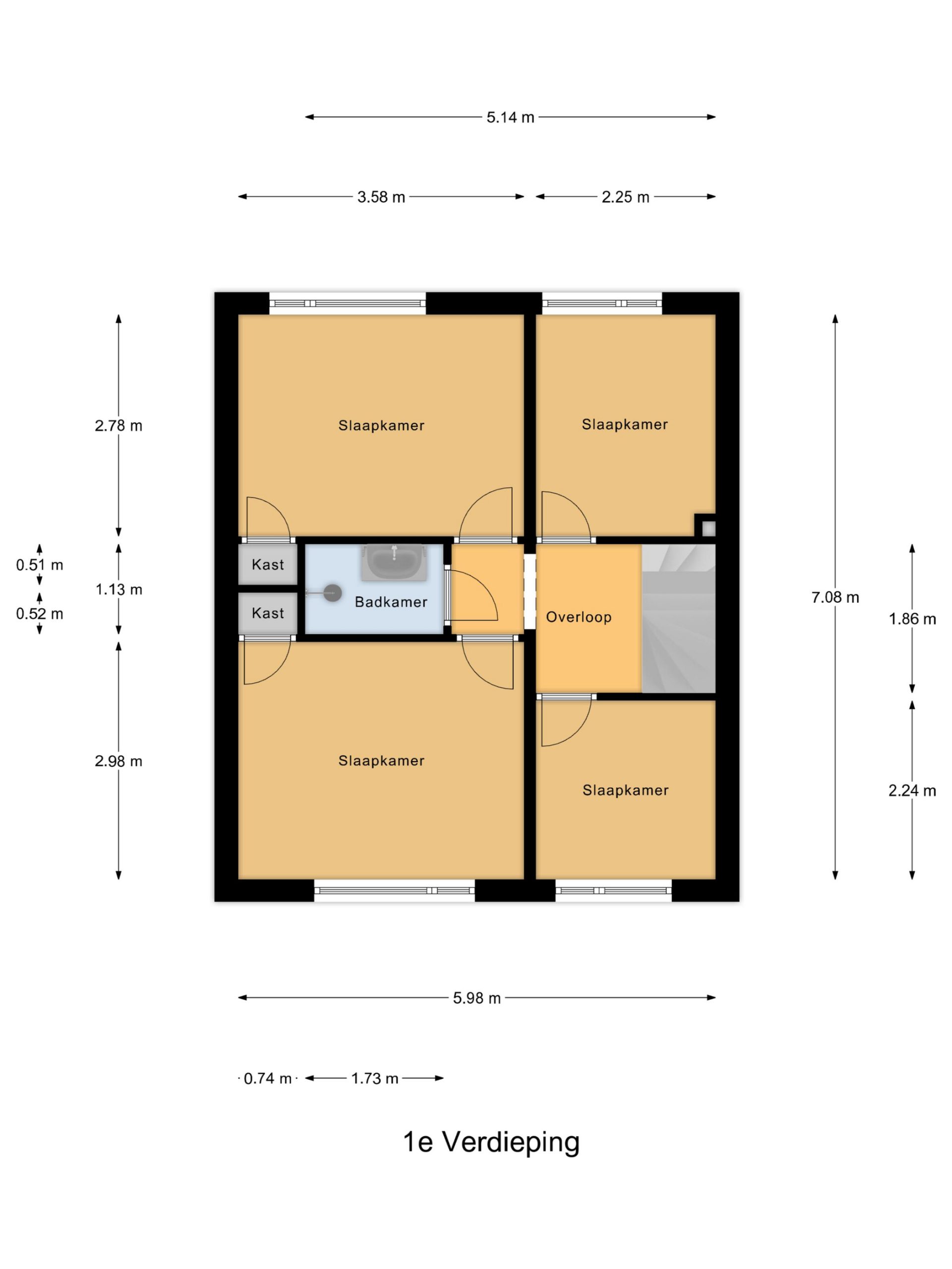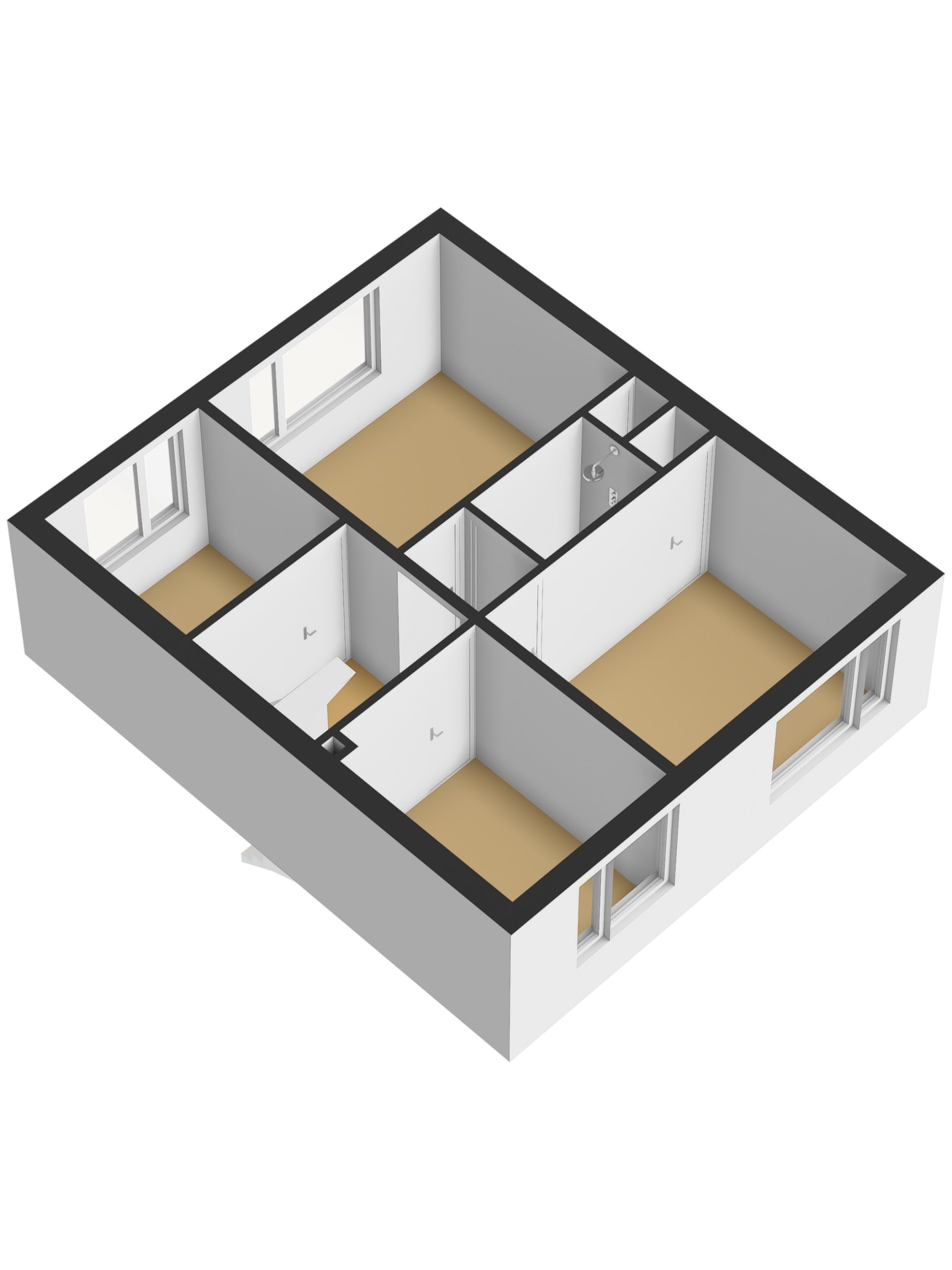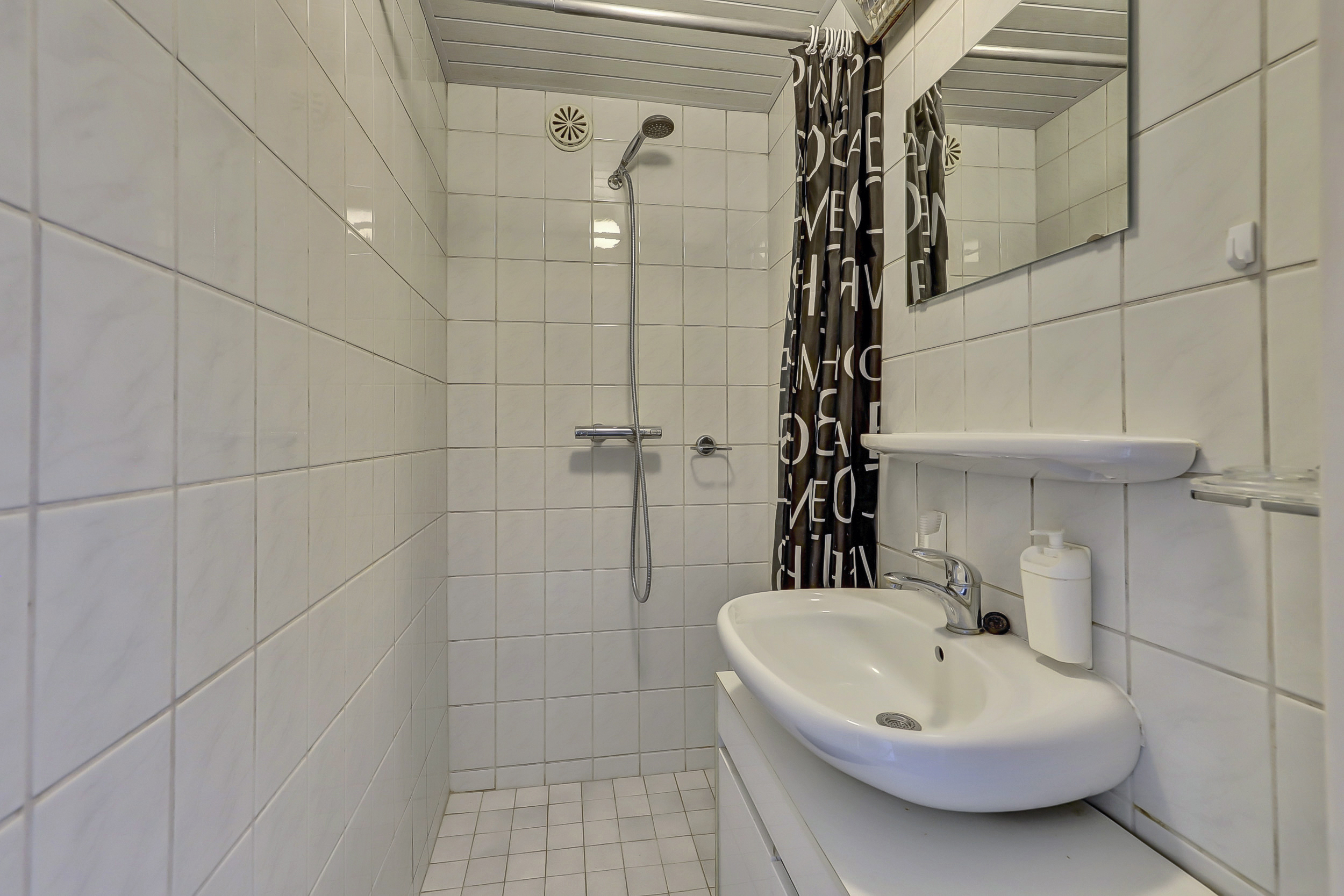 Op de eerste verdieping bevinden zich, naast de compacte badkamer met wastafel en inloopdouche, vier slaapkamers. Alle kamers zijn goed van formaat en flexibel in te delen. Omdat de badkamer compact is en de woning over voldoende slaapkamers beschikt, wordt er soms voor gekozen de badkamer te verplaatsen of één slaapkamer bij de badkamer te betrekken. Op deze manier kan een royale badkamer worden gerealiseerd.