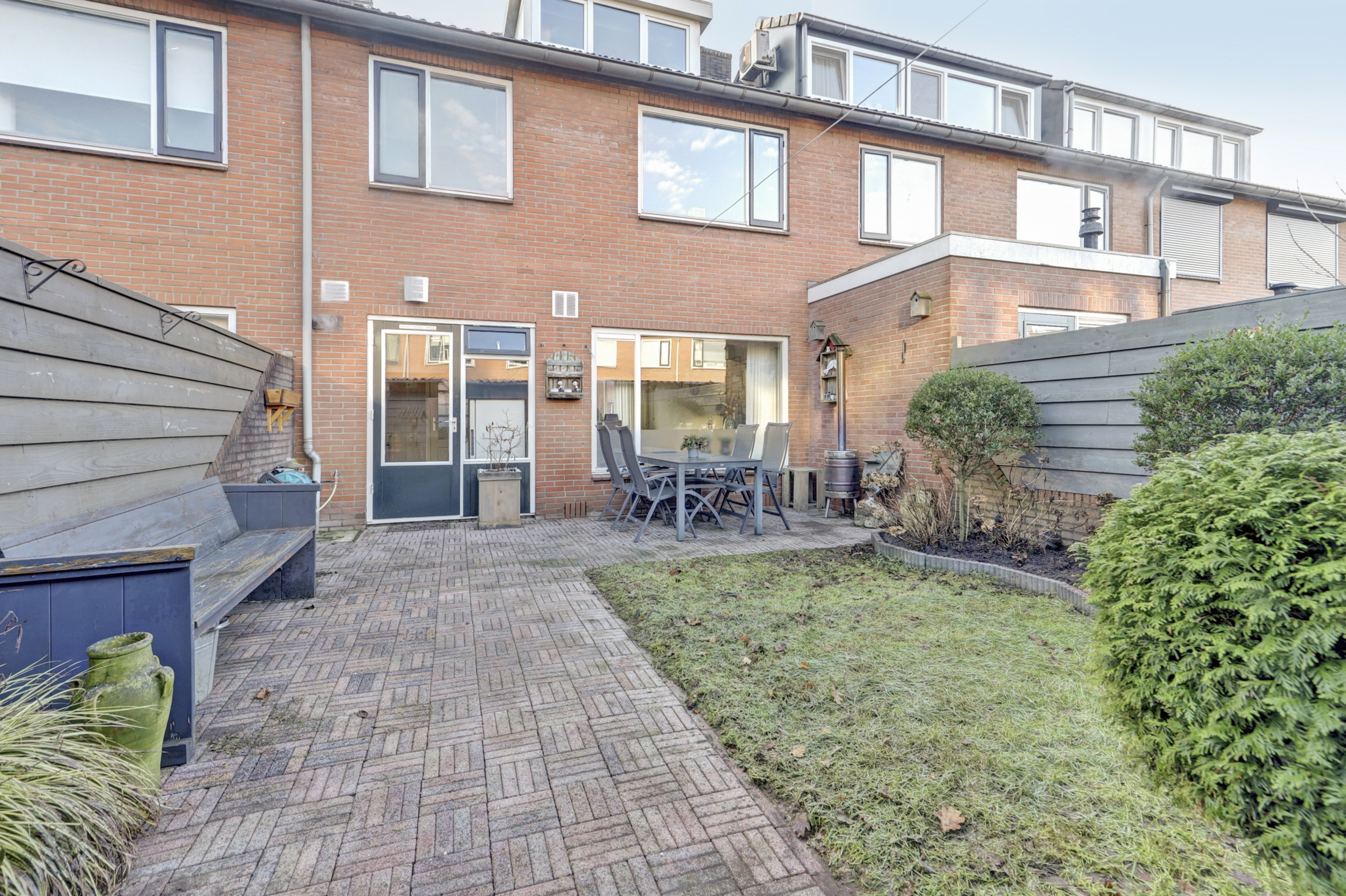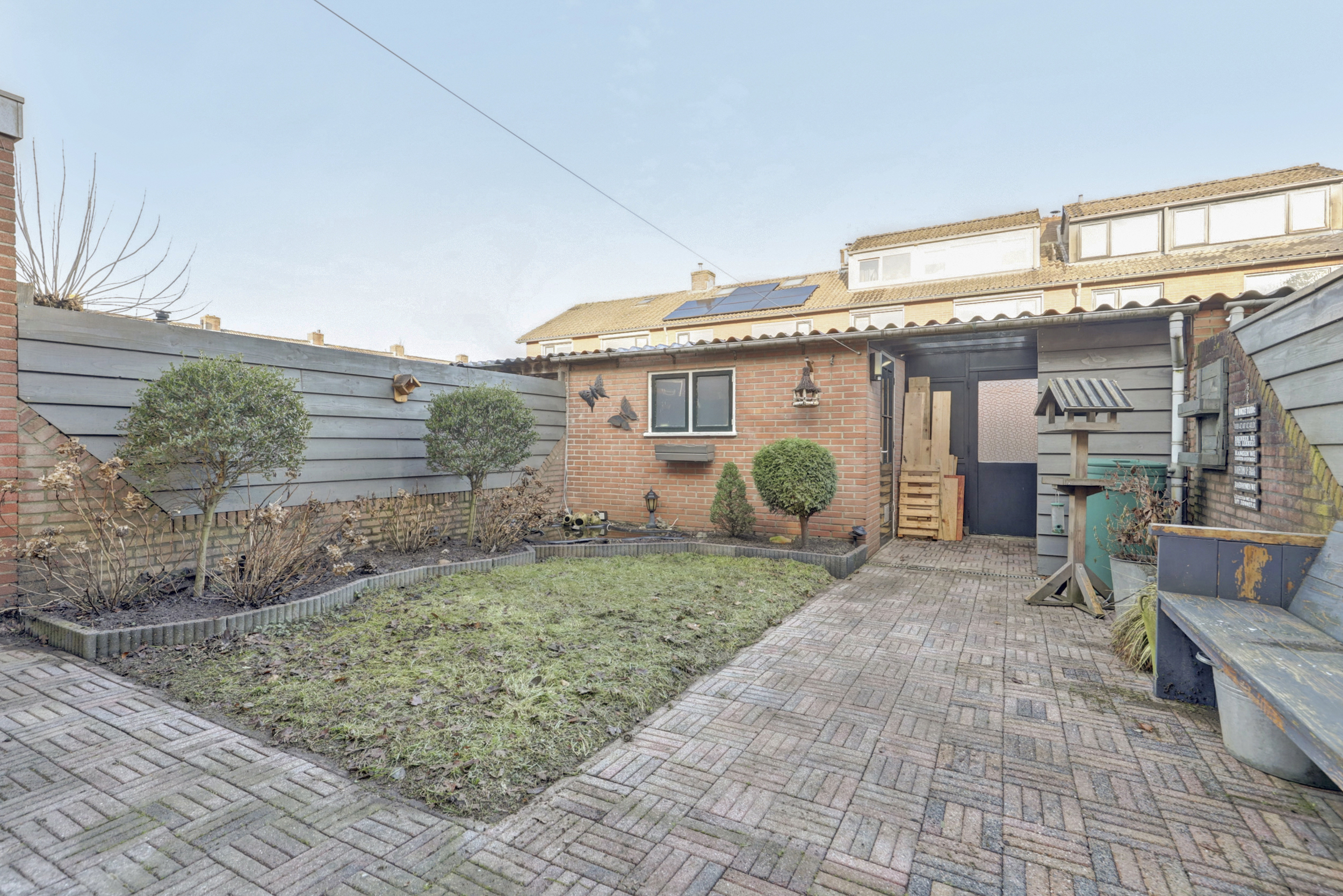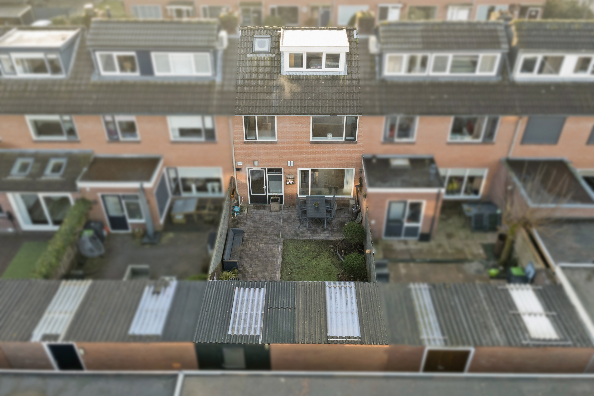 De achtertuin ligt op het noorden en biedt een fijne plek om buiten te zitten en te genieten van het buitenleven. Achterin bevindt zich een stenen berging en een praktische overkapping, ideaal voor het stallen van fietsen of tuingereedschap. Iets verderop in de buurt ligt een groot grasveld met speeltoestellen, een heerlijke plek waar kinderen veilig samen met vriendjes kunnen spelen.