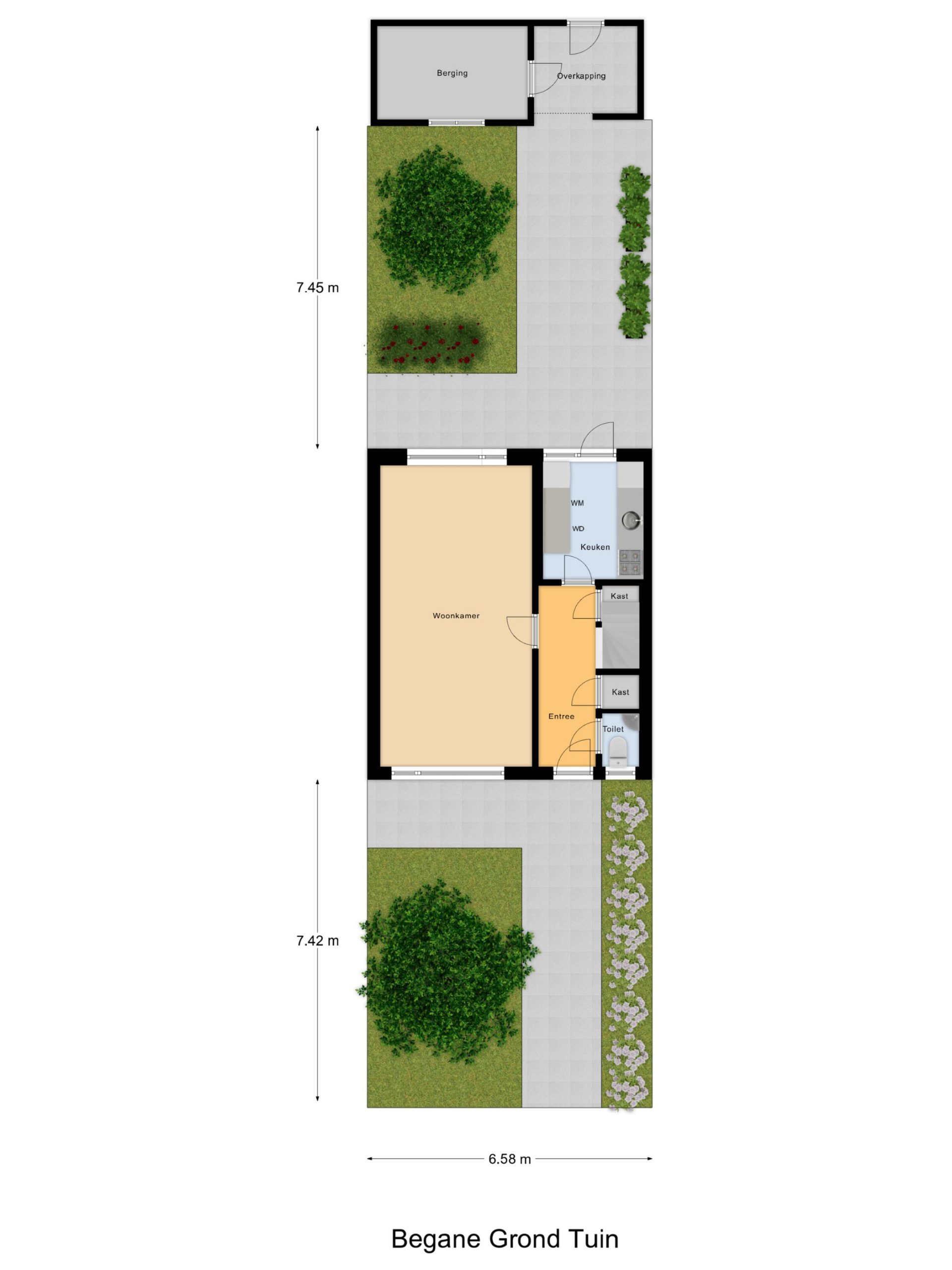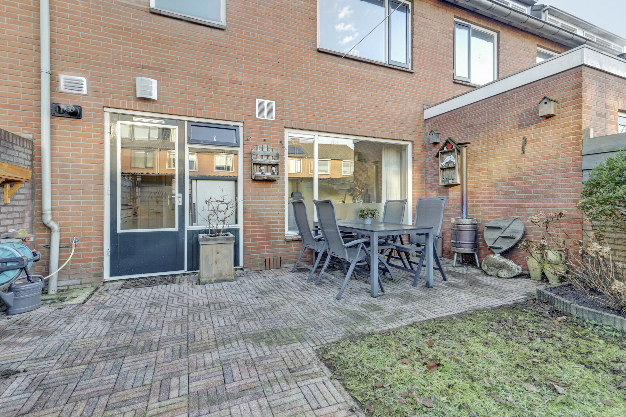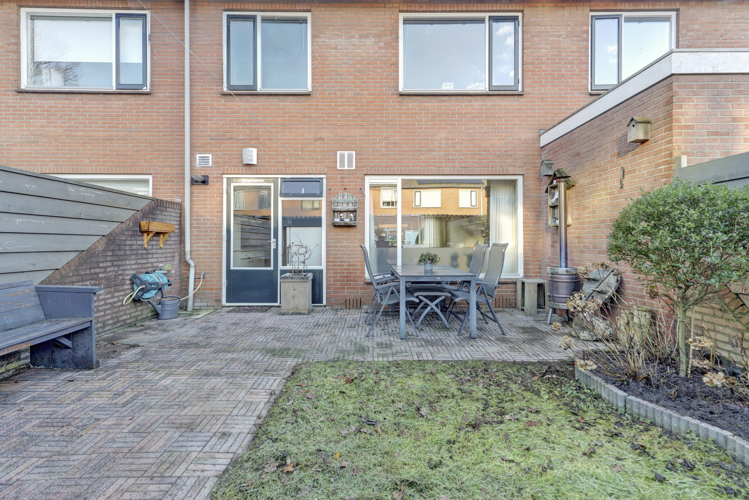 De achtertuin ligt op het noorden en biedt een fijne plek om buiten te zitten en te genieten van het buitenleven. Achterin bevindt zich een stenen berging en een praktische overkapping, ideaal voor het stallen van fietsen of tuingereedschap. Iets verderop in de buurt ligt een groot grasveld met speeltoestellen, een heerlijke plek waar kinderen veilig samen met vriendjes kunnen spelen.