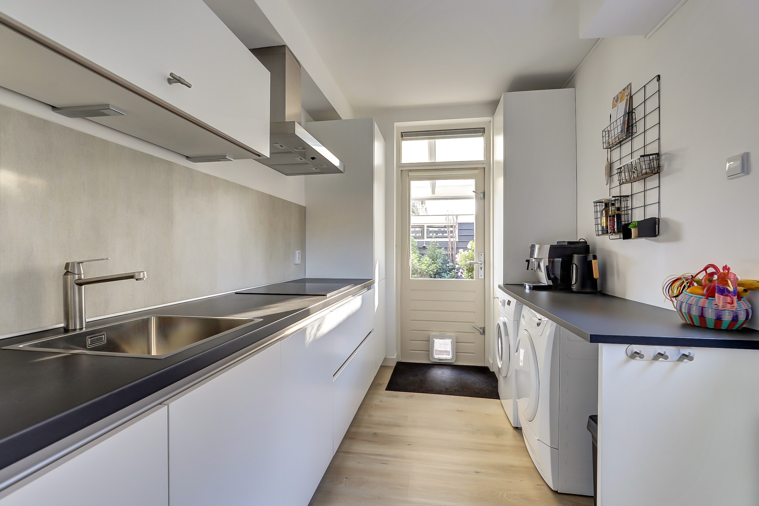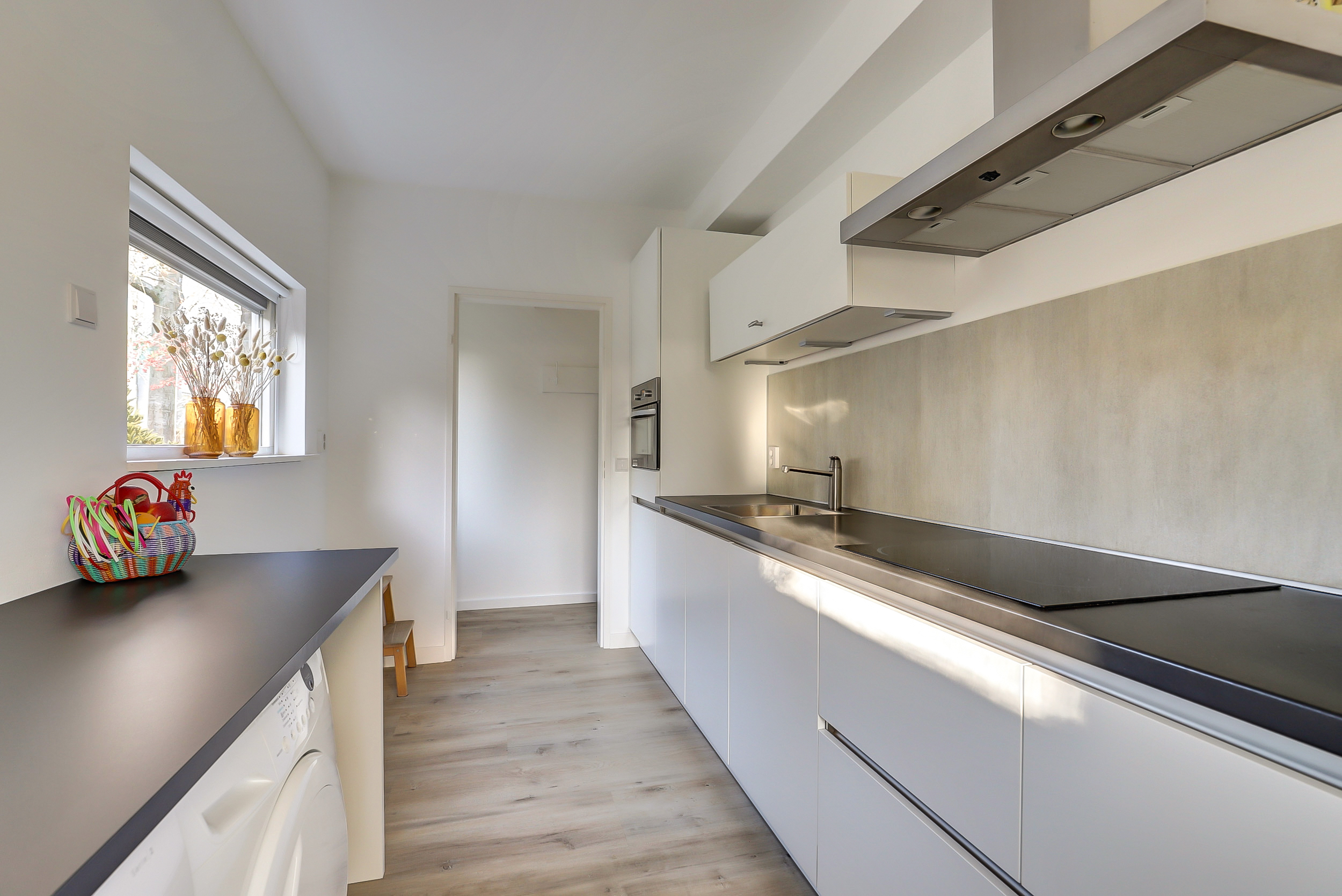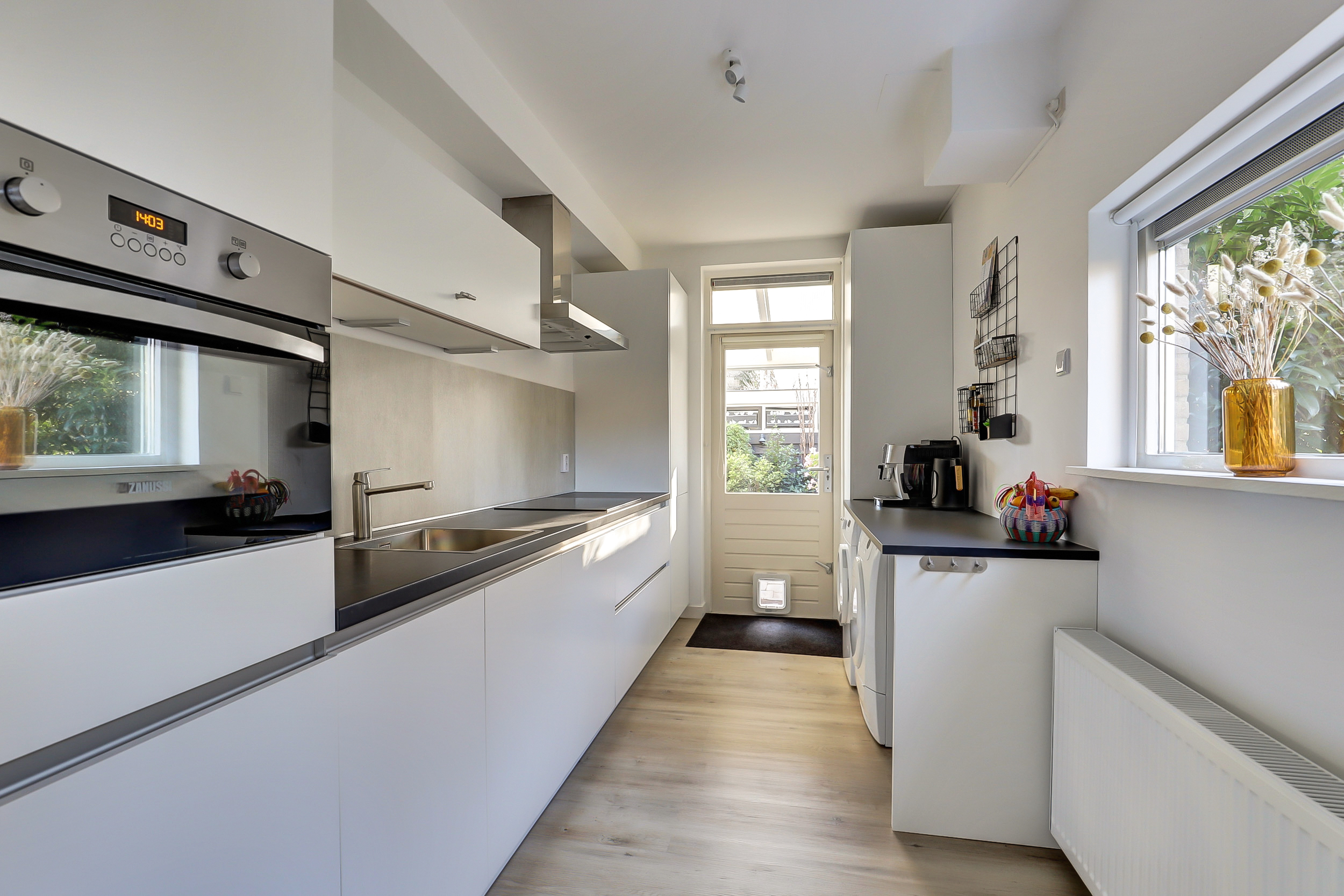 De keuken heeft een lichte kleurstelling en is voorzien van diverse inbouwapparatuur, waardoor de keuken modern en praktisch in gebruik is.