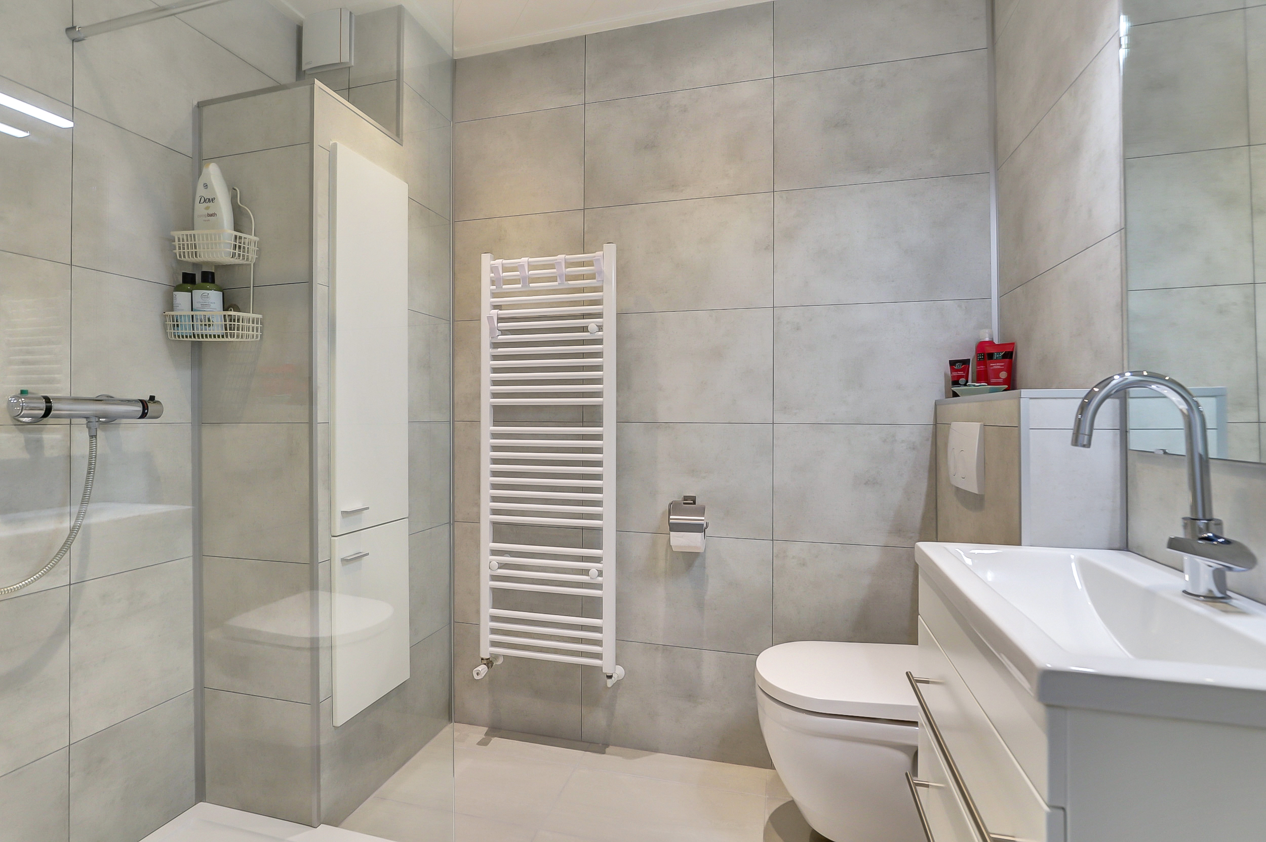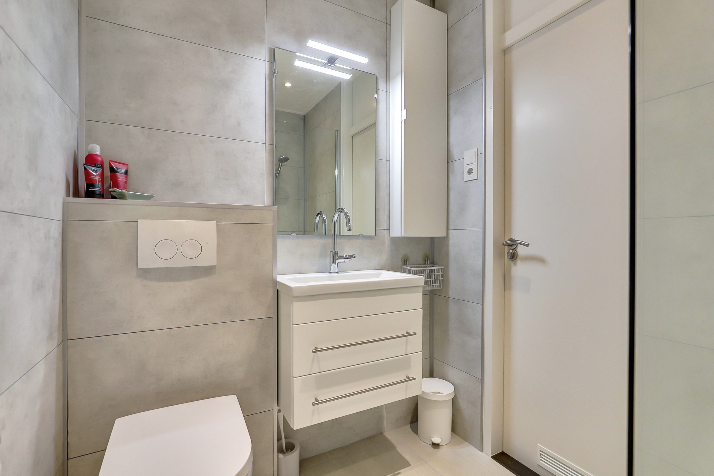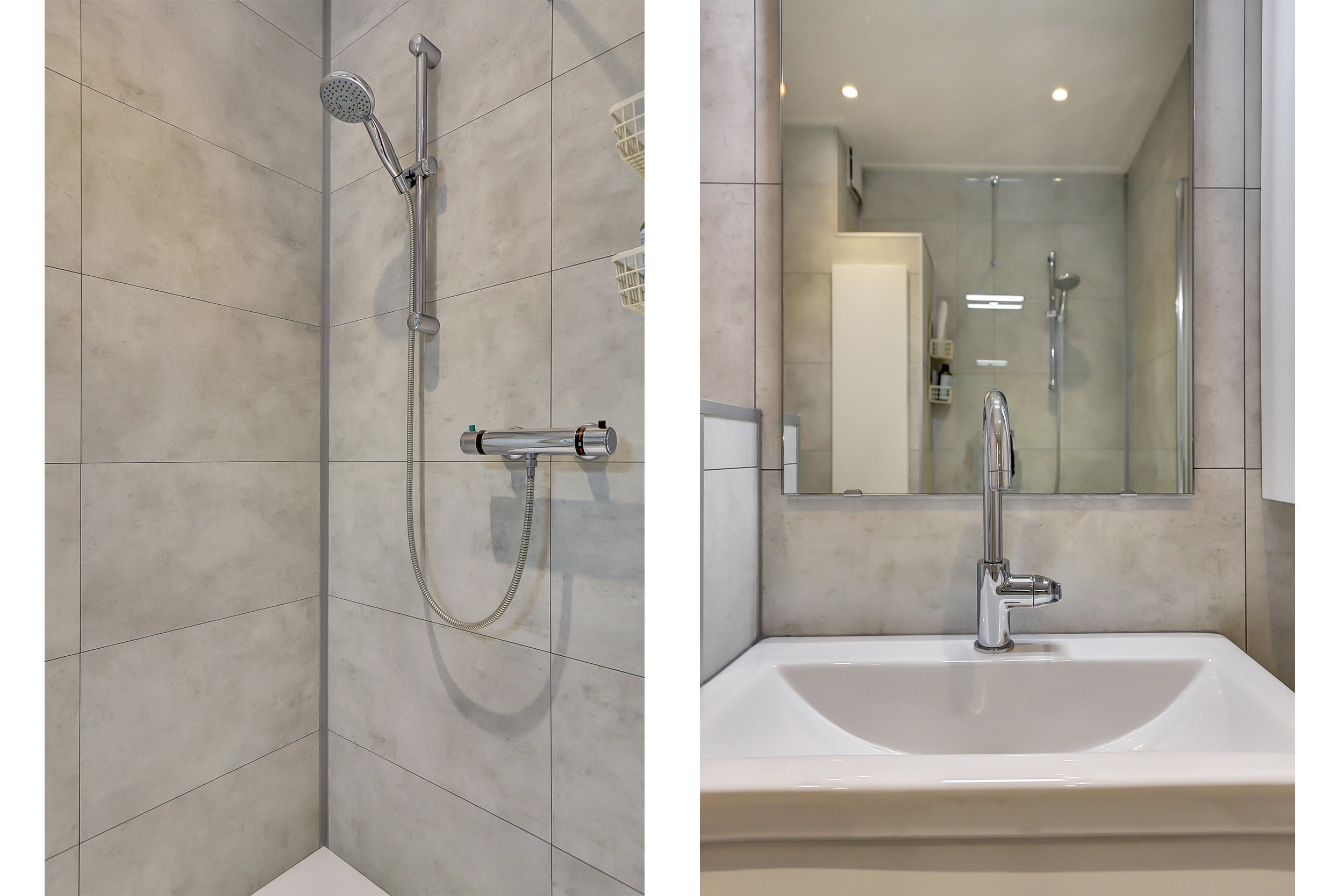 Aan de achterzijde van het appartement liggen de twee slaapkamers. De stijlvolle badkamer is drie jaar geleden vernieuwd en voorzien van een douche, wastafelmeubel en toilet.
