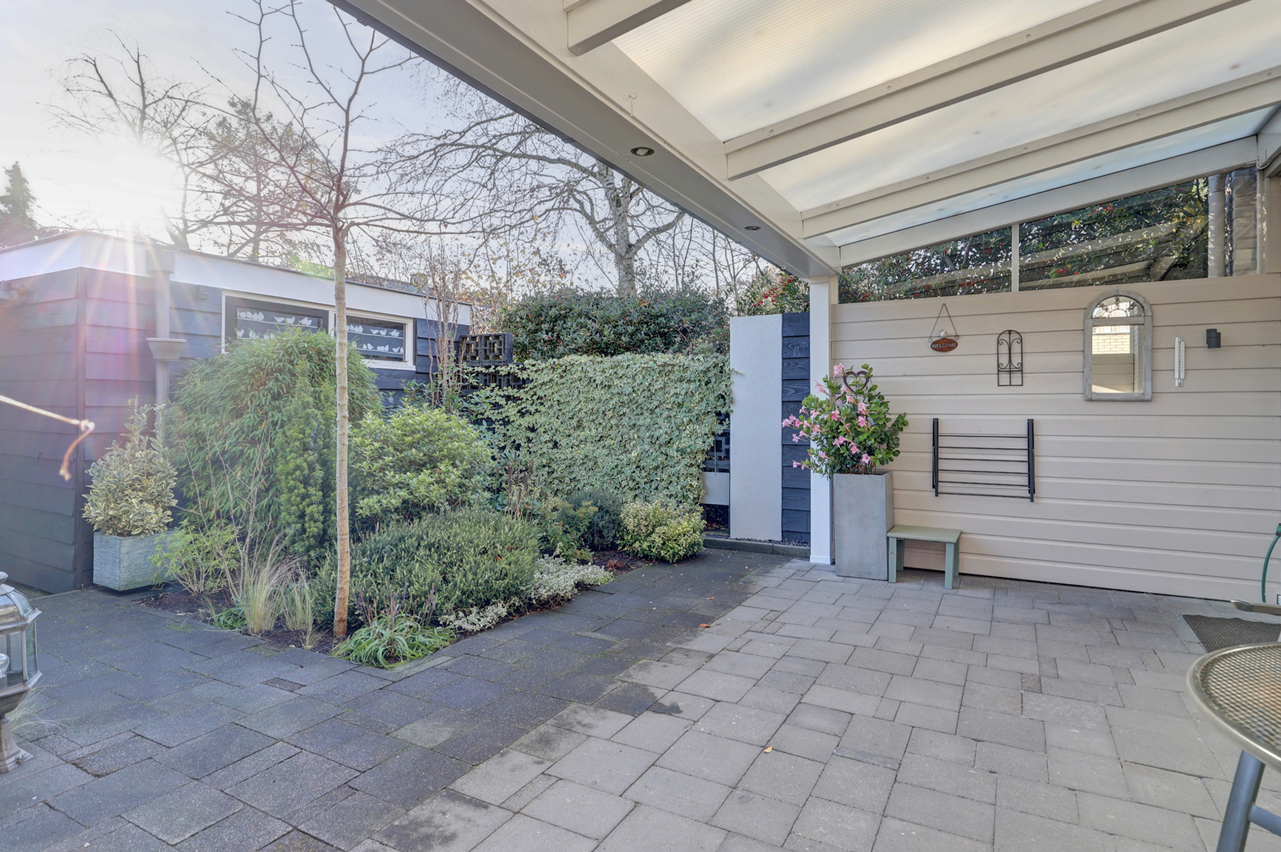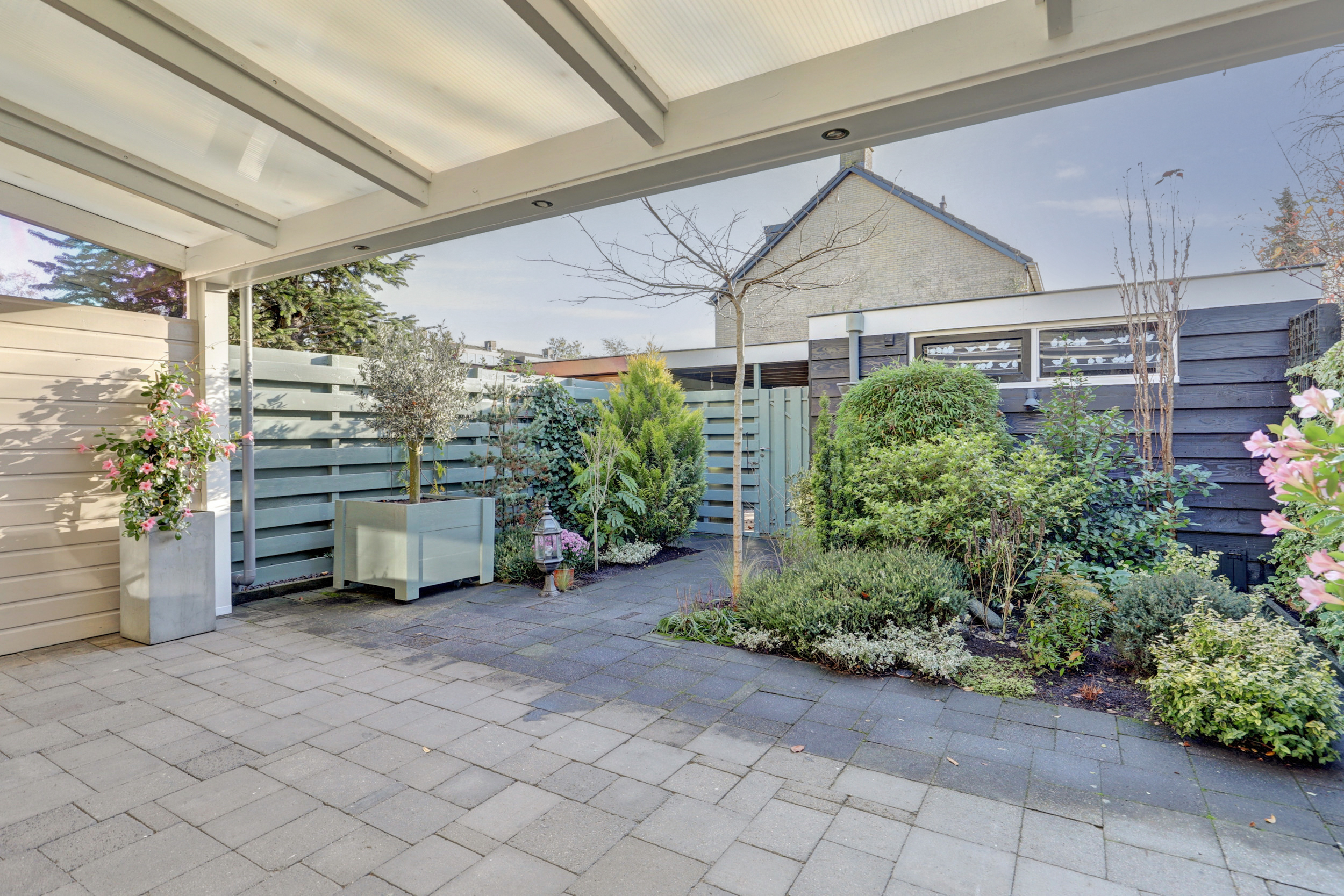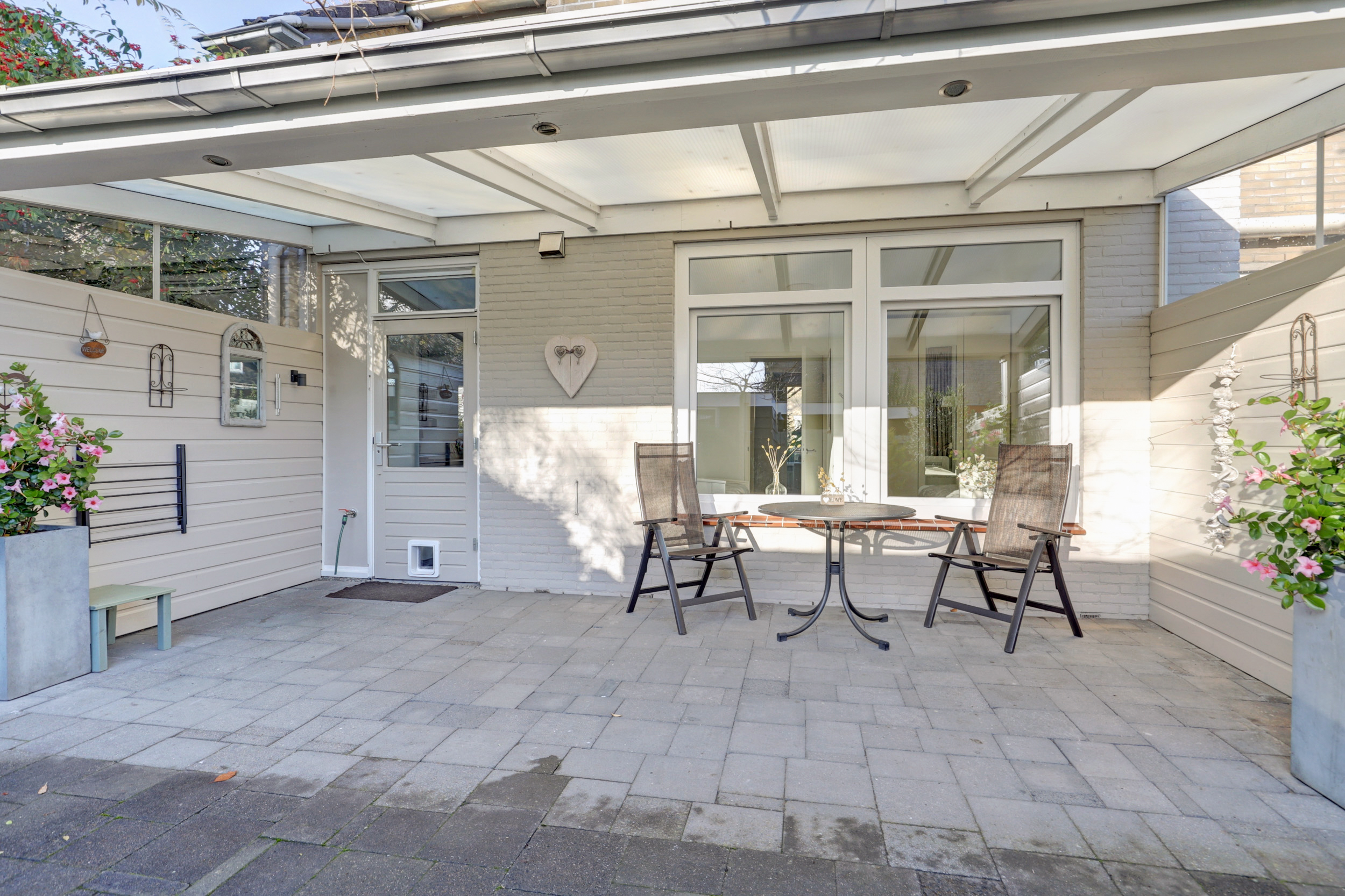 In de tuin is een fijne overkapping aanwezig, ideaal om ook bij minder mooi weer buiten te kunnen zitten. Daarnaast beschikt het appartement over een ruime berging en een carport op eigen terrein.