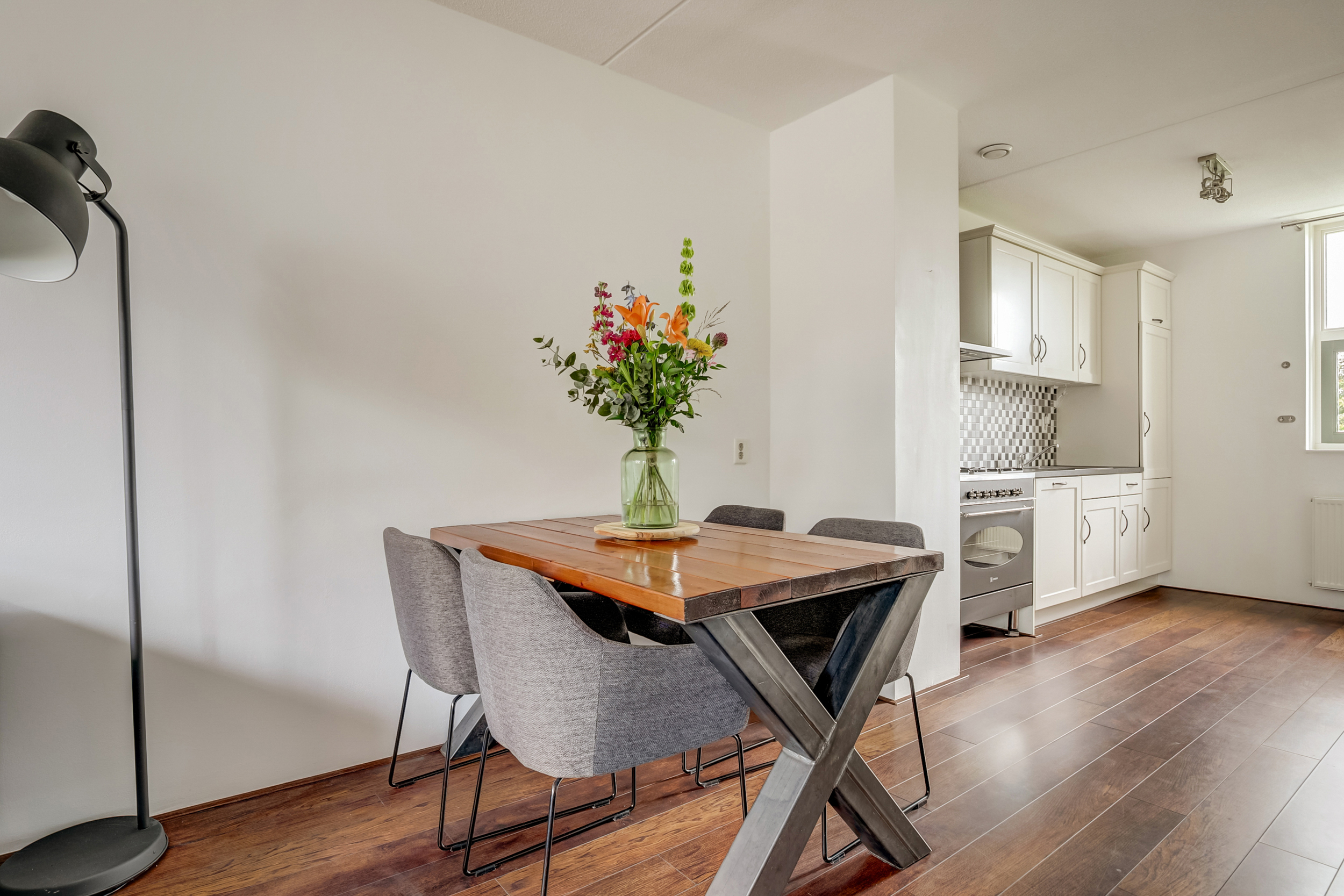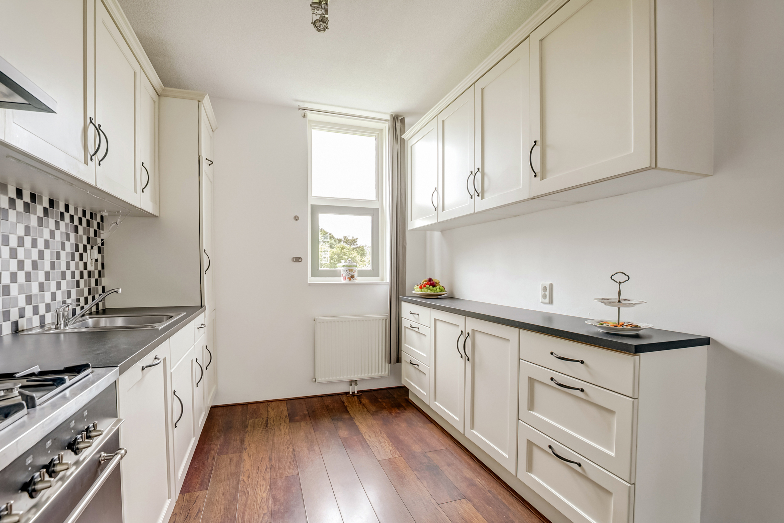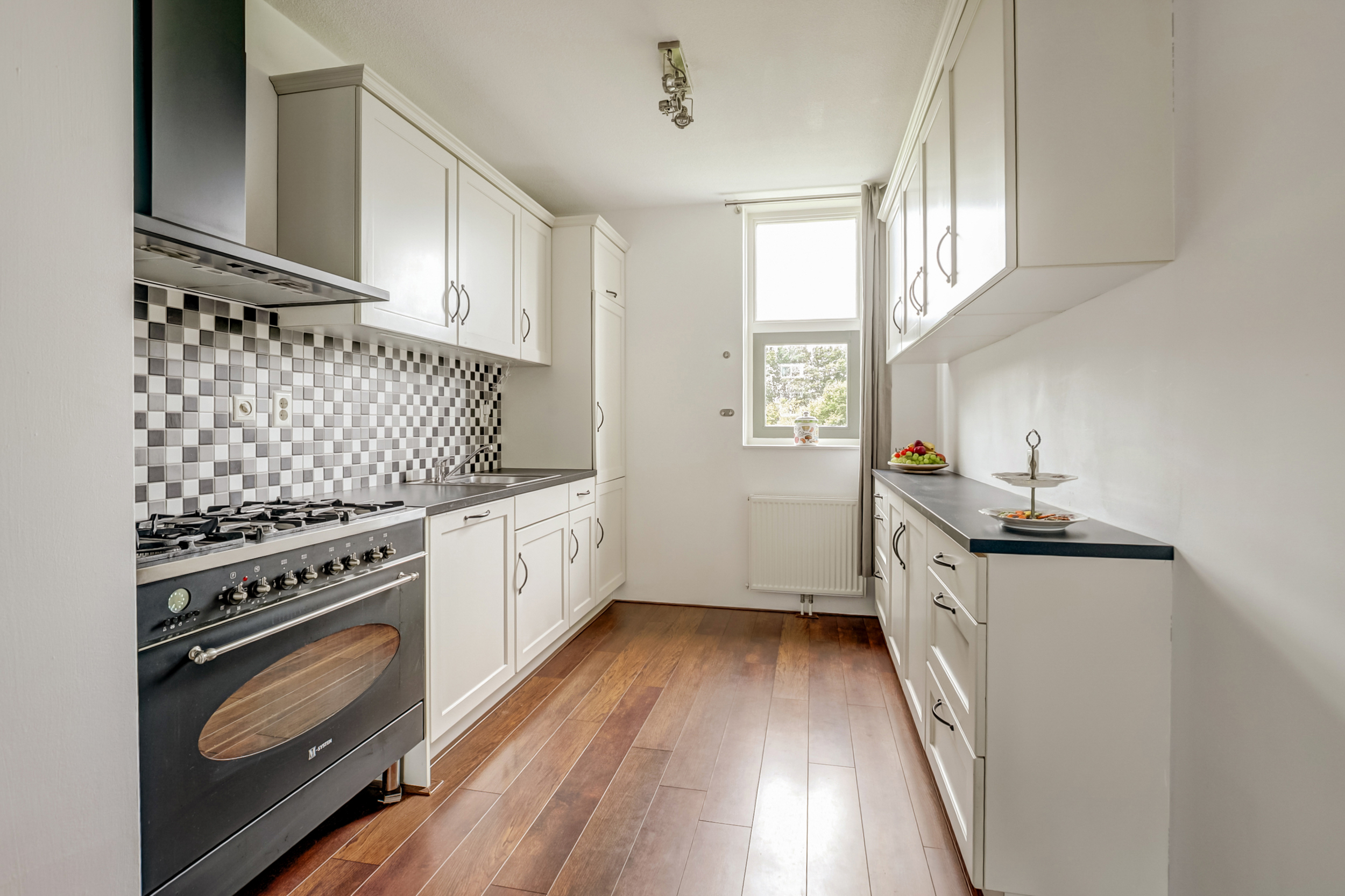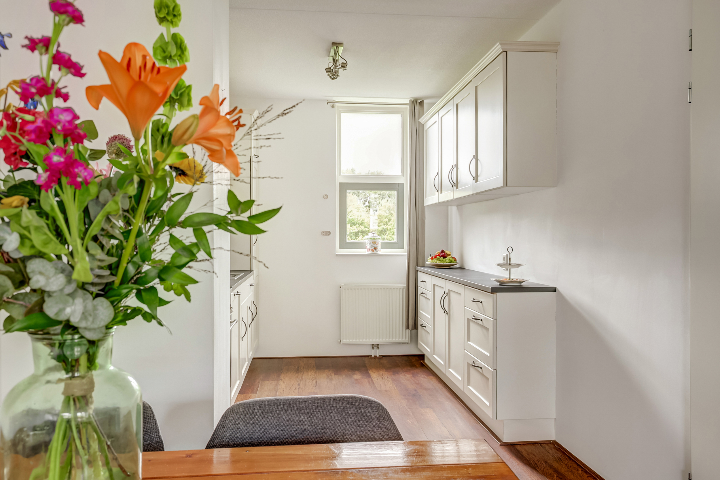 Op de eerste verdieping in de hal bevindt zich de toiletruimte met toilet en fonteintje. De lichte woonkamer is voorzien van een laminaatvloer en heeft een deur naar het terras (circa 15 m²) Dit balkon biedt ruimte voor een aantal plantenbakken en een ruime tuinset. Daarnaast biedt het voldoende privacy. Vanaf het terras is er een fraai uitzicht over de groene binnenplaats. De lichte, open keuken is ivoorzien van een uitgebreide inrichting in een neutrale kleurstelling. Het beschikt over een groot fornuis met afzuigkap en ingebouwd zijn een koel-/vriescombinatie en een vaatwasser. Daarbij beschikt de keuken over een enorme hoeveelheid opbergruimte.