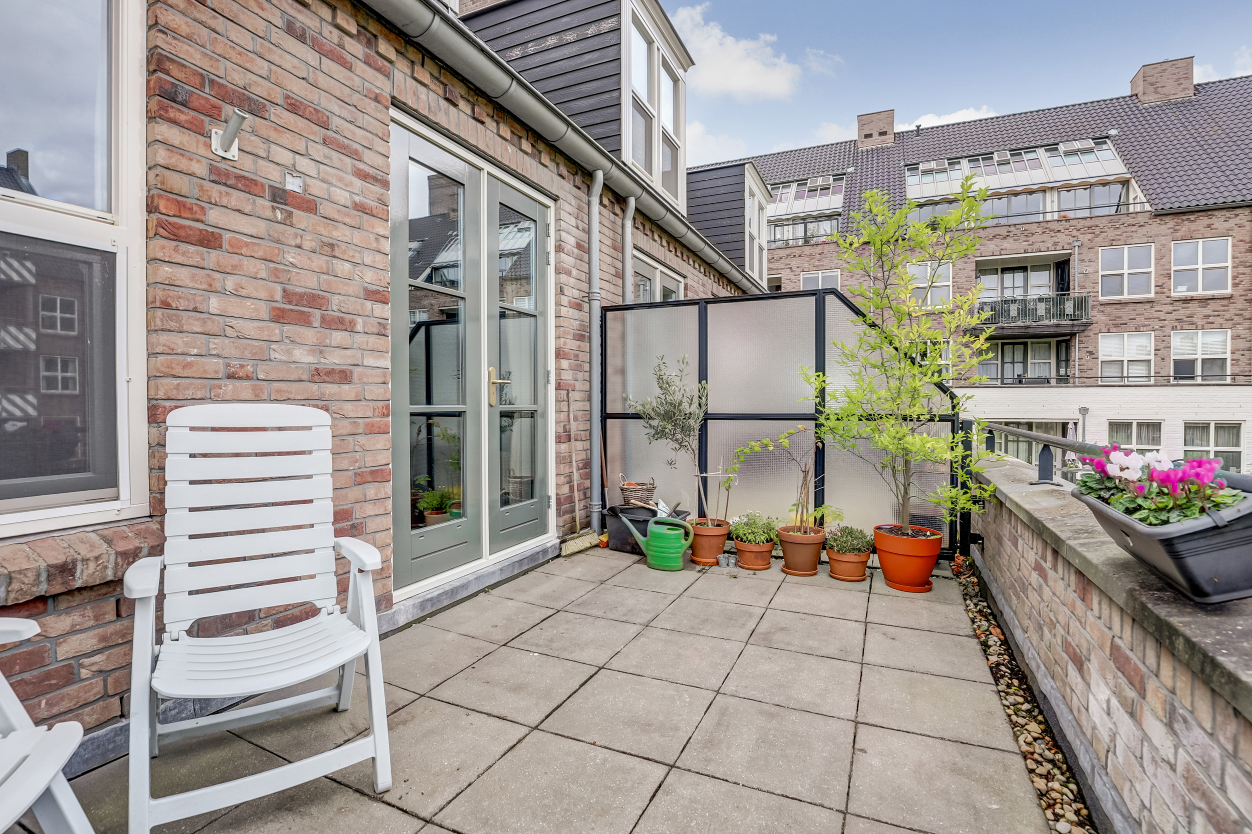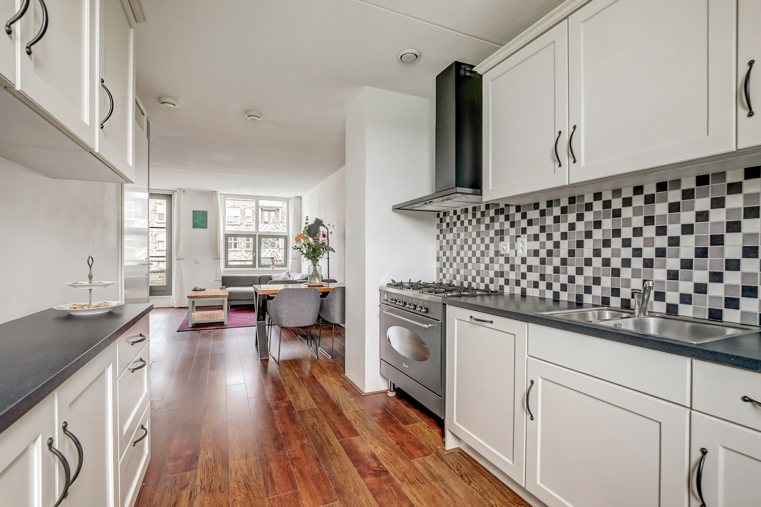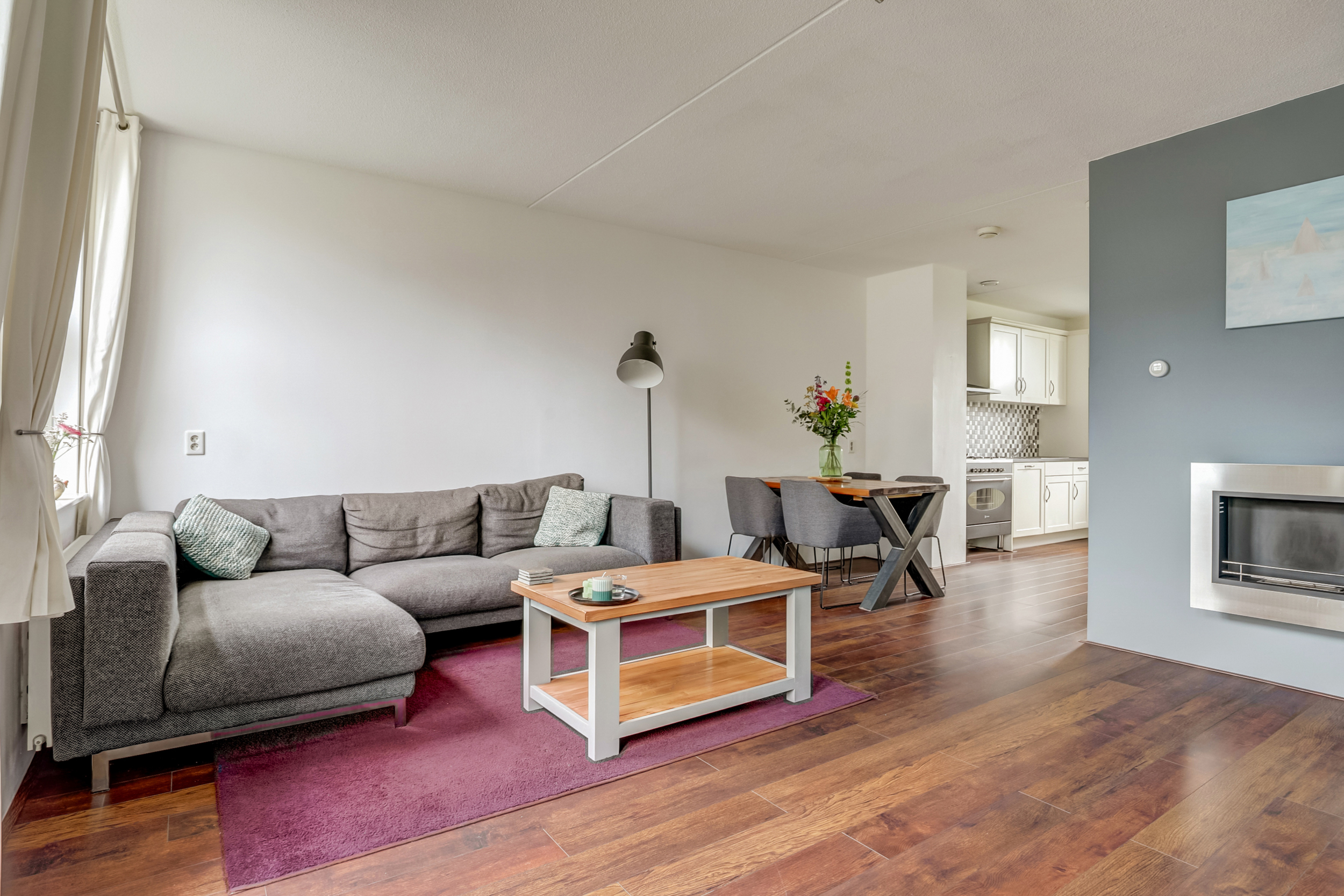 Op de eerste verdieping in de hal bevindt zich de toiletruimte met toilet en fonteintje. De lichte woonkamer is voorzien van een laminaatvloer en heeft een deur naar het terras (circa 15 m²) Dit balkon biedt ruimte voor een aantal plantenbakken en een ruime tuinset. Daarnaast biedt het voldoende privacy. Vanaf het terras is er een fraai uitzicht over de groene binnenplaats. De lichte, open keuken is ivoorzien van een uitgebreide inrichting in een neutrale kleurstelling. Het beschikt over een groot fornuis met afzuigkap en ingebouwd zijn een koel-/vriescombinatie en een vaatwasser. Daarbij beschikt de keuken over een enorme hoeveelheid opbergruimte.