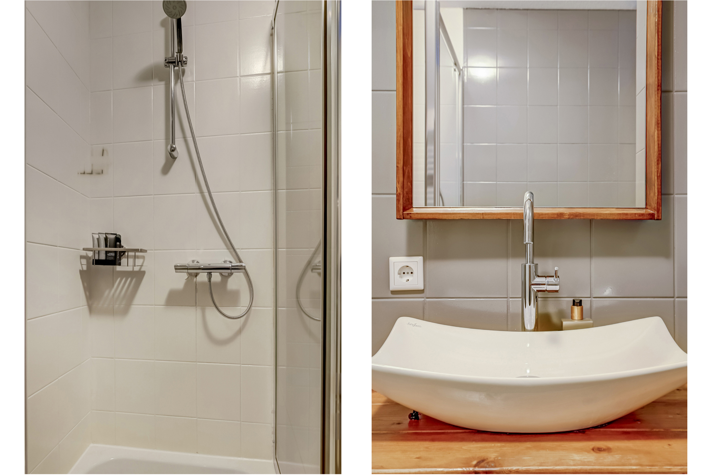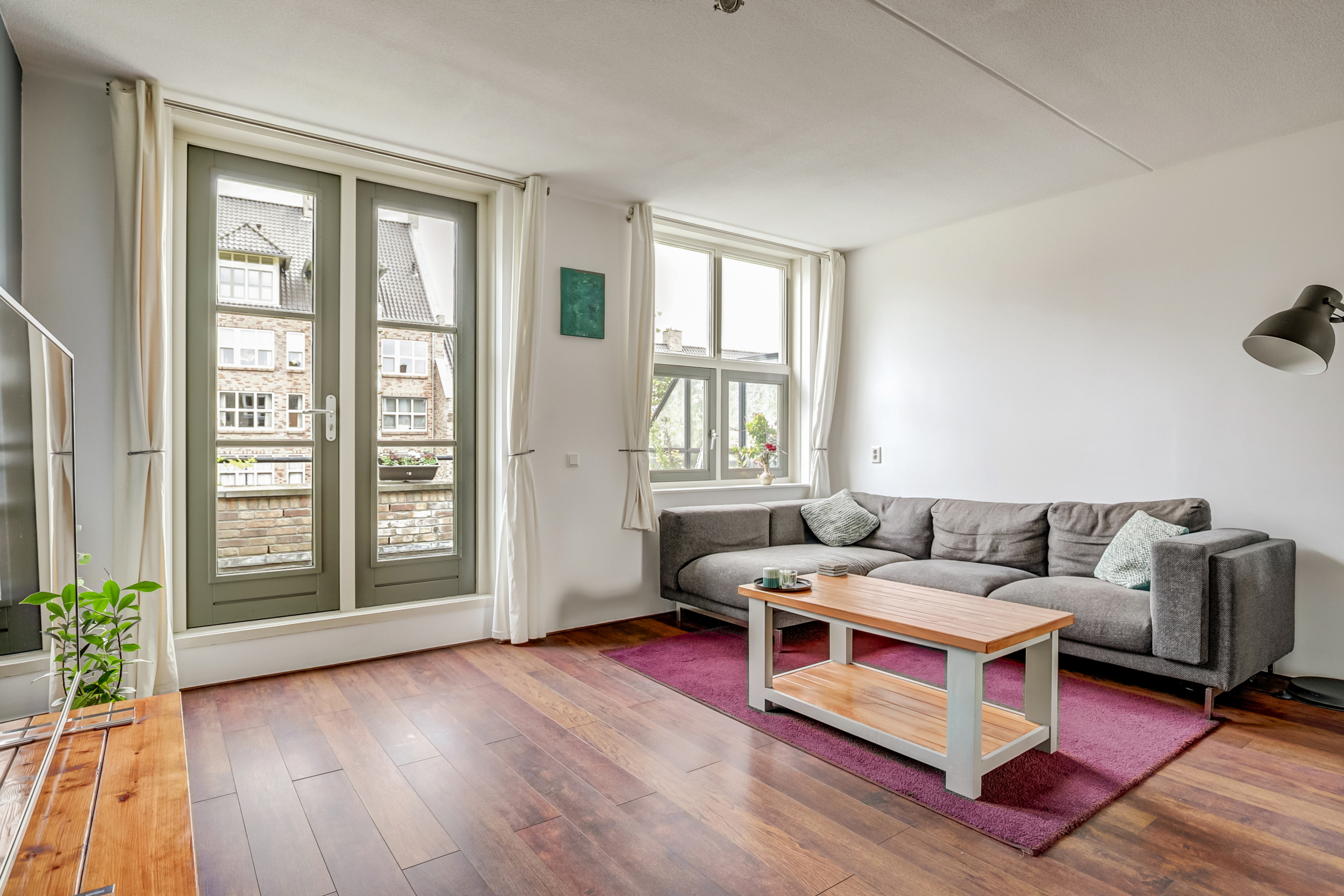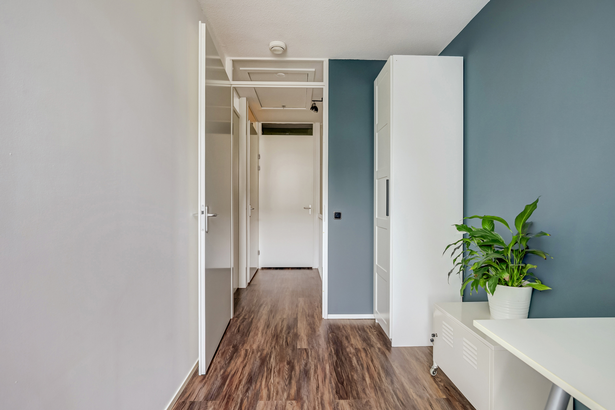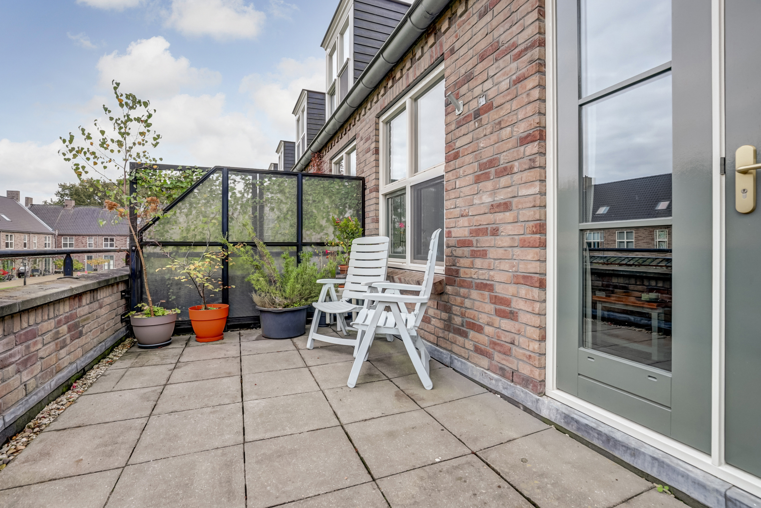 Op de eerste verdieping in de hal bevindt zich de toiletruimte met toilet en fonteintje. De lichte woonkamer is voorzien van een laminaatvloer en heeft een deur naar het terras (circa 15 m²) Dit balkon biedt ruimte voor een aantal plantenbakken en een ruime tuinset. Daarnaast biedt het voldoende privacy. Vanaf het terras is er een fraai uitzicht over de groene binnenplaats. De lichte, open keuken is ivoorzien van een uitgebreide inrichting in een neutrale kleurstelling. Het beschikt over een groot fornuis met afzuigkap en ingebouwd zijn een koel-/vriescombinatie en een vaatwasser. Daarbij beschikt de keuken over een enorme hoeveelheid opbergruimte.