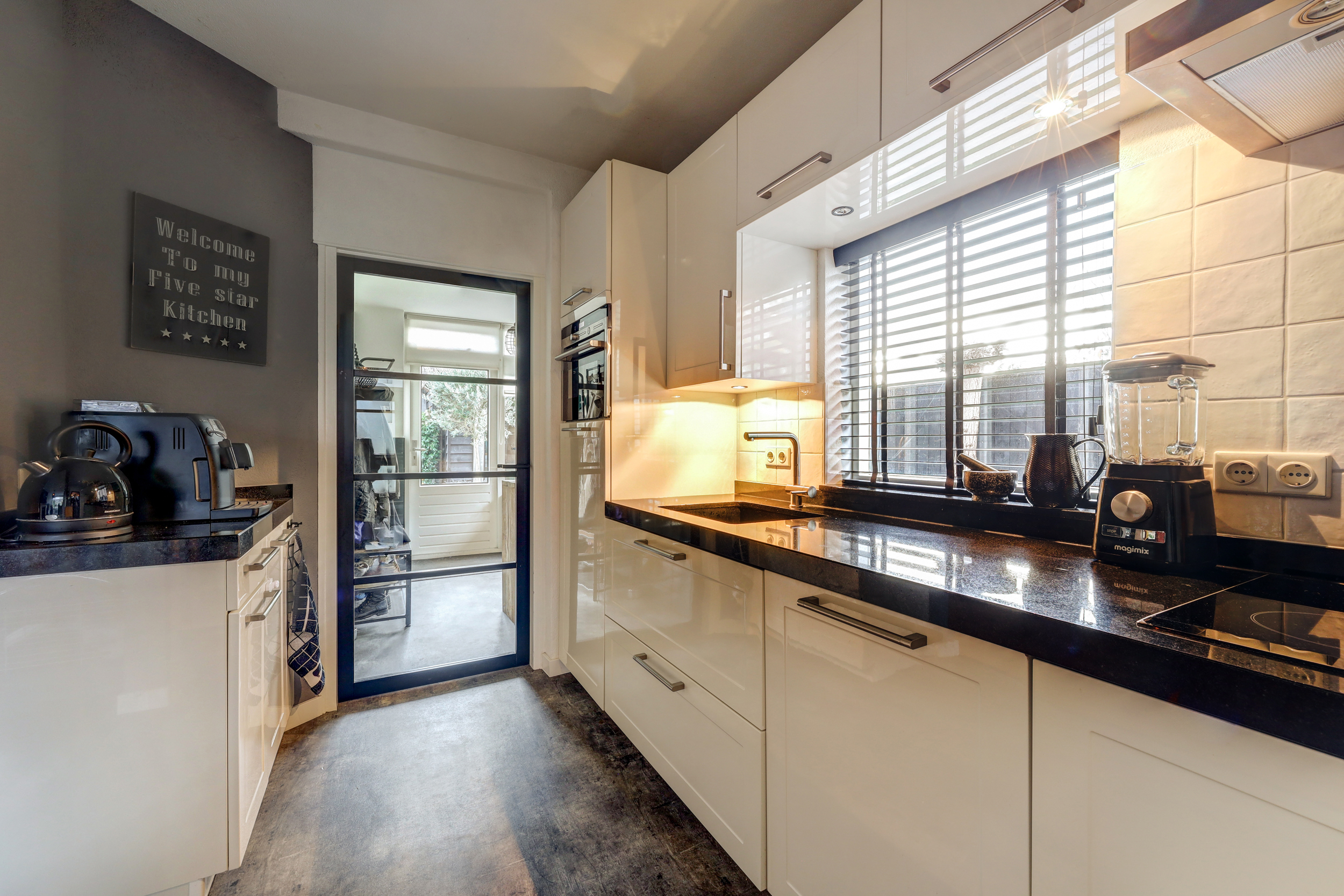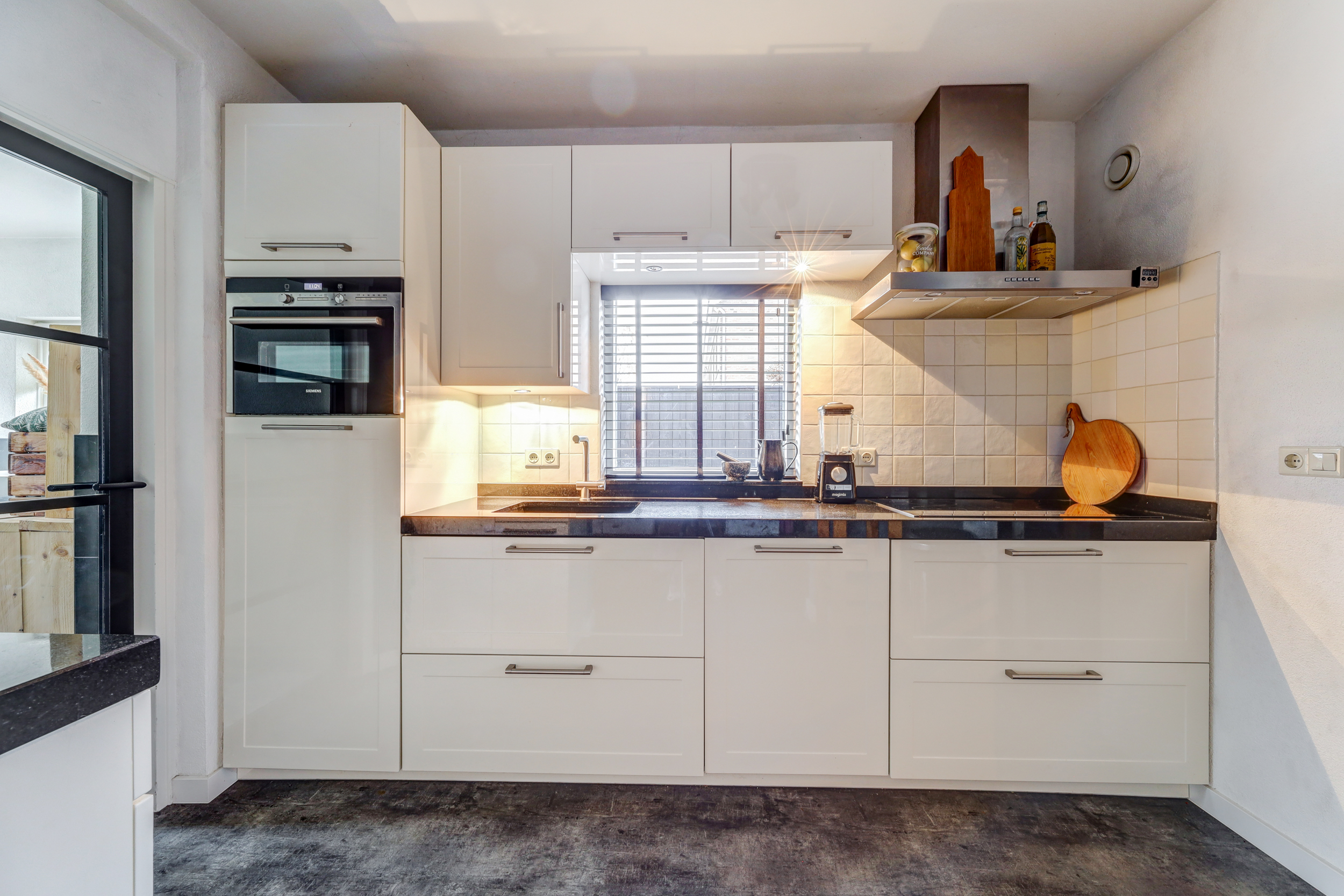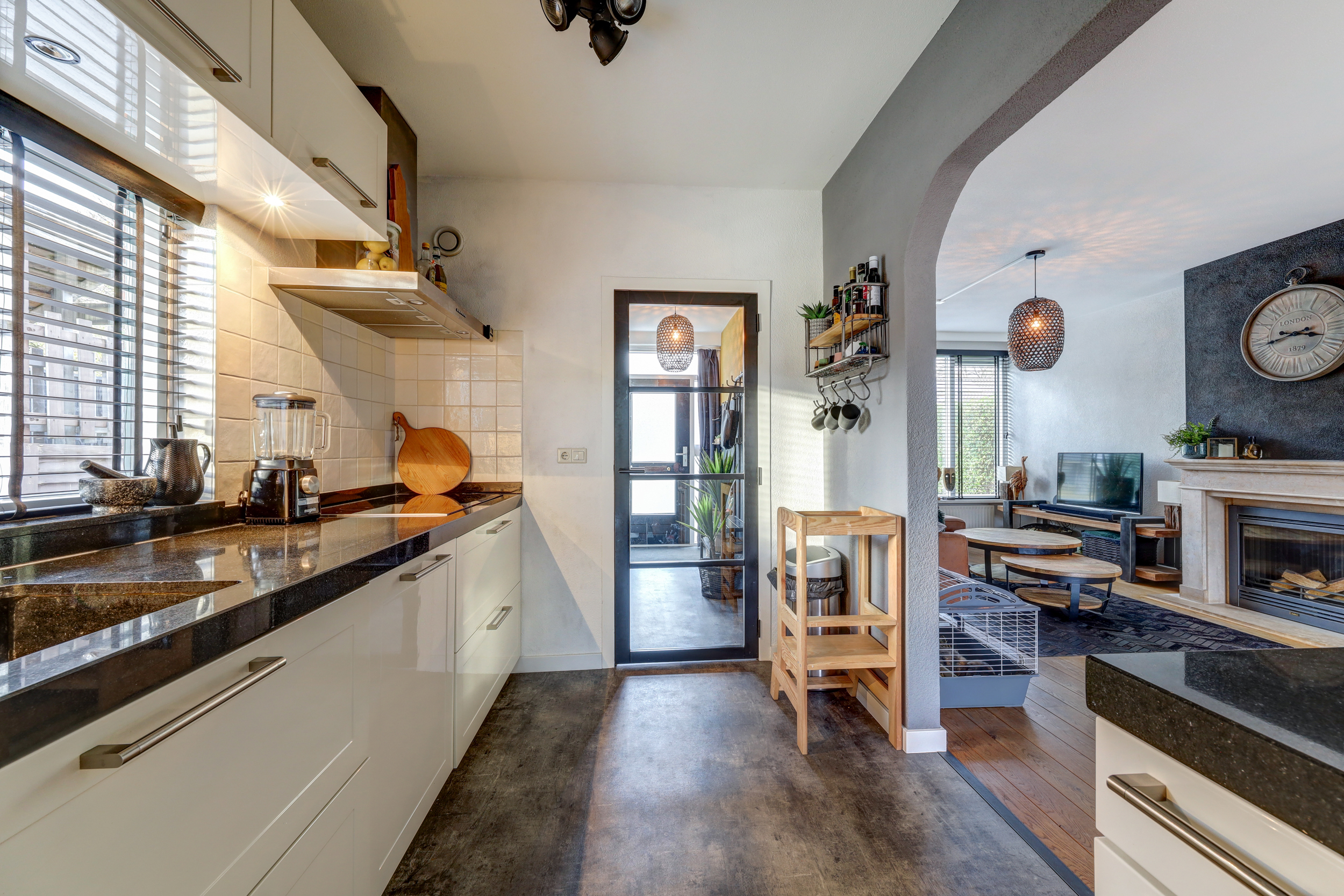 De keuken sluit logisch aan op de woonkamer en is voorzien van een nette, lichte inbouwkeuken met alle gewenste apparatuur. Direct daarnaast ligt de bijkeuken, een ruimte die je al snel gaat waarderen. Hier kun je de wasmachine kwijt, extra voorraad of schoonmaakspullen. Ook biedt deze ruimte de doorgang naar de tuin.