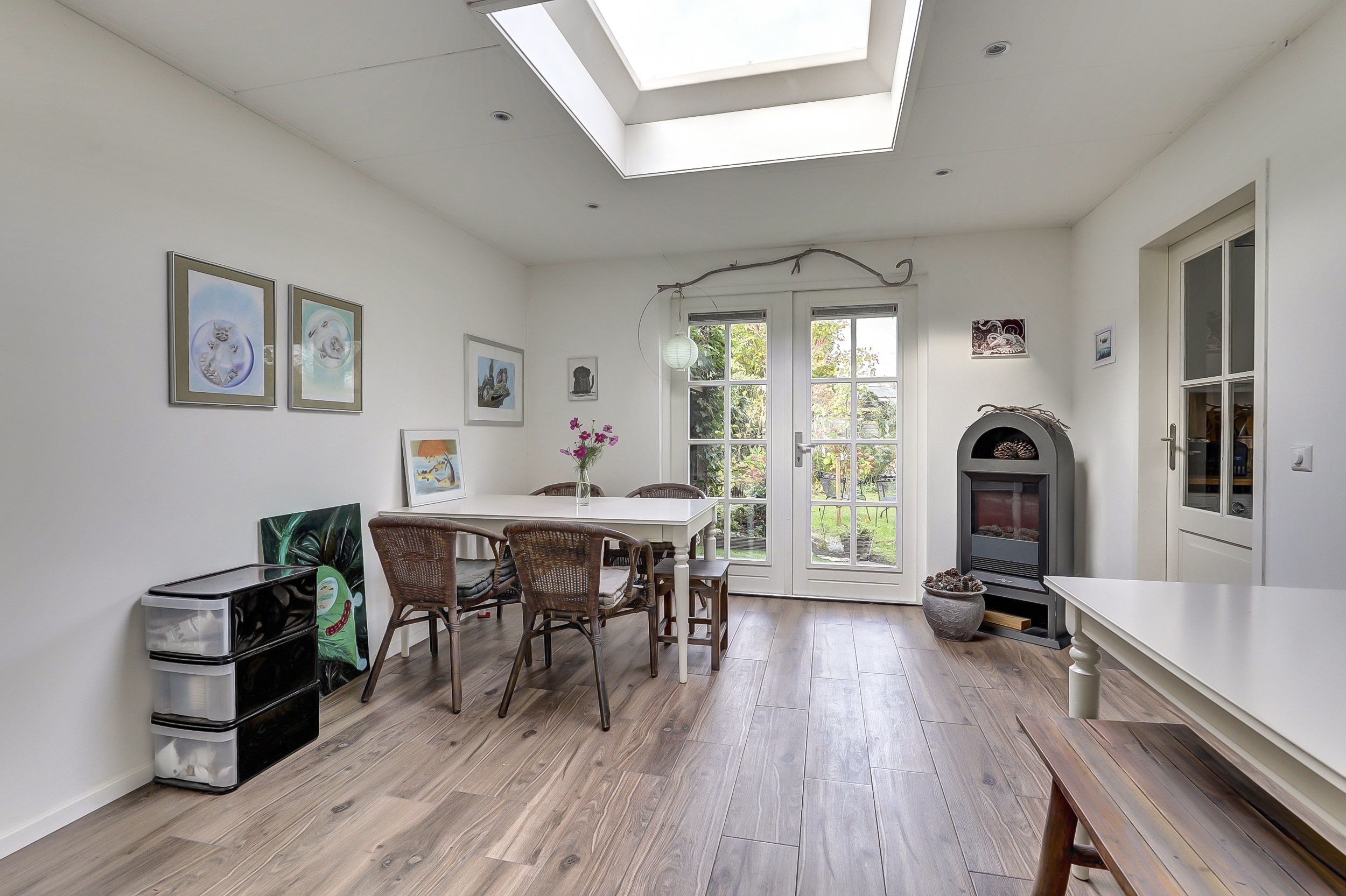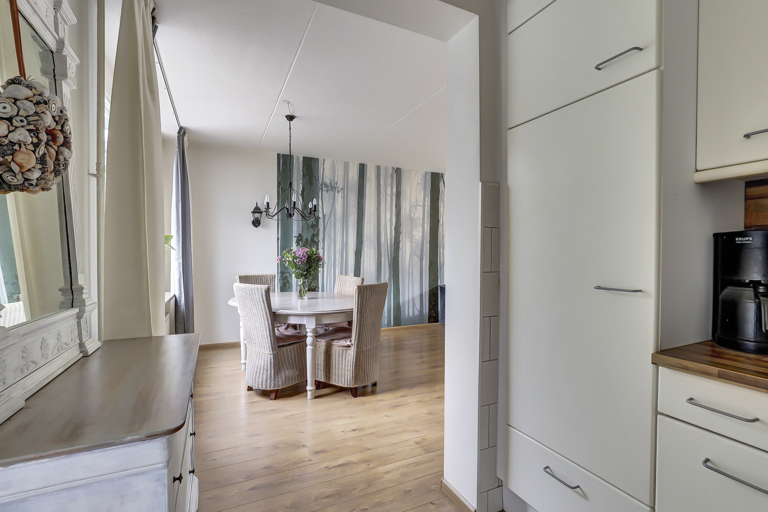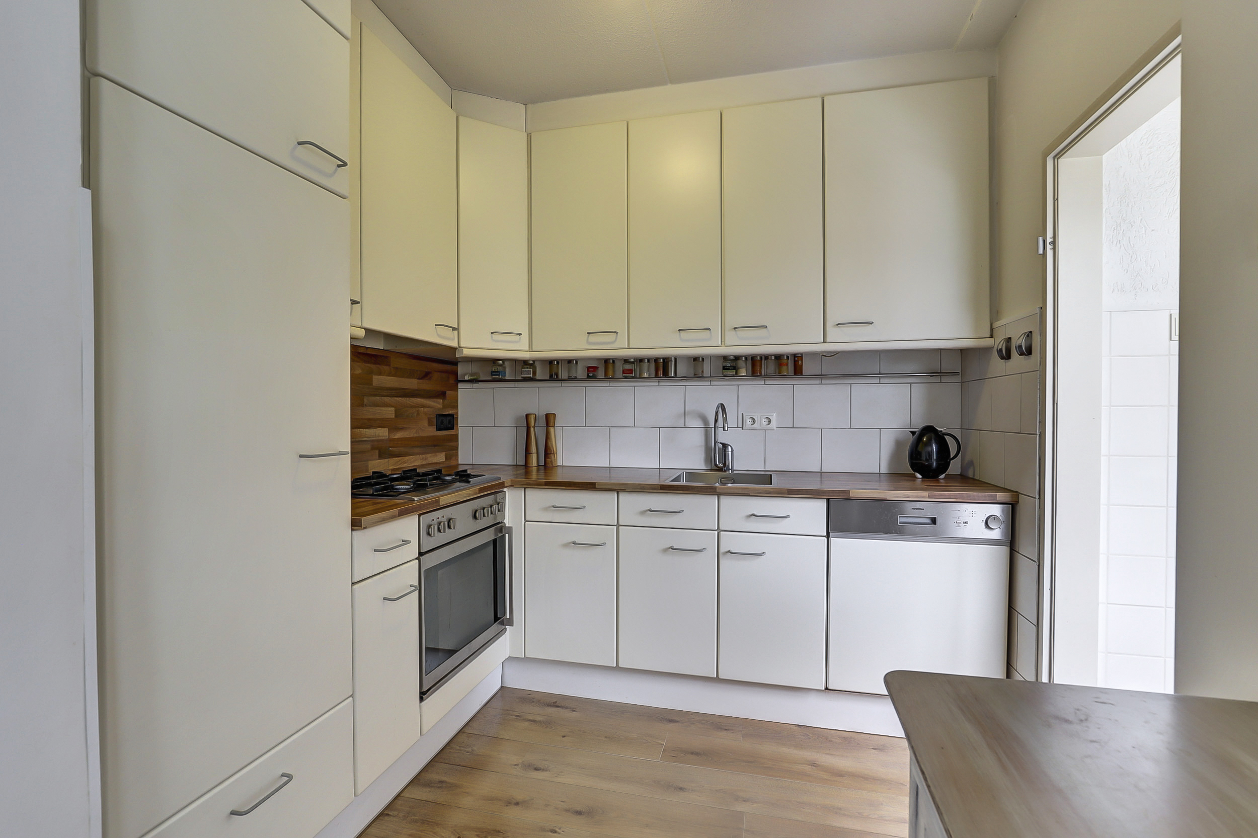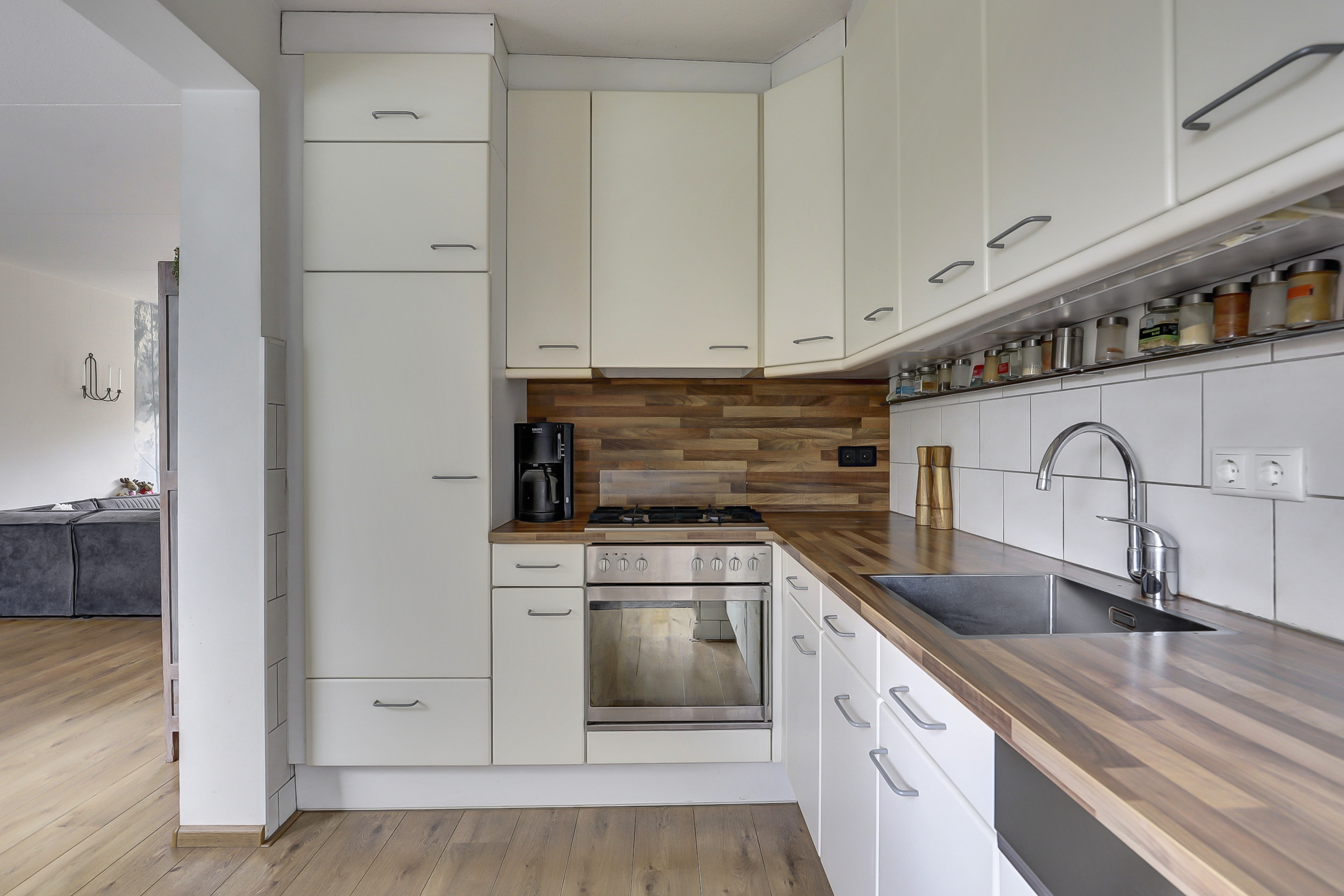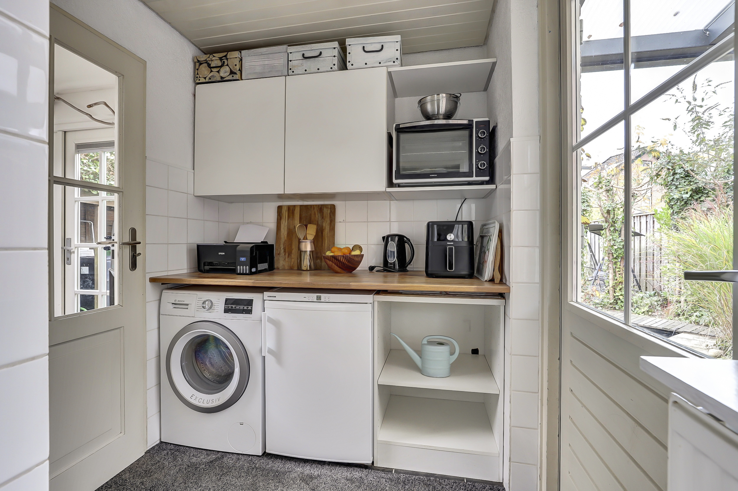 De open keuken sluit direct aan op de woonkamer en kijkt uit op de achtertuin. Vanuit de keuken heb je alles binnen handbereik en is er voldoende werk- en kastruimte. Aansluitend bevindt zich de bijkeuken, met plek voor de wasapparatuur, extra bergruimte en een achterdeur naar de overkapping en tuin.
