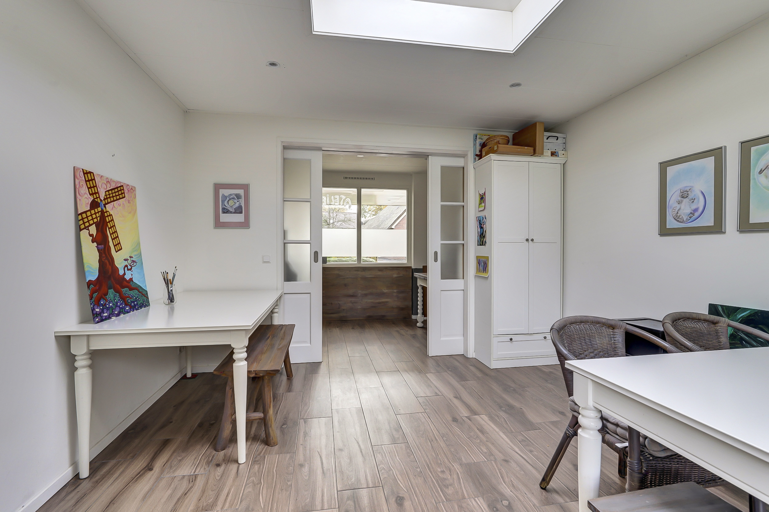 De praktijk- of werkruimte op de begane grond is een groot pluspunt. Ideaal als thuiswerkplek, salon of speelkamer. De mogelijkheden zijn eindeloos. De ruimte is voorzien van vloerverwarming, openslaande tuindeuren en een lichtkoepel. Ook is de ruimte te scheiden van elkaar middels sfeervolle ensuite deuren.