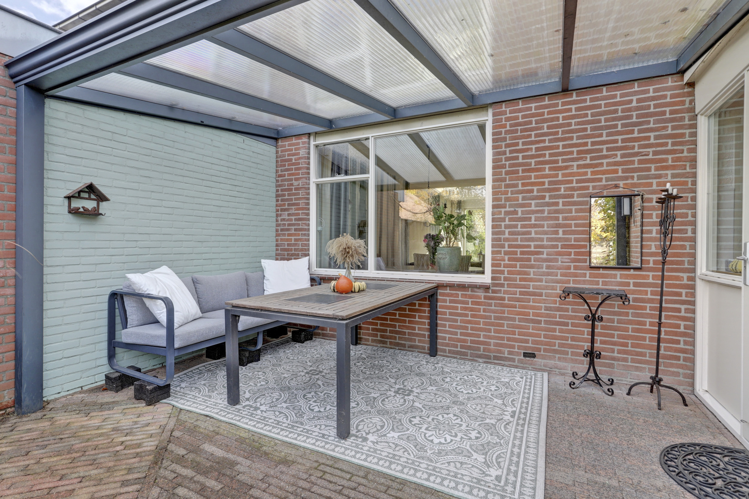 Onder de veranda aan de achtergevel zit je heerlijk beschut, of het nu lente, zomer of herfst is. Een fijne plek om te ontspannen.