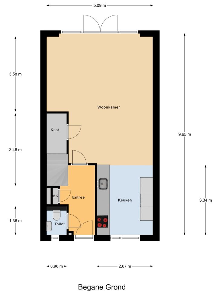 Entree, toilet, meterkast, trapkast, woonkamer met openslaande deuren naar terras. Luxe open keuken met diverse inbouwapparatuur.