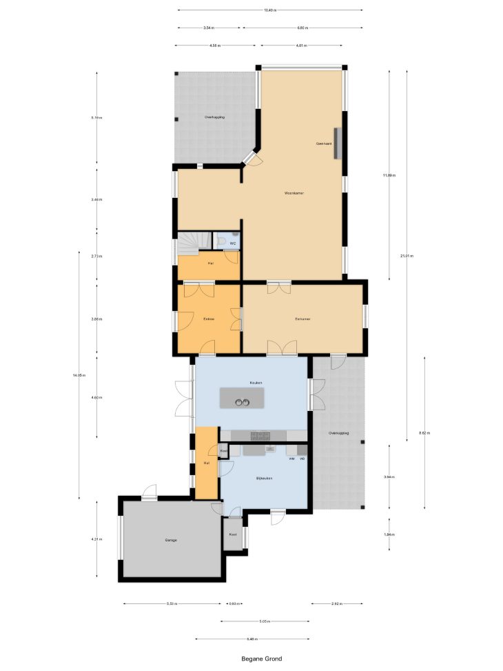 Entree, hal, toilet, trapopgang, eetkamer met openslaande deuren naar de royale woonkamer met open haard, luxe keuken voorzien van inbouwapparatuur en spoeleiland, toegang middels openslaande deuren tot de achtertuin, bijkeuken met wasmachine aansluiting en inbouwkast, garage welke binnendoor toegankelijk is.