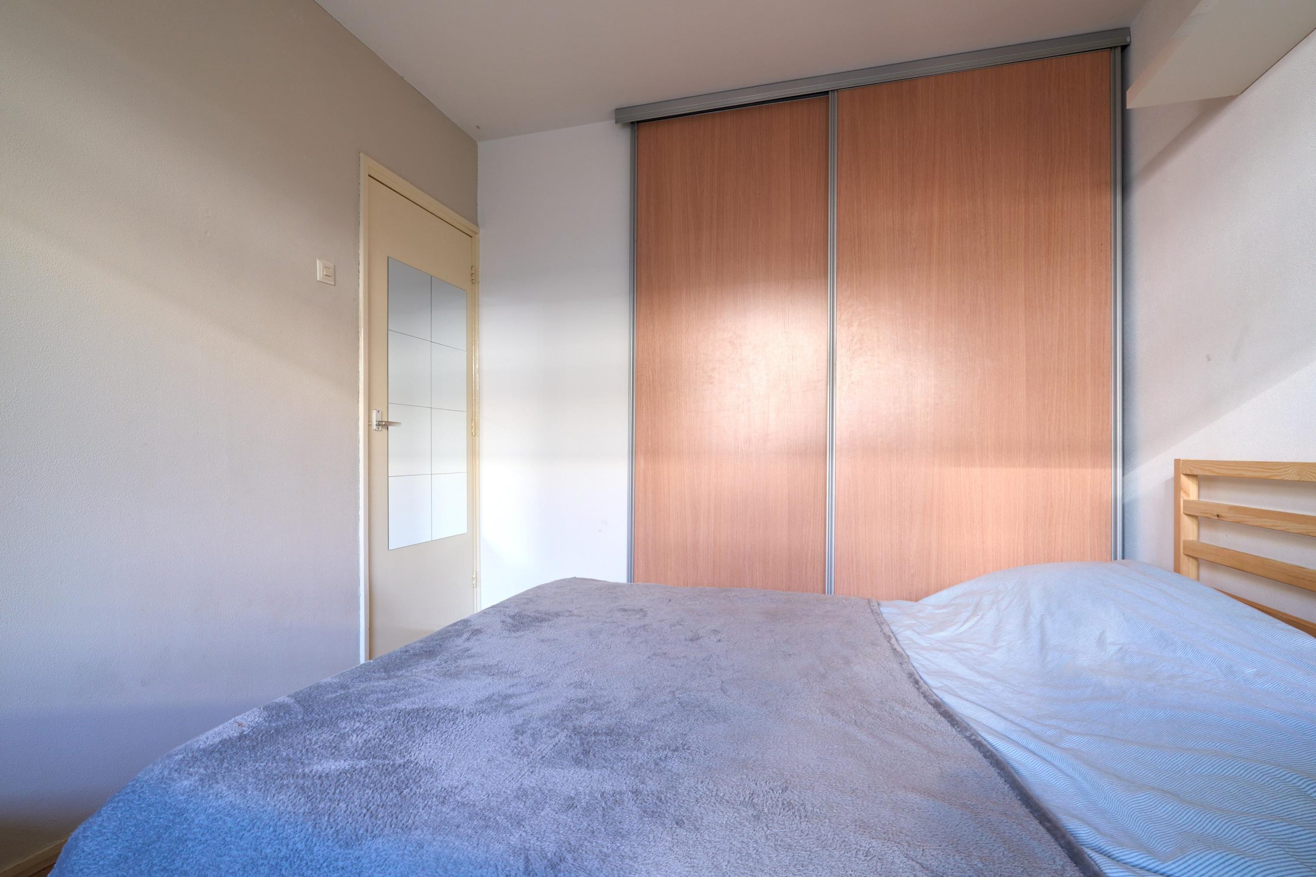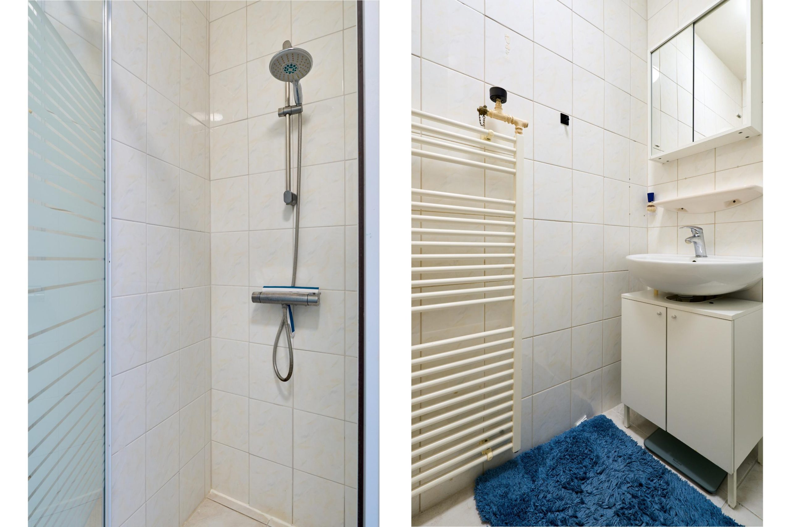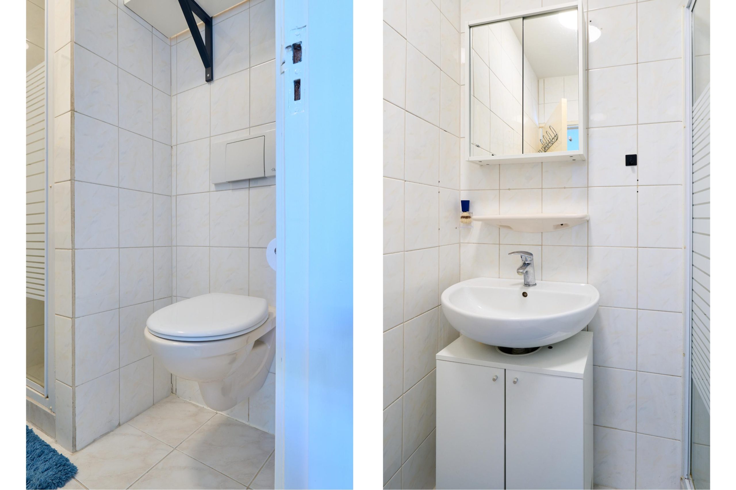 De slaapkamer is knus en goed in te richten met een tweepersoonsbed. De inbouwkast biedt voldoende ruimte om jouw spullen in op te bergen. De badkamer is compact maar netjes afgewerkt, met een douche, wastafel en toilet. Alles wat je nodig hebt, binnen handbereik.
