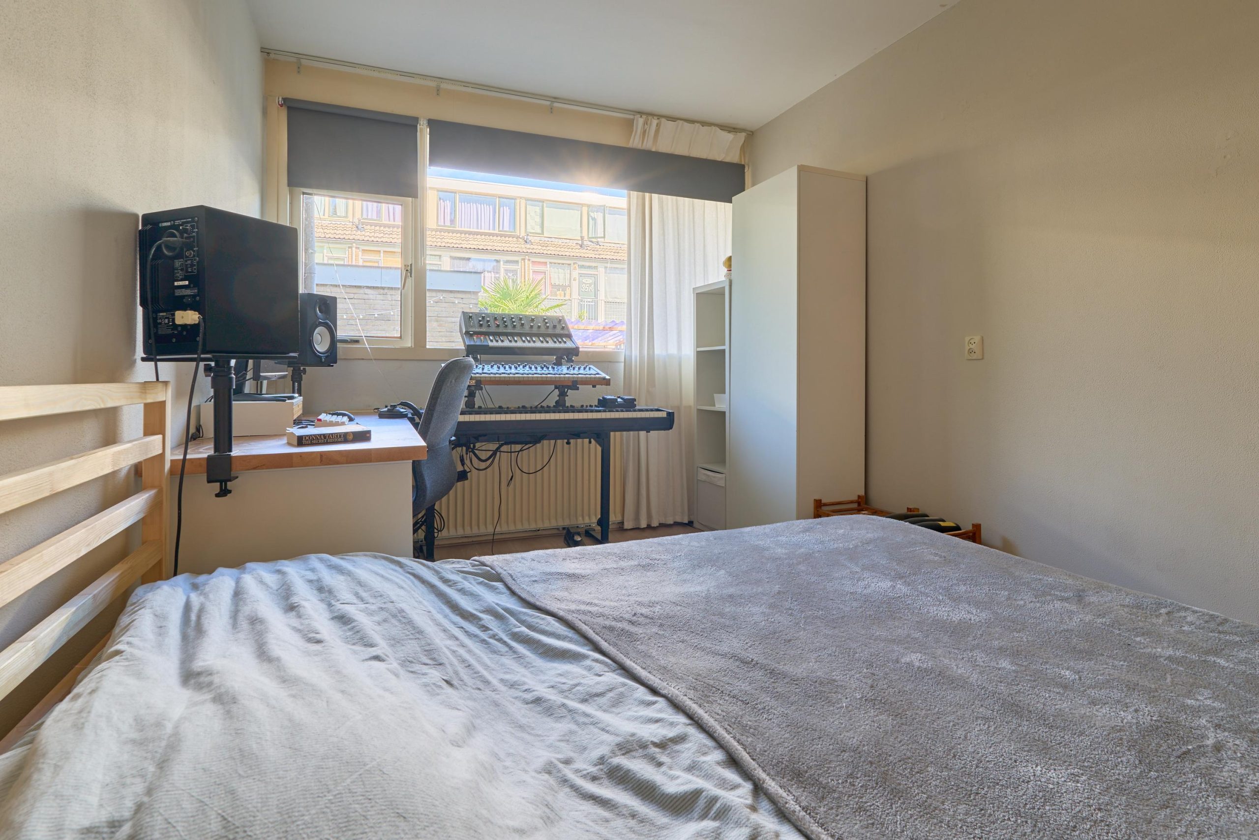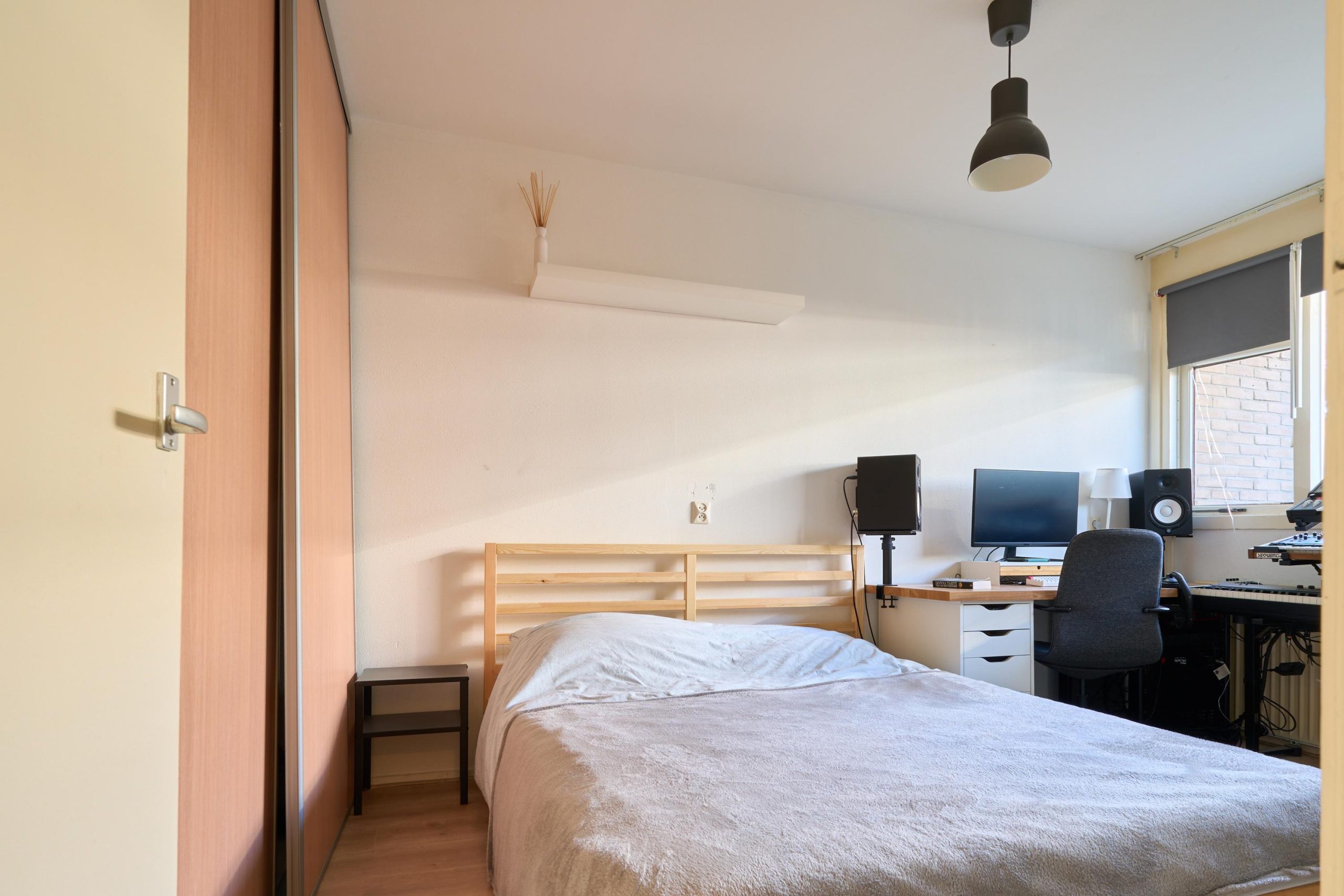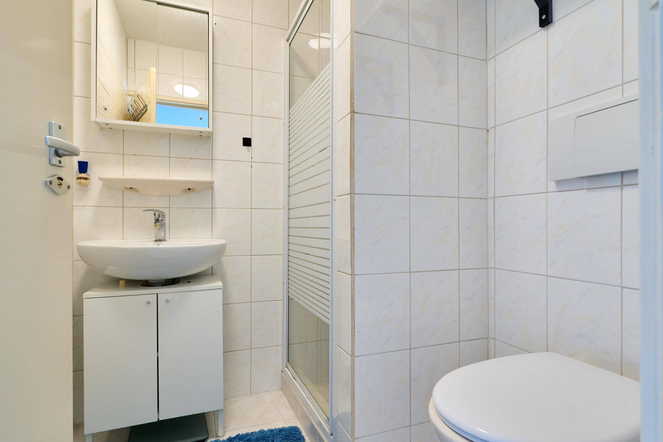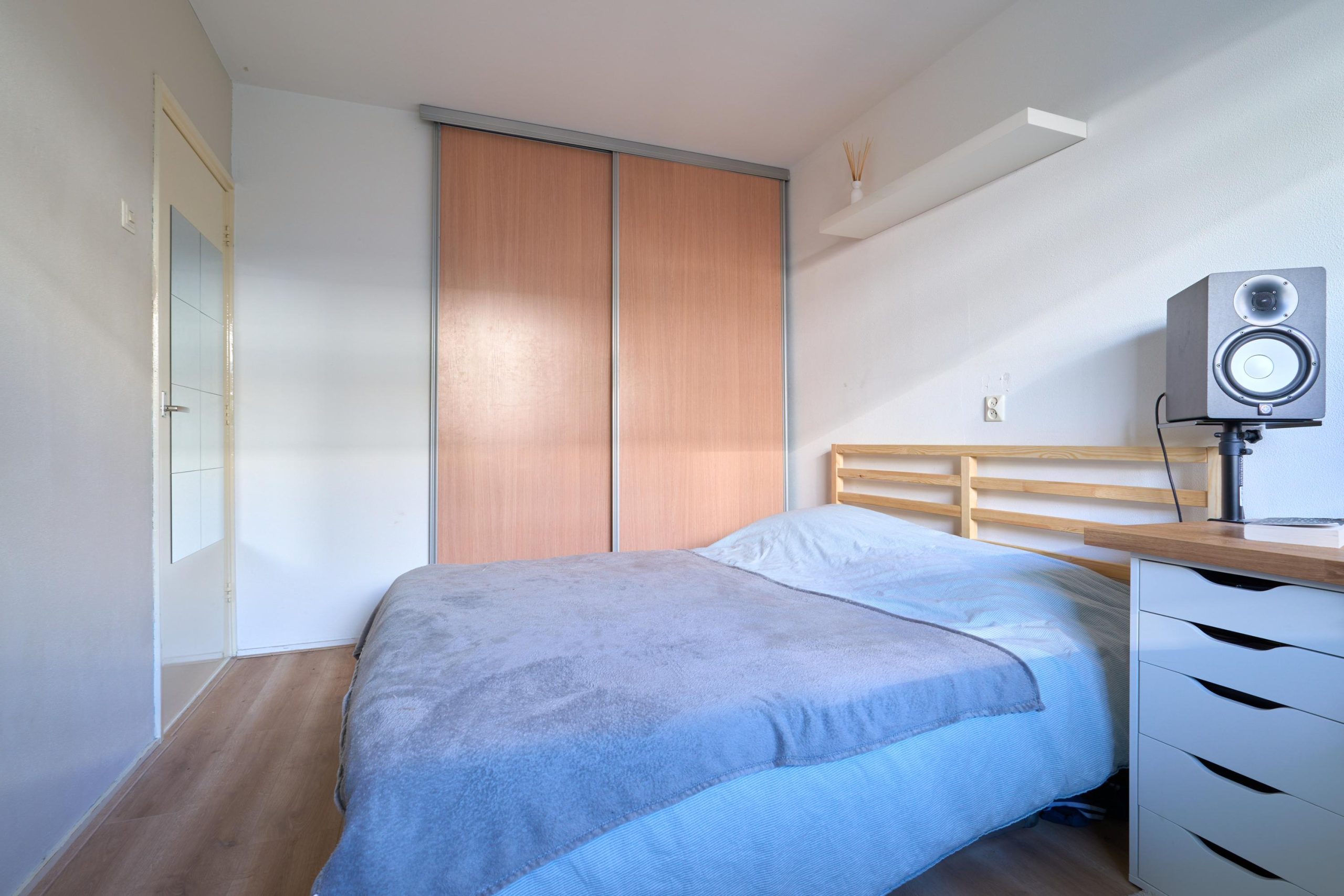 De slaapkamer is knus en goed in te richten met een tweepersoonsbed. De inbouwkast biedt voldoende ruimte om jouw spullen in op te bergen. De badkamer is compact maar netjes afgewerkt, met een douche, wastafel en toilet. Alles wat je nodig hebt, binnen handbereik.