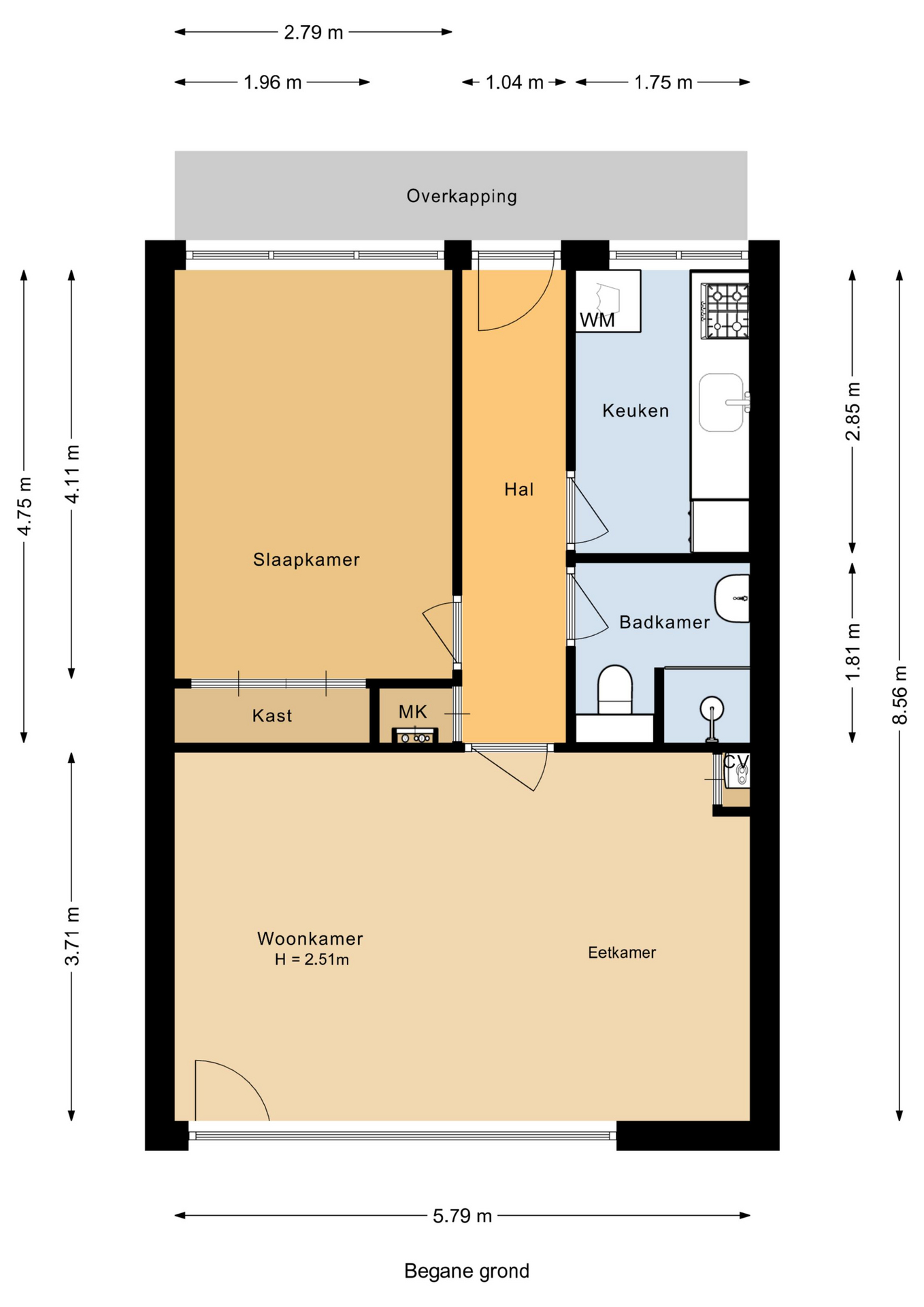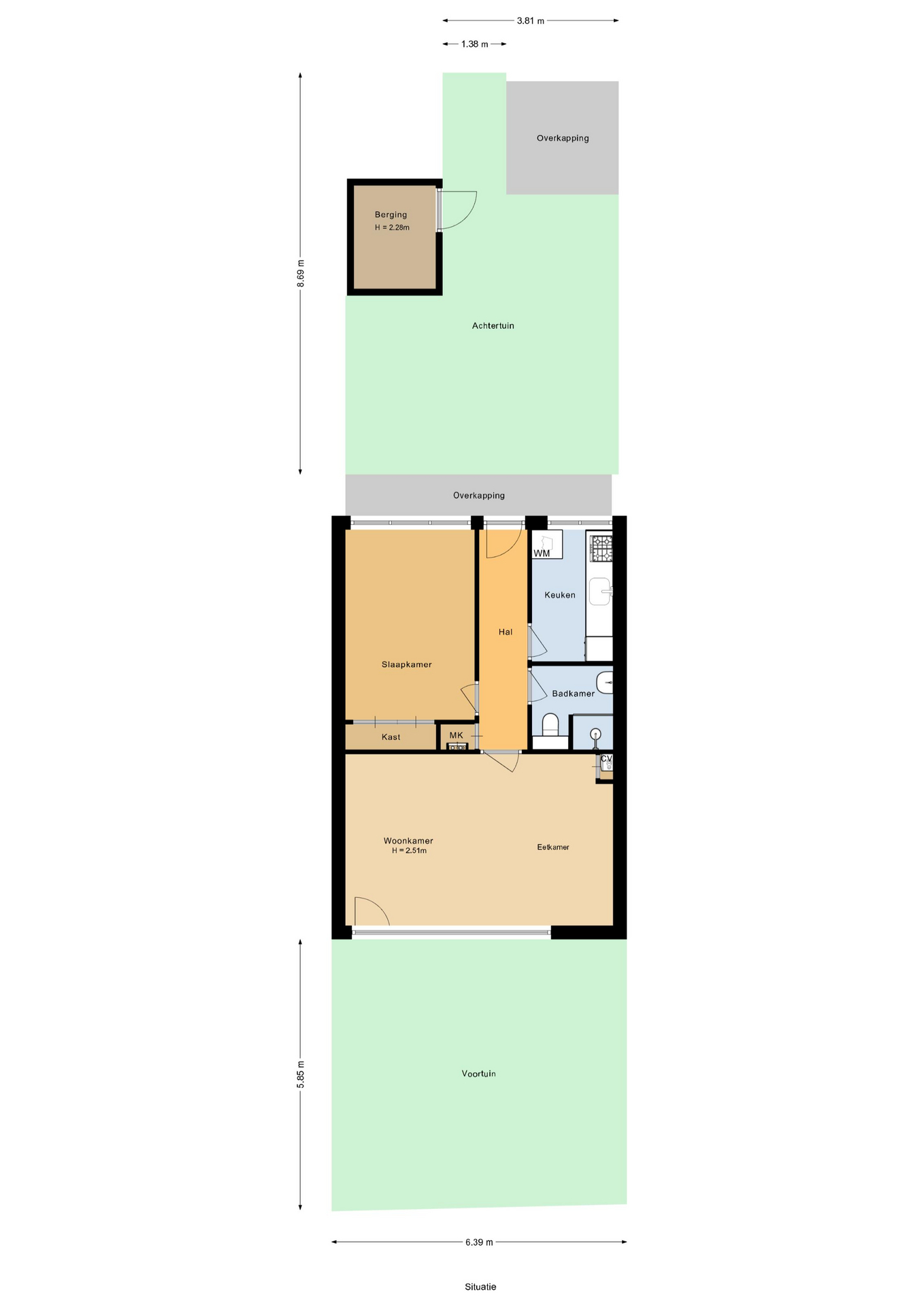 Entree met deur naar achtertuin met berging, dichte keuken met wasmachineaansluiting en inbouwapparatuur, badkamer met inloopdouche, wastafel en toilet, ruime slaapkamer met inbouwkast, woonkamer met deur naar de voortuin en kast met Cv-installatie.