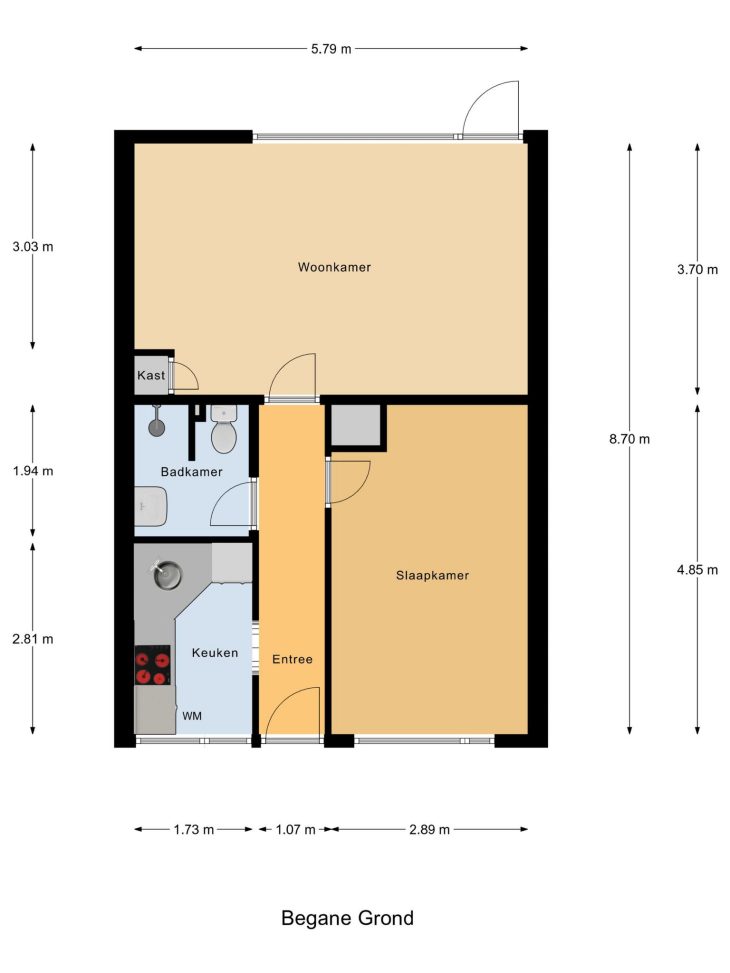 Entree met deur naar achtertuin met berging, dichte keuken met wasmachineaansluiting en inbouwapparatuur, badkamer met inloopdouche, wastafel en toilet, ruime slaapkamer, woonkamer met deur naar de voortuin.