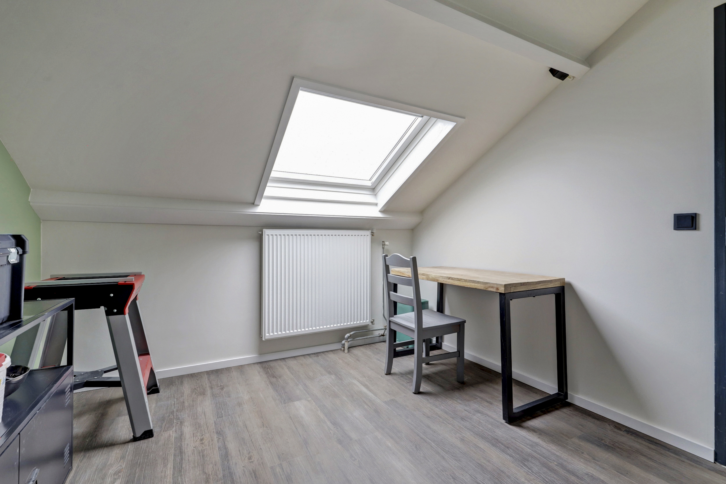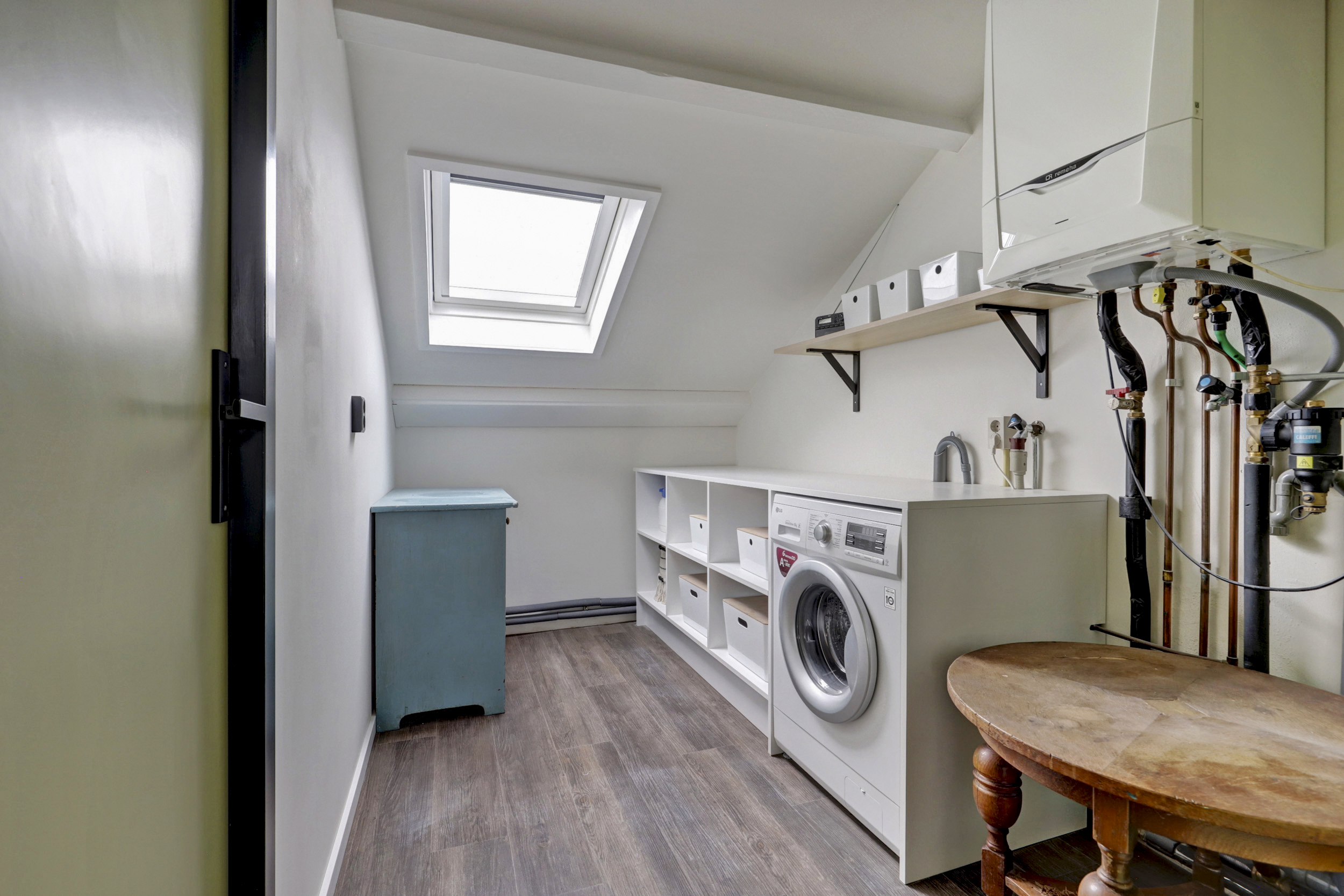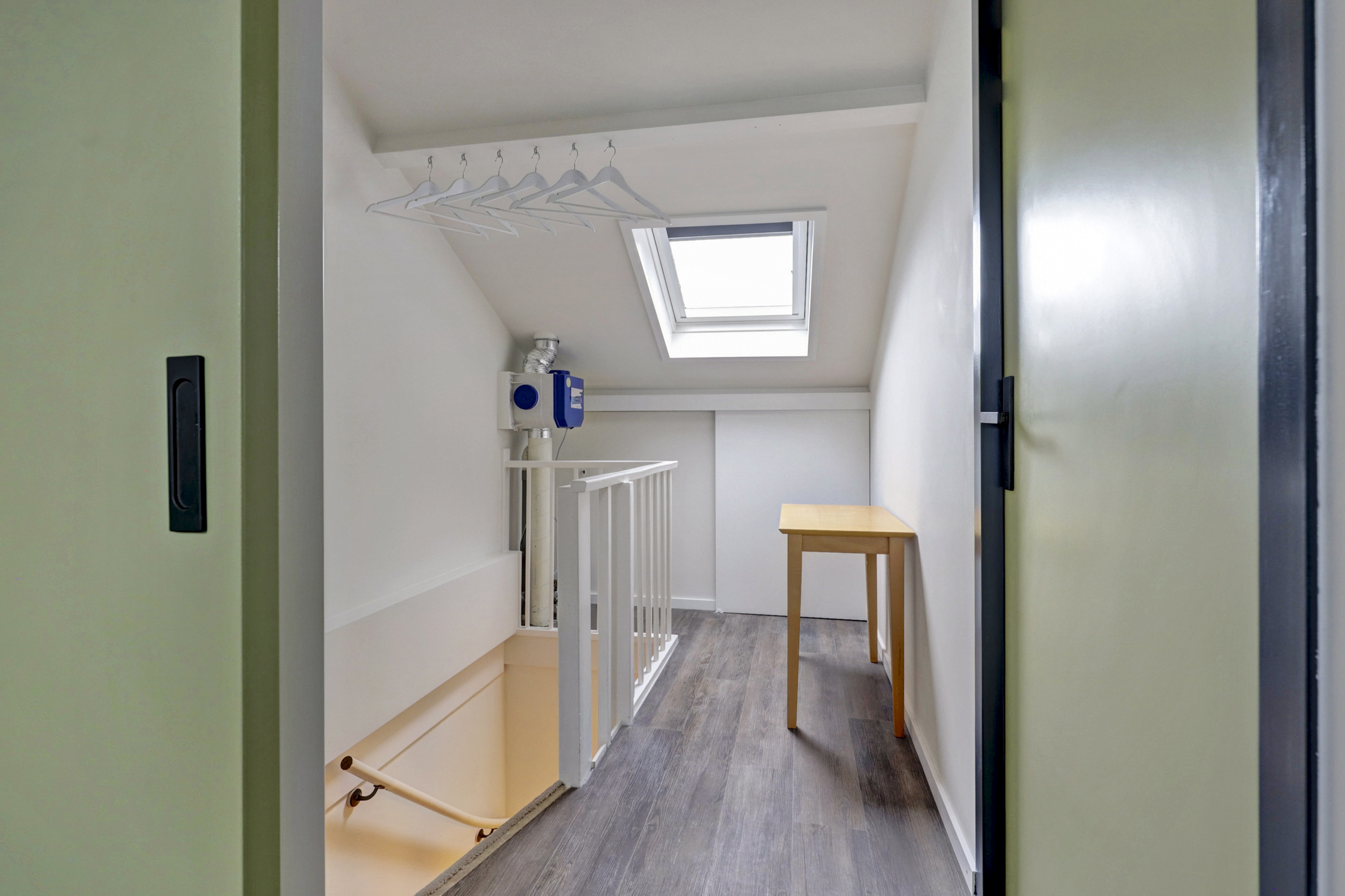 Op de tweede verdieping bevinden zich nog twee slaapkamers, waarvan één is voorzien van een dakkapel. Op de overloop is daarnaast een praktische berging gerealiseerd met ruimte voor de wasmachine en de cv-opstelling, waardoor deze apparatuur netjes uit het zicht is geplaatst.