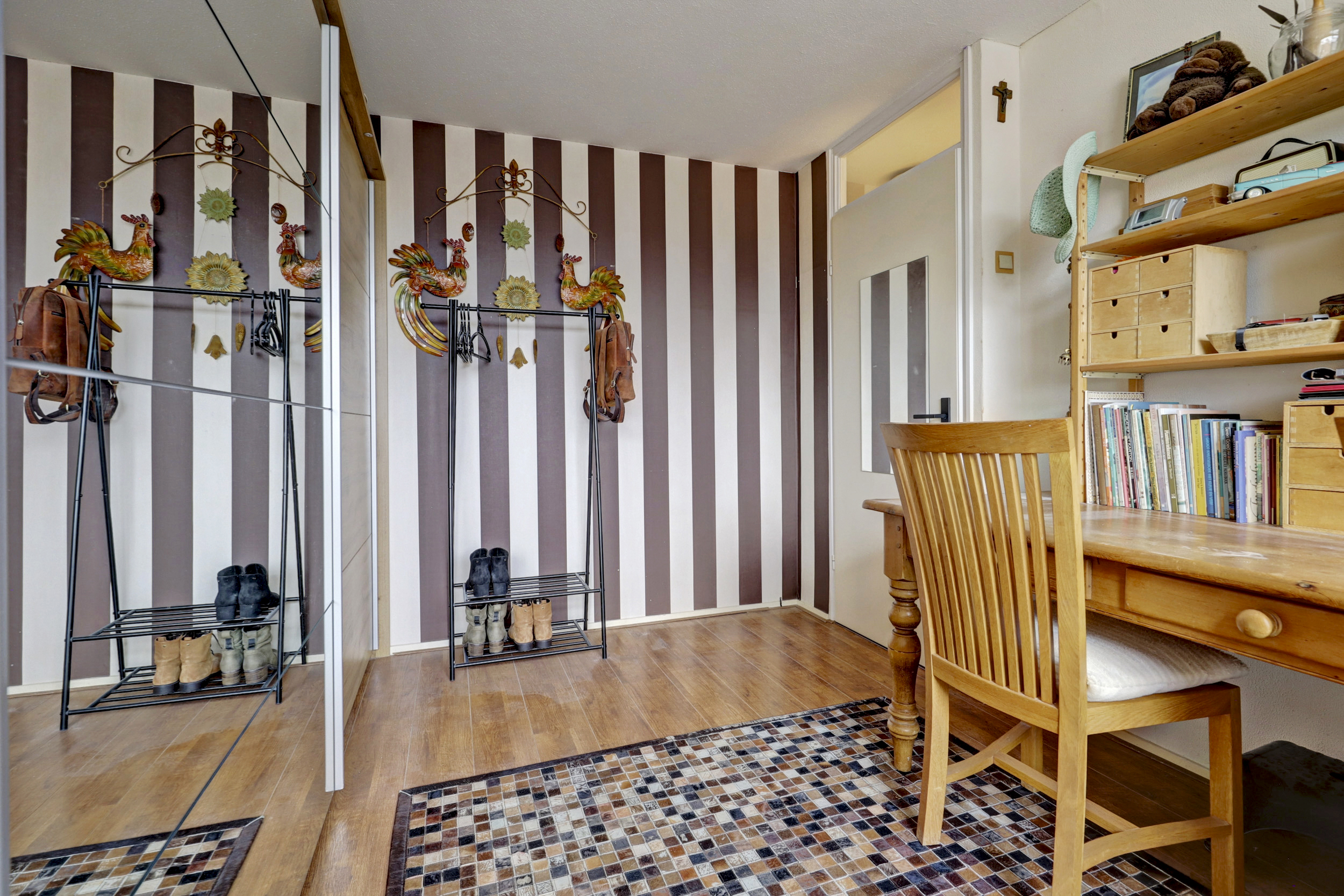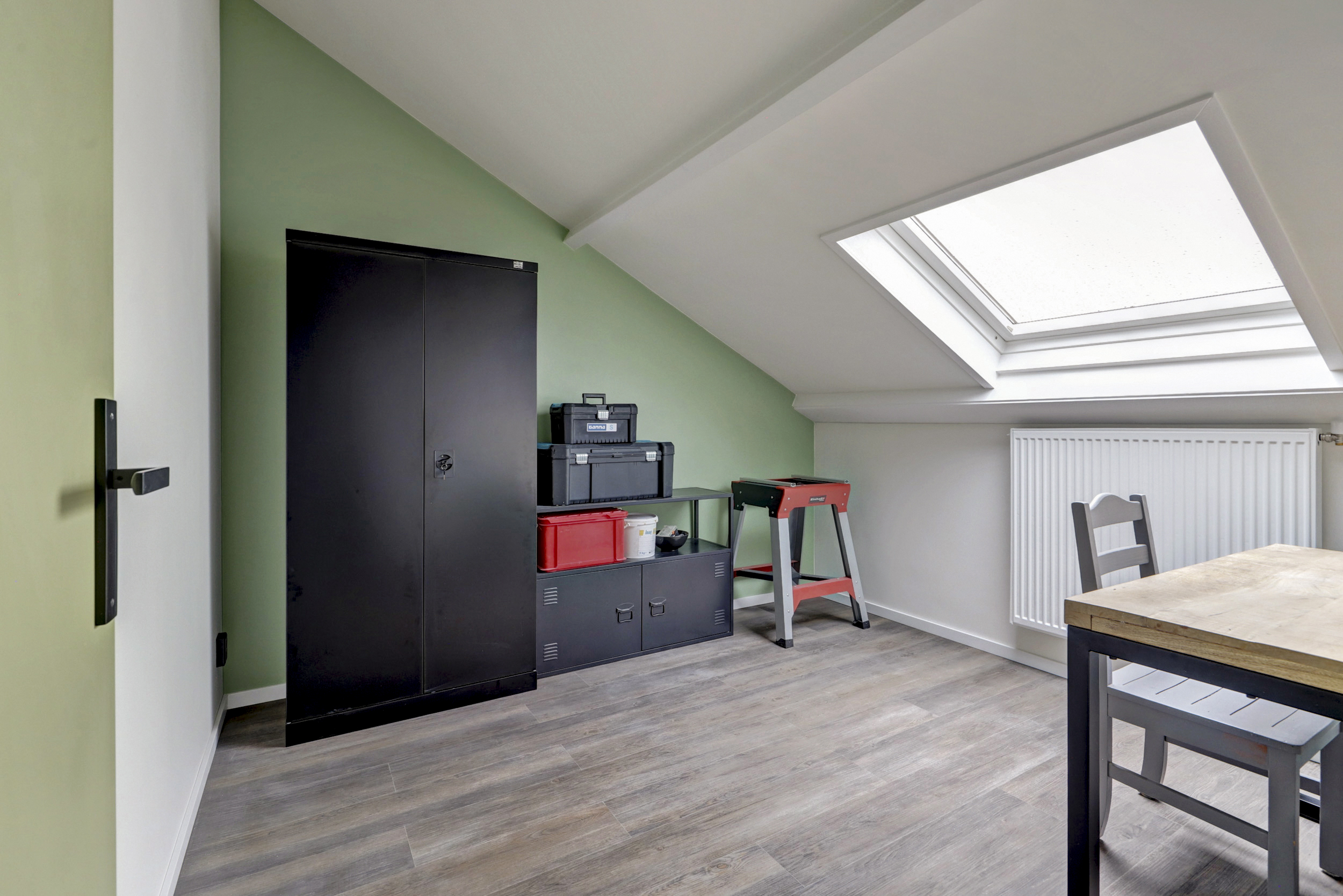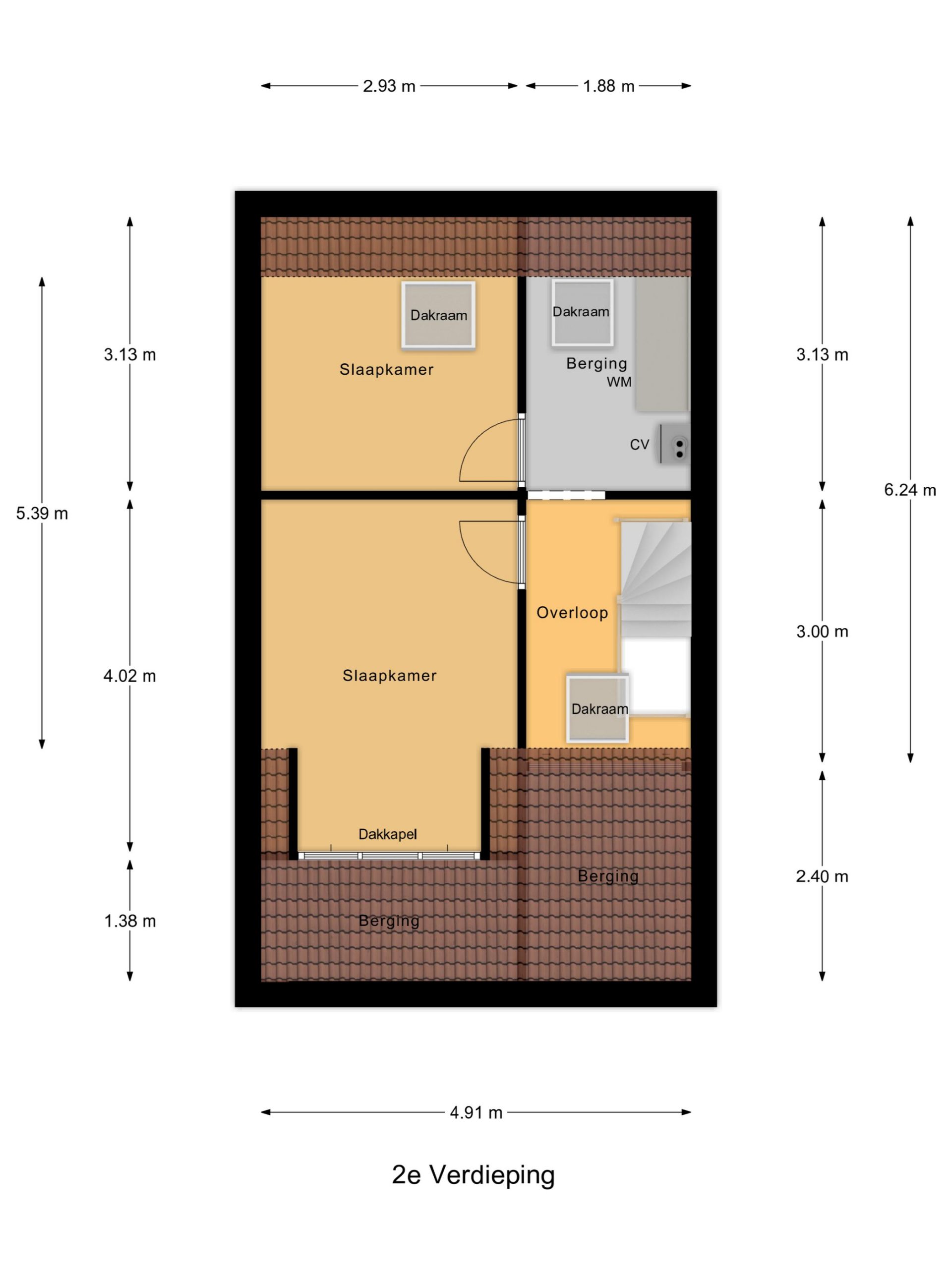 Op de tweede verdieping bevinden zich nog twee slaapkamers, waarvan één is voorzien van een dakkapel. Op de overloop is daarnaast een praktische berging gerealiseerd met ruimte voor de wasmachine en de cv-opstelling, waardoor deze apparatuur netjes uit het zicht is geplaatst.