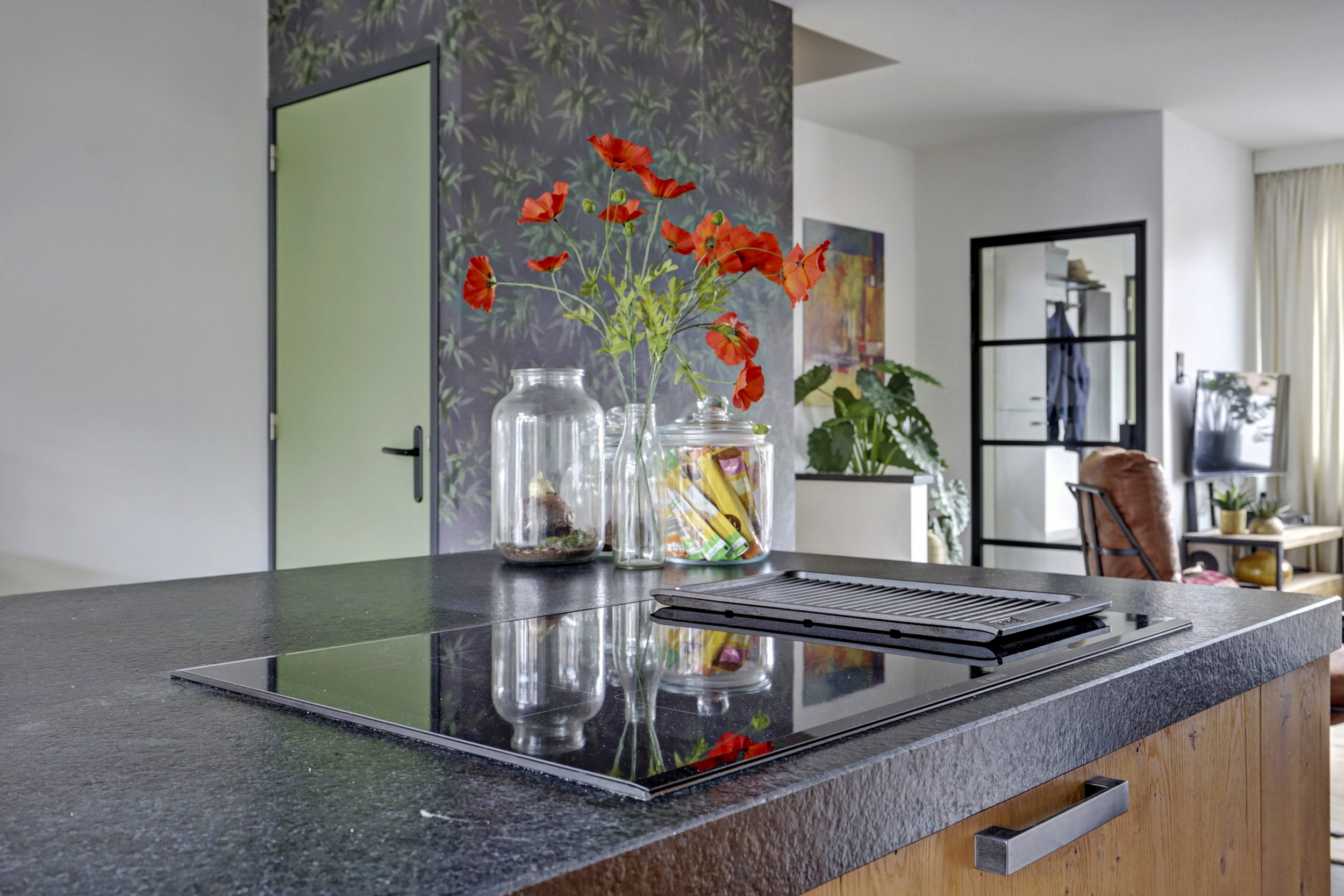 Via de entree kom je in de woonkamer met de prachtige woonkeuken, die in de uitbouw is gerealiseerd. De keuken is voorzien van een kookeiland en diverse luxe inbouwapparatuur, wat deze ruimte tot een echte eyecatcher maakt. Dankzij de openslaande deuren naar de tuin wordt binnen moeiteloos met buiten verbonden en is het plaatje helemaal compleet. Wat een heerlijke ruimte om samen te eten of gewoon even gezellig te zitten.