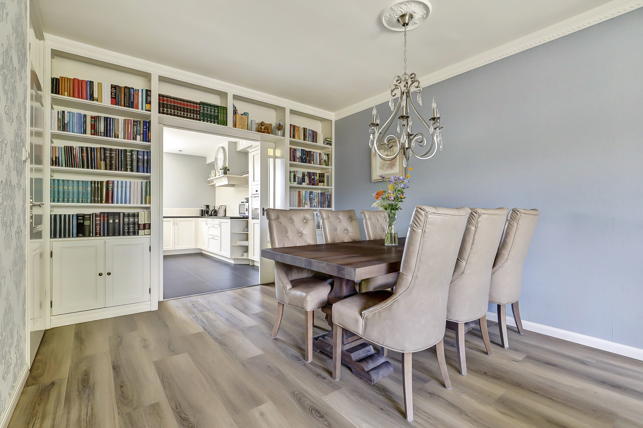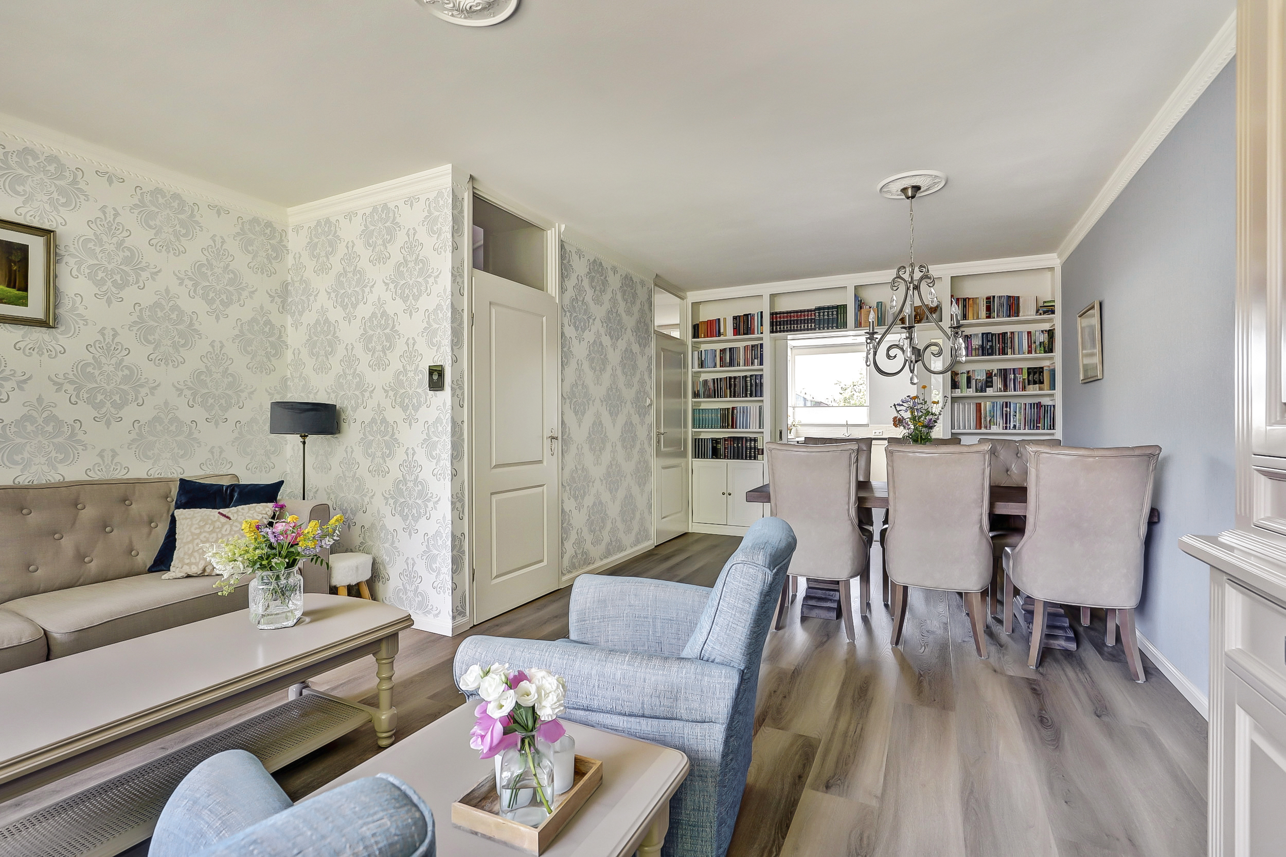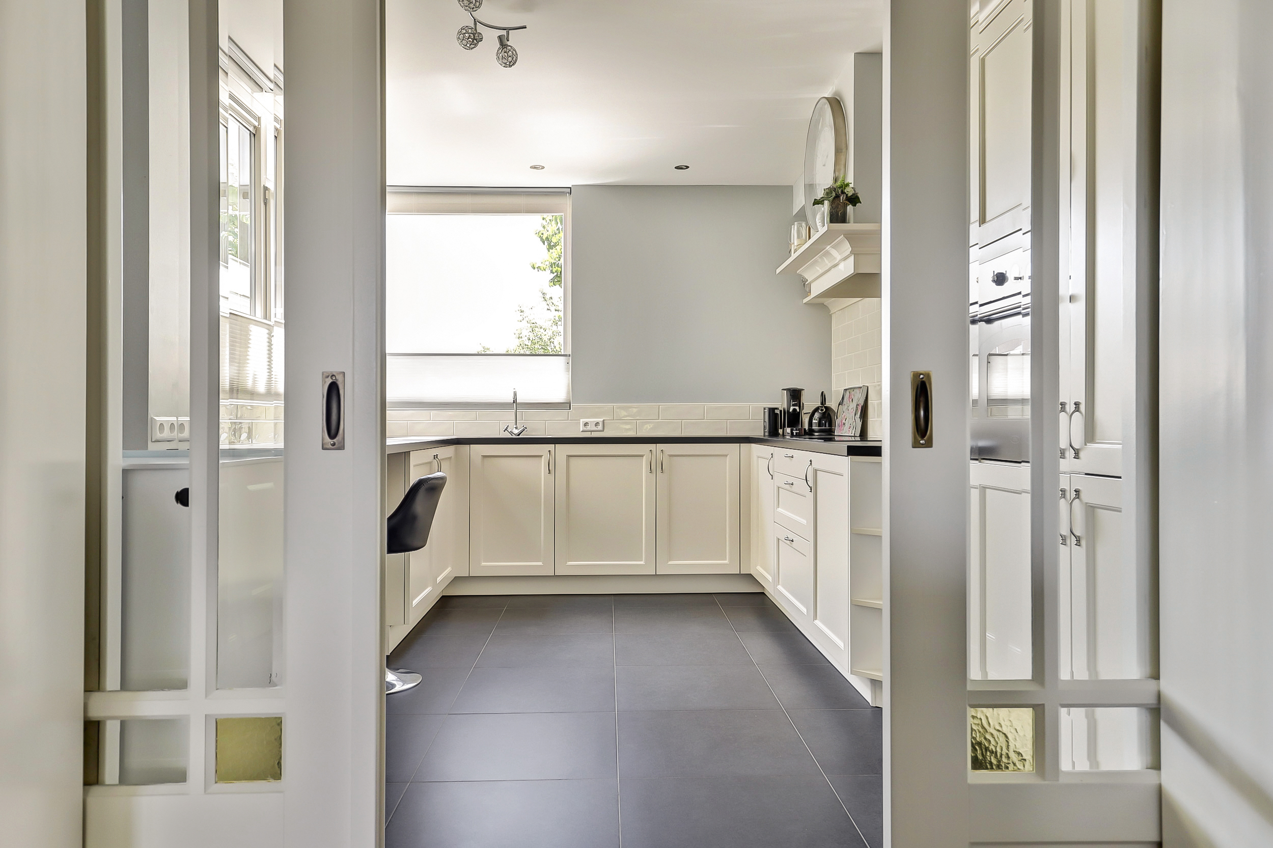 Via de entree, waar zich het toilet en de meterkast bevinden, kom je in de woonkamer met de prachtige kamer-en-suitedeuren naar de keuken.