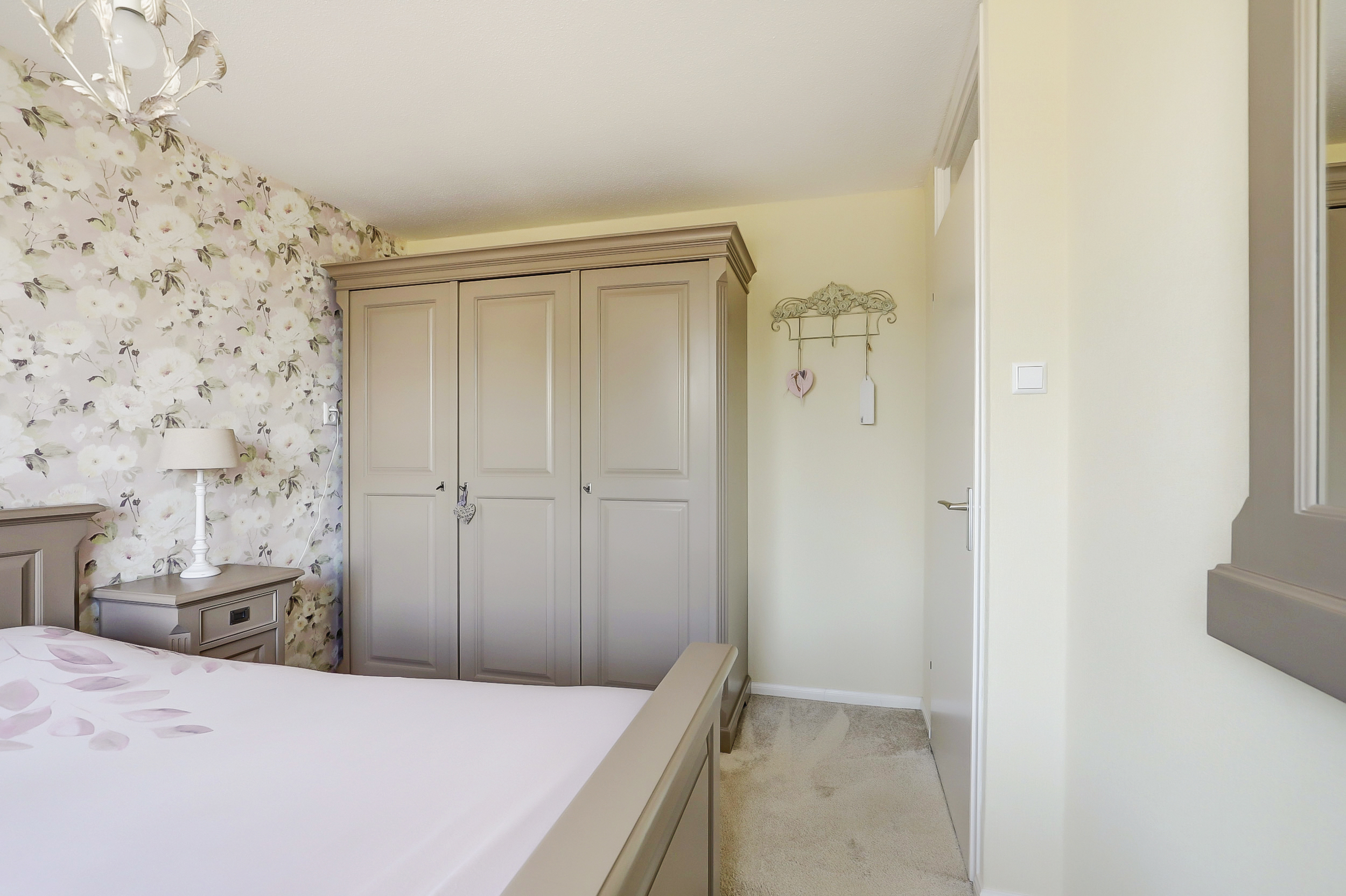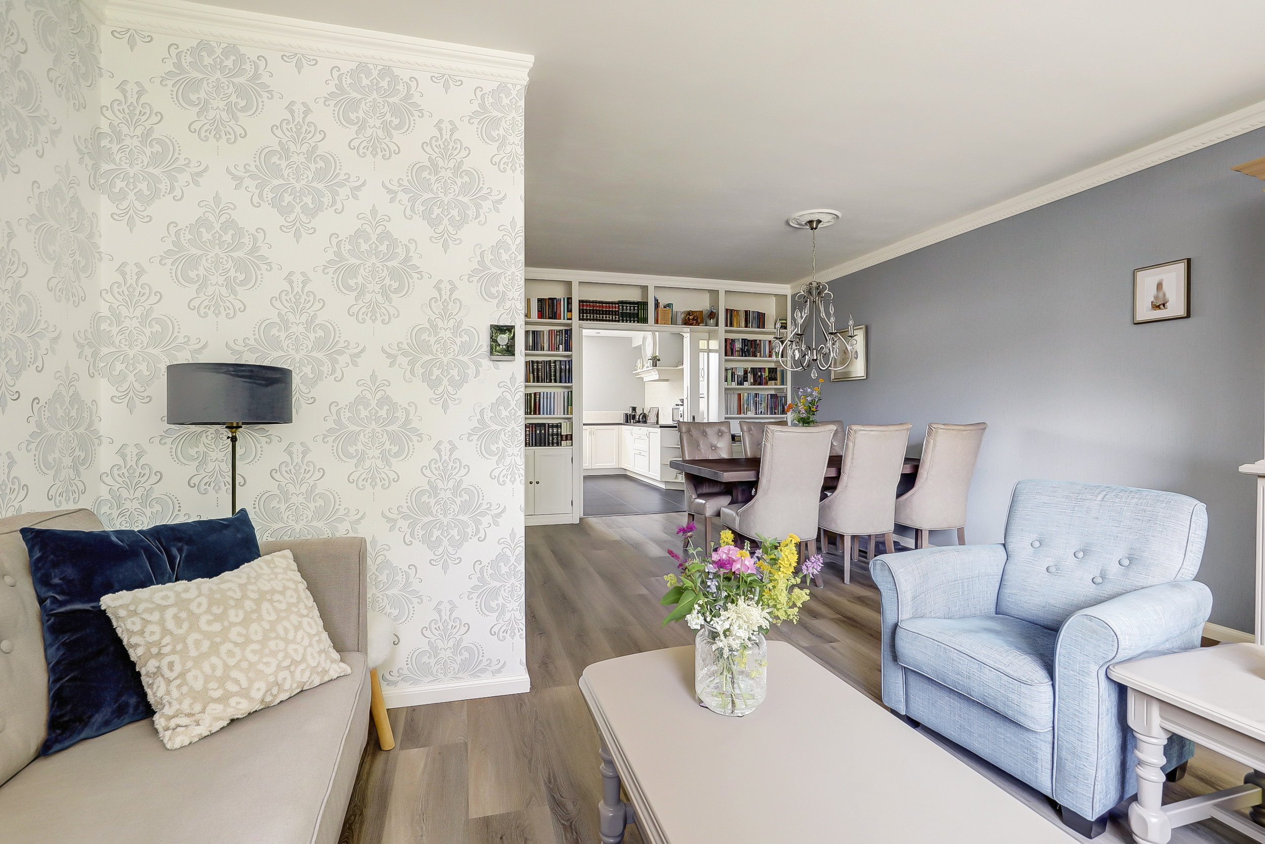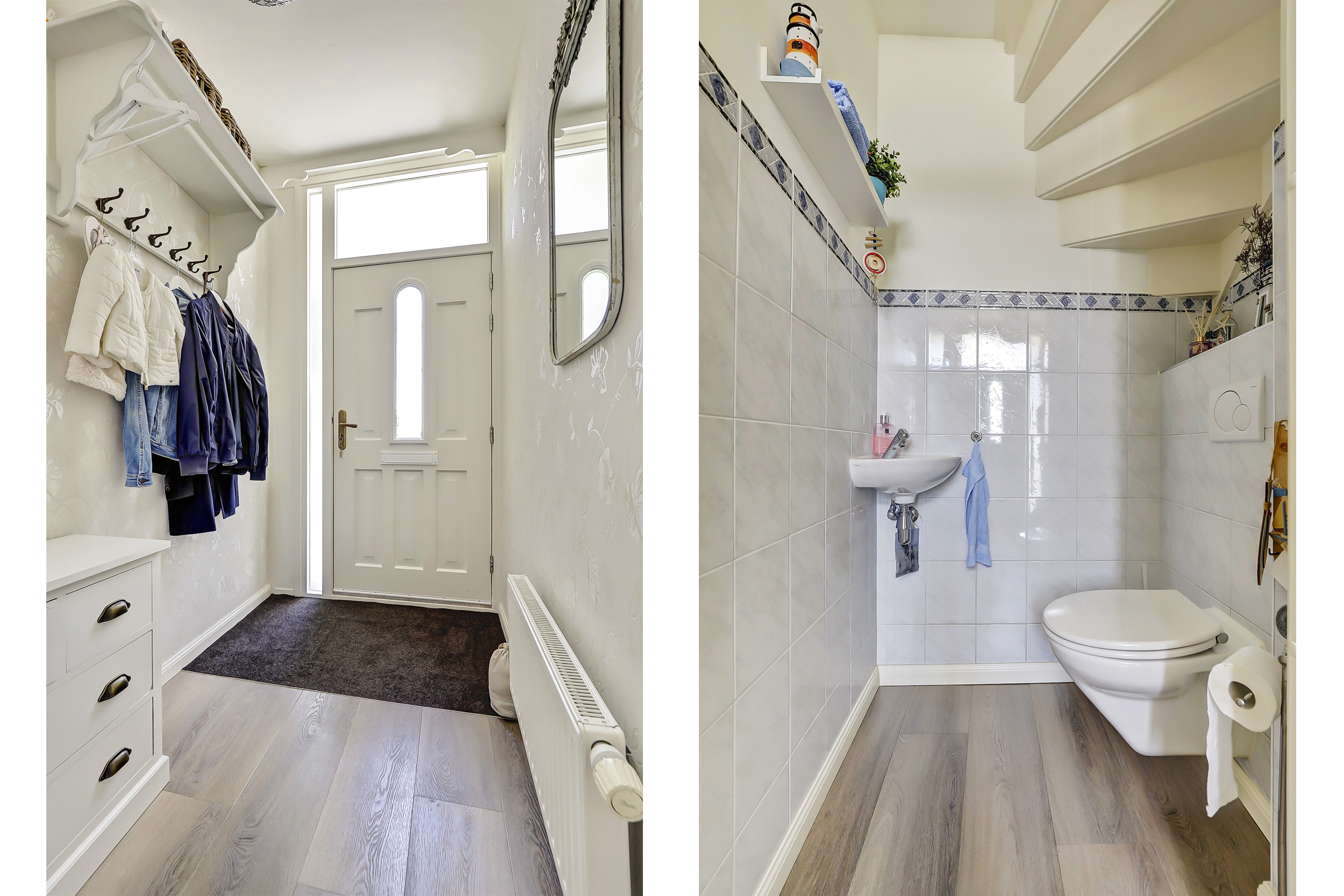 Via de entree, waar zich het toilet en de meterkast bevinden, kom je in de woonkamer met de prachtige kamer-en-suitedeuren naar de keuken.
