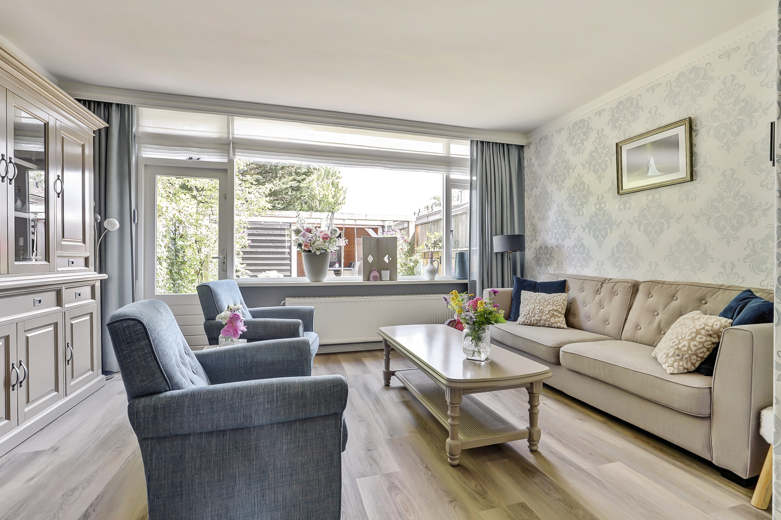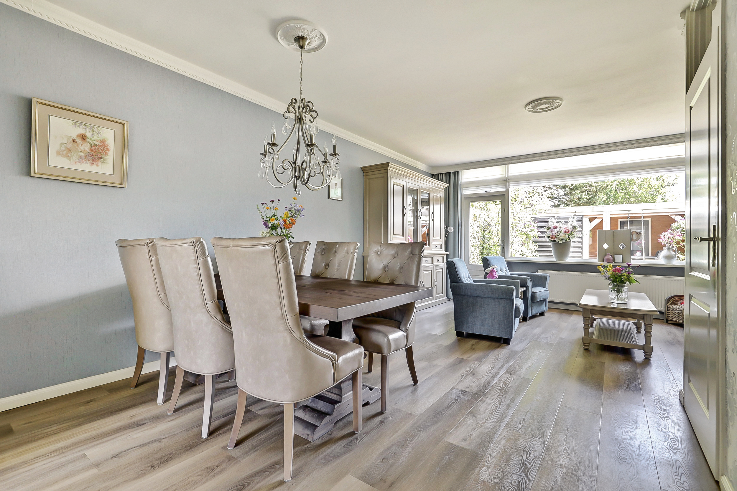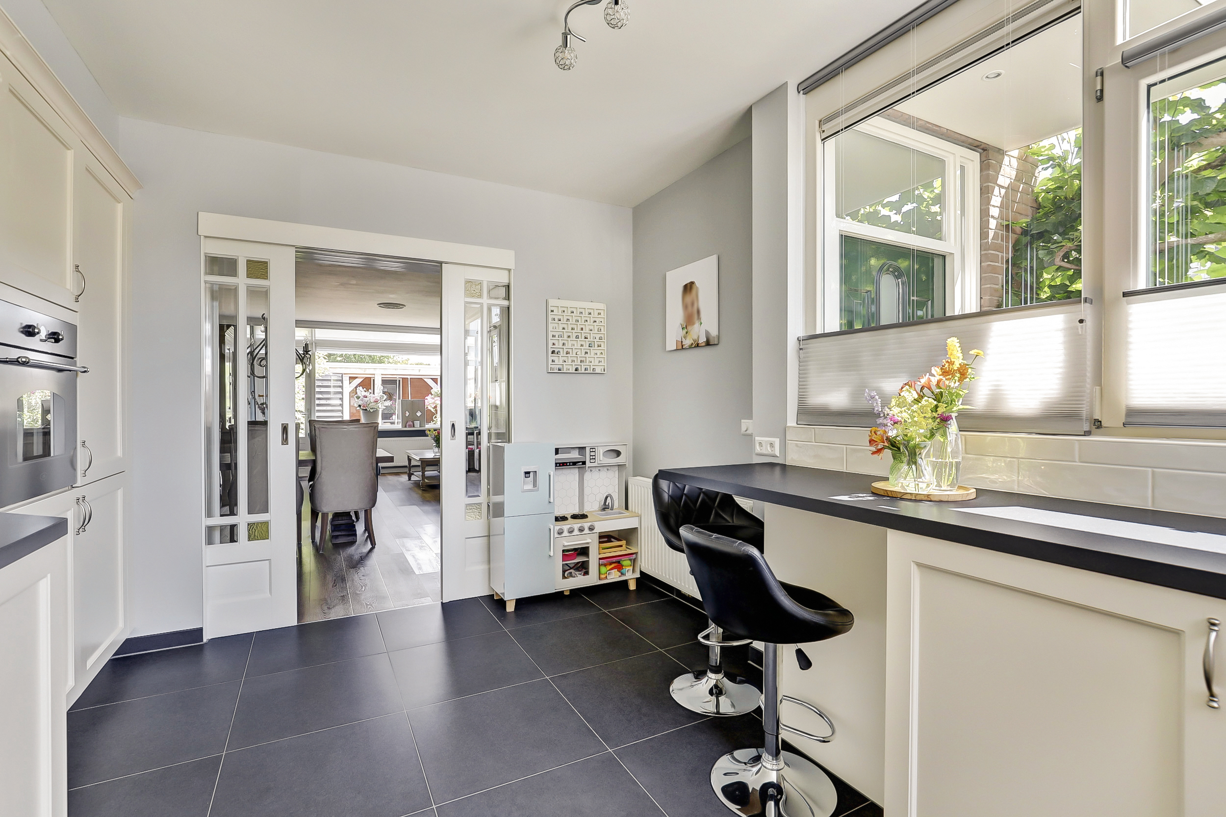 • Lichte woonkamer met kamer-en-suitedeuren naar de keuken