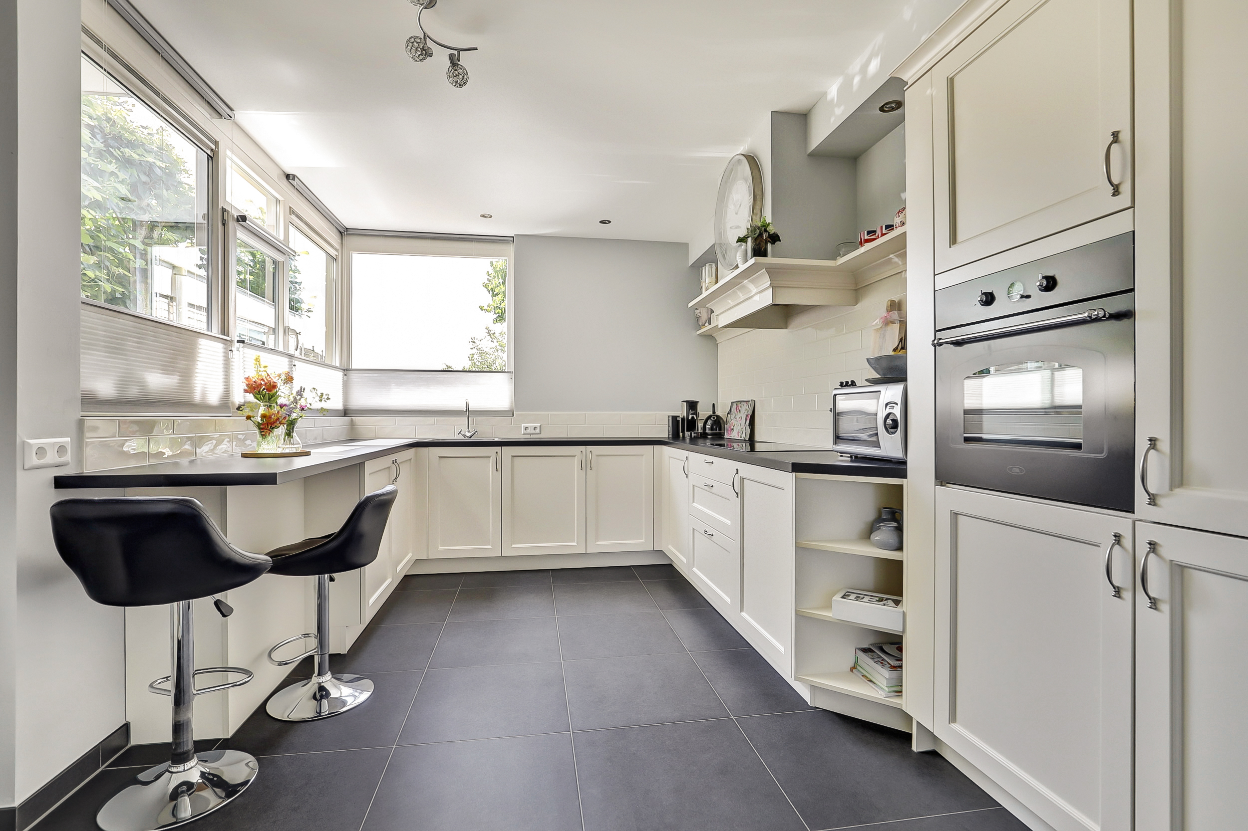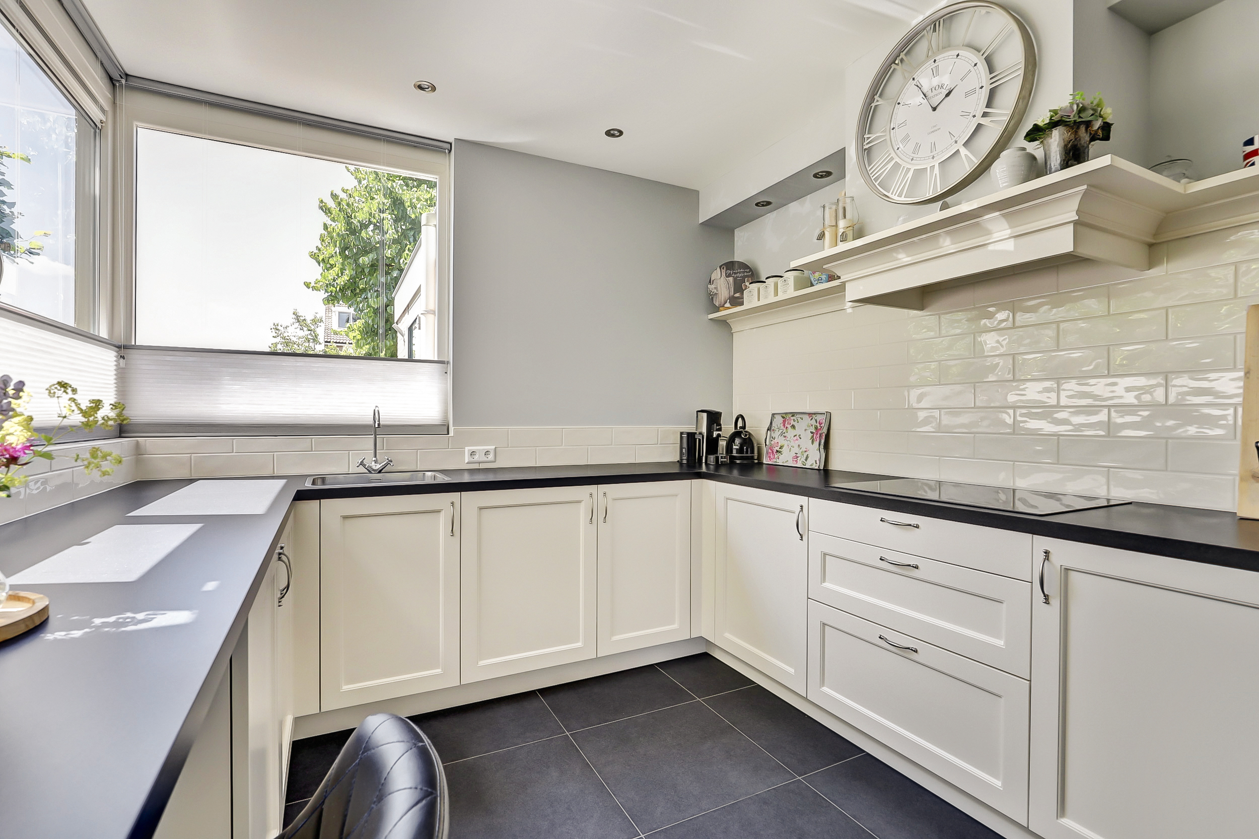 De keuken is gelegen aan de voorzijde van de woning en is voorzien van diverse inbouwapparatuur zoals een oven, kookplaat en een stijlvolle afzuigkap.