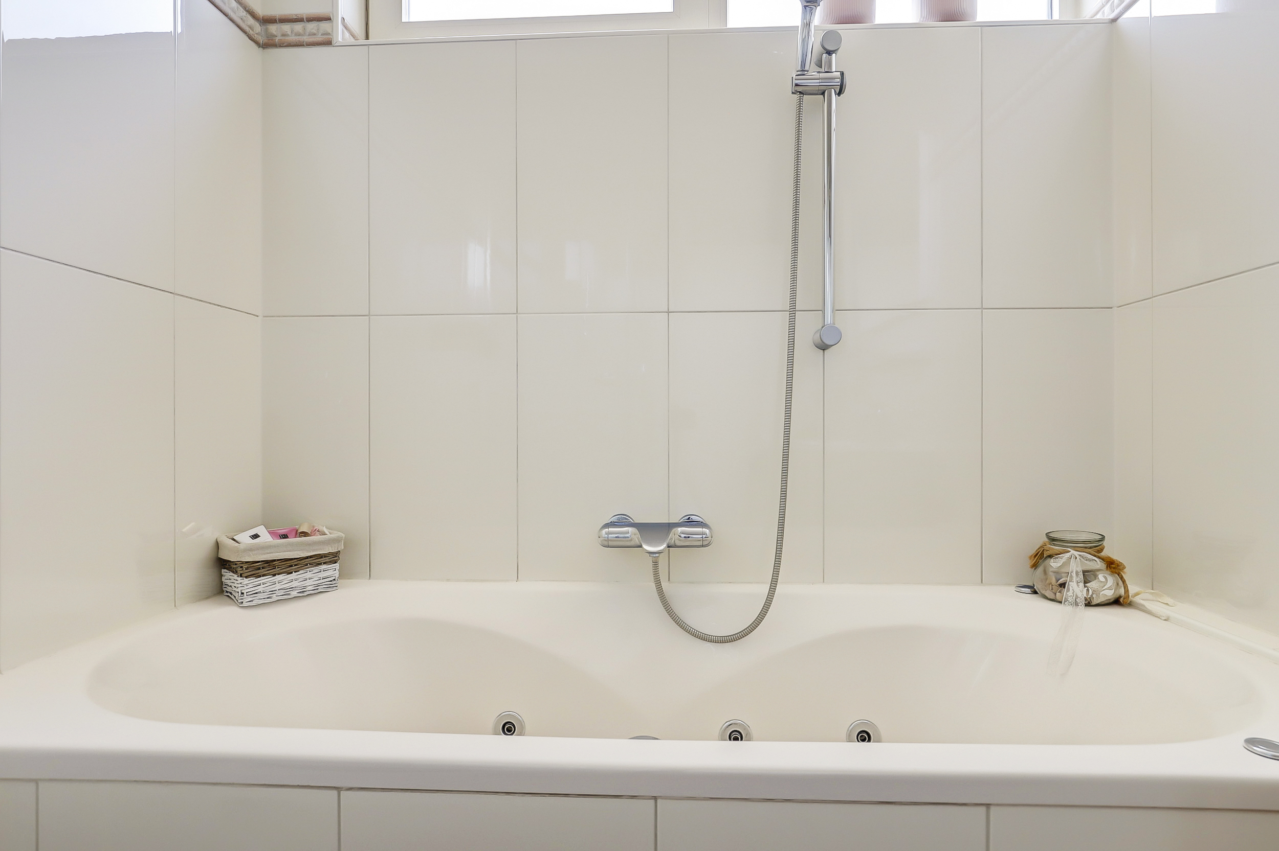 Overloop, 3 slaapkamers, badkamer met whirlpool, douche wastafelmeubel en 2e toilet.