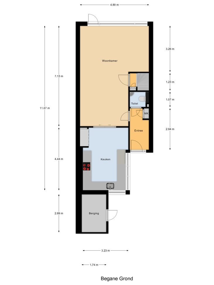 Entree, toilet, meterkast, woonkamer met kamer-en-suitedeuren naar de keuken. Keuken voorzien van diverse inbouwapparatuur. Berging aan de voorzijde van de woning.