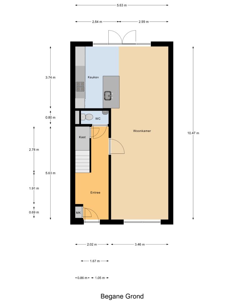 Entree, hal, meterkast, trapopgang met kast, toilet, toegang tot de lichte woonkamer en open keuken aan de achterzijde, voorzien van een spoeleiland, vaatwasser, koel-vries combinatie, afzuigkap, combi-oven/magnetron én close in boiler. De achtergevel is voorzien van twee openslaande tuindeuren die toegang geven tot de op het zuidwesten gelegen achtertuin.