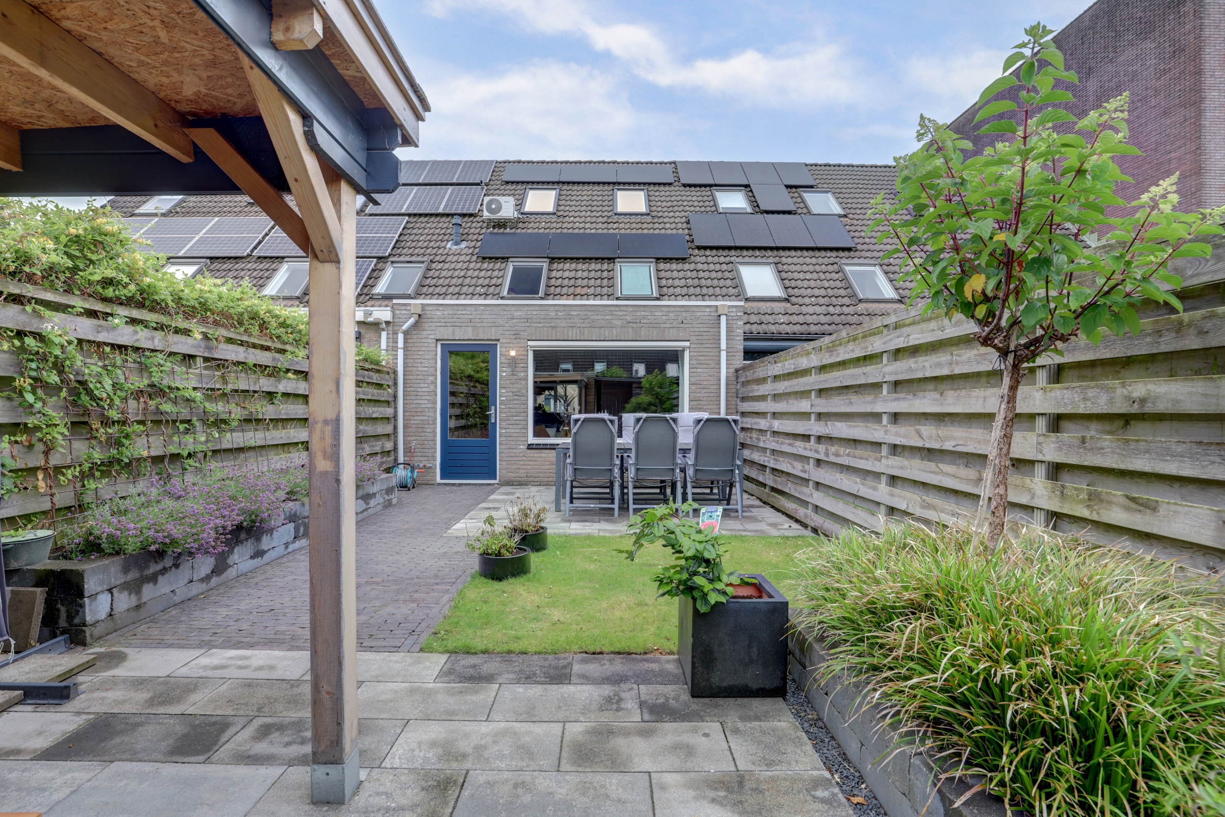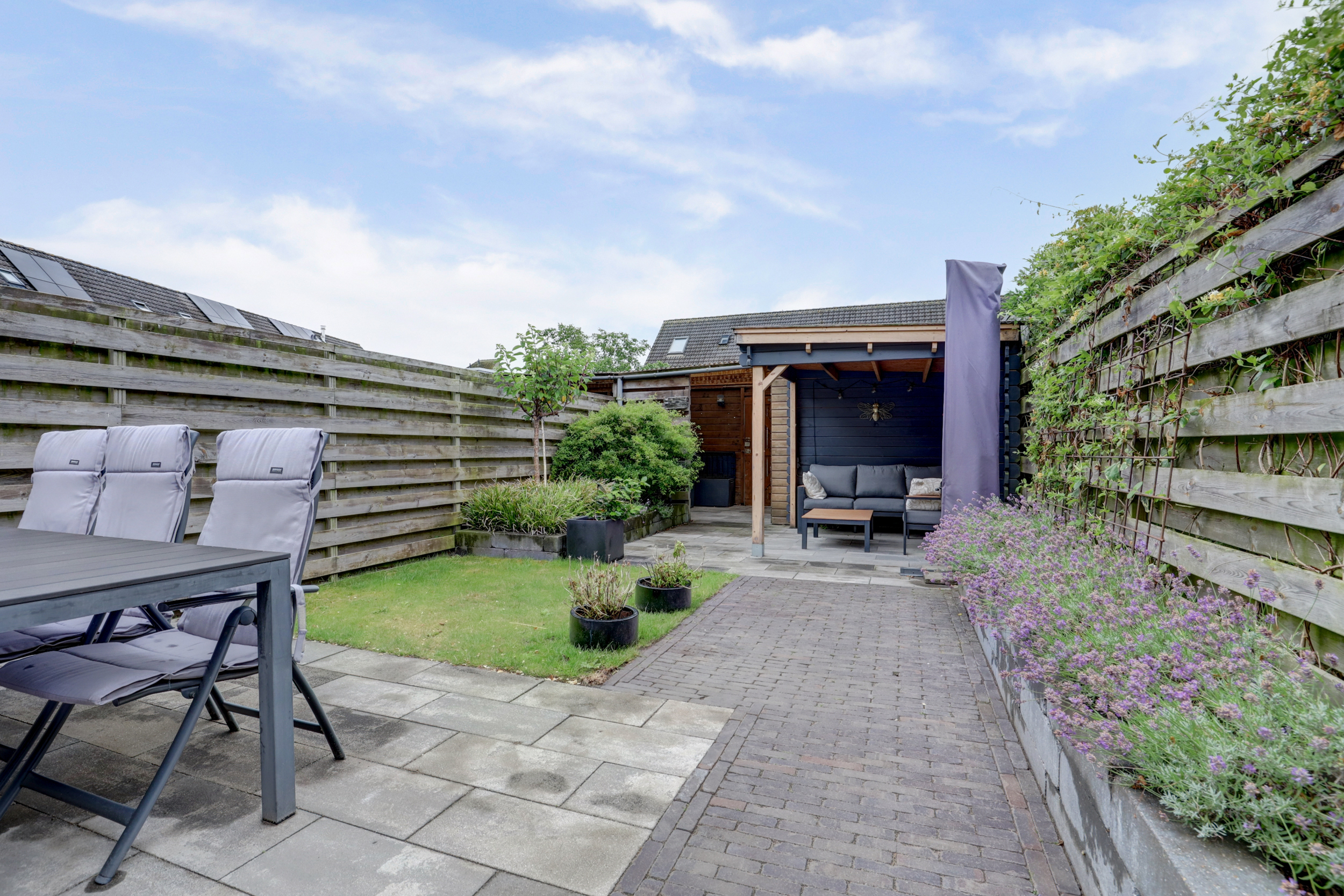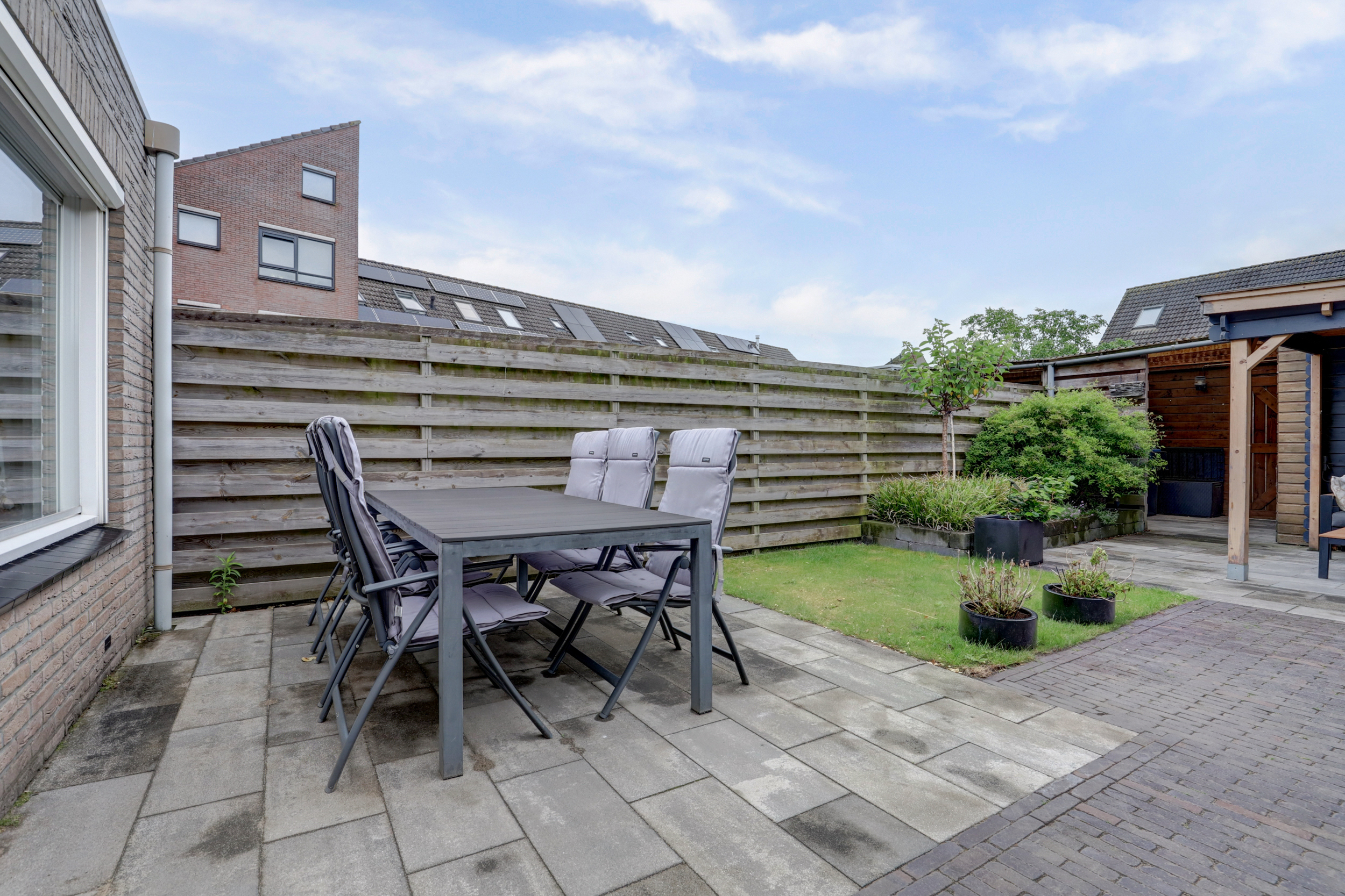 De keuken vormt het hart van de woning: eigentijds, ruim en praktisch ingericht. Vanuit de woonkamer stap je zo de zonnige achtertuin in, gelegen op het zuiden. Hier is het heerlijk ontspannen met een kop koffie in de ochtendzon of een gezellige barbecue op een zomerse avond. Achterin de tuin vind je bovendien een handige berging en een mooie overkapping – ideaal om fietsen en tuinspullen droog te stallen of juist om zelfs bij minder weer nog fijn buiten te zitten.