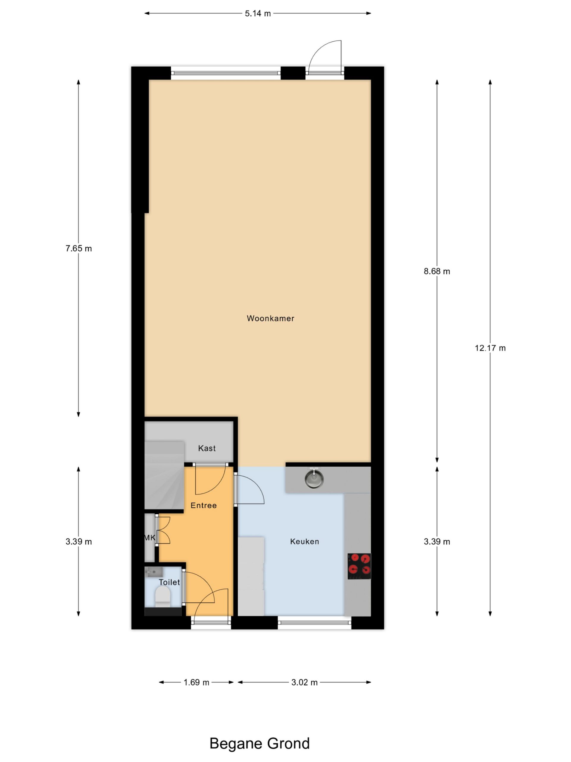 Entree, meterkast, toilet, trapopgang met trapkast, toegang tot de half-open keuken met inbouwapparatuur, aansluitend de zeer ruime en lichte woonkamer met toegang tot de op het zuiden gelegen achtertuin.