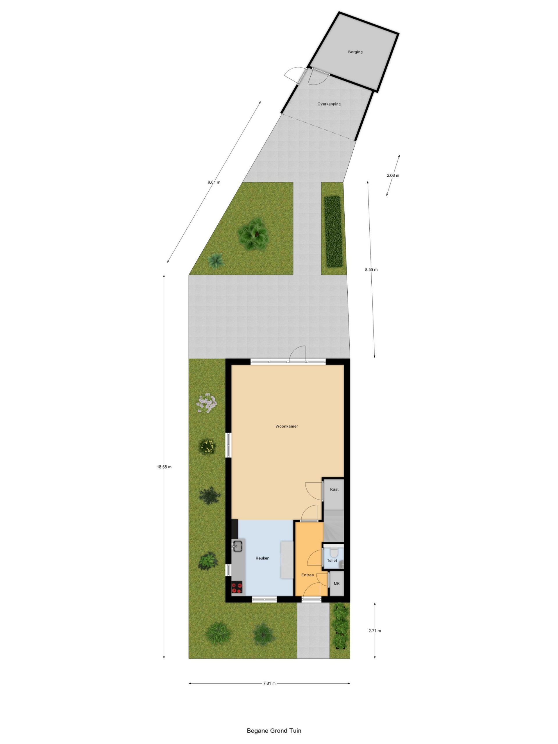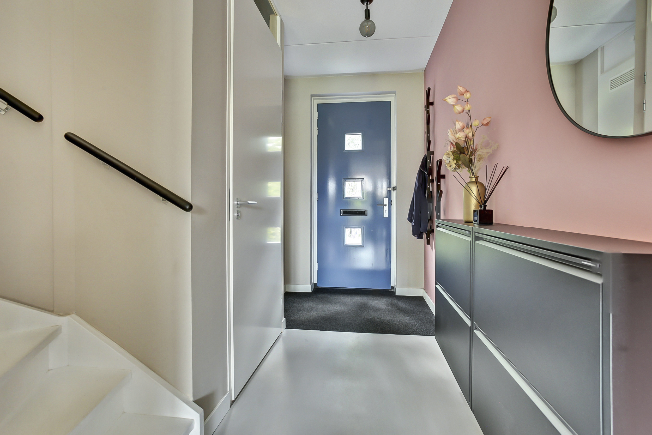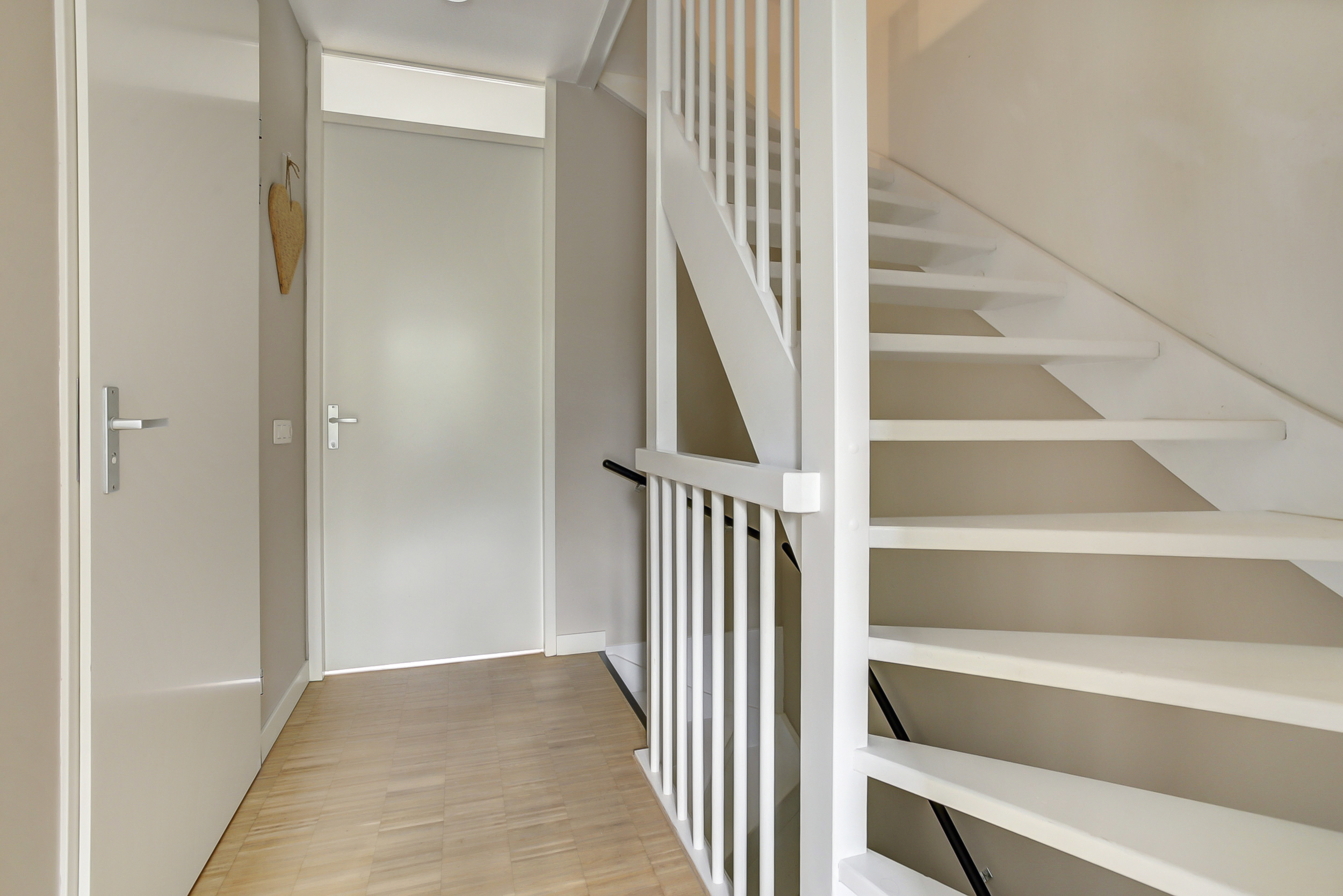 Entree met meterkast, toilet en trapopgang met berging onder de trap, ruime woonkamer met toegang naar de achtertuin op het westen, open keuken met inbouwapparatuur.