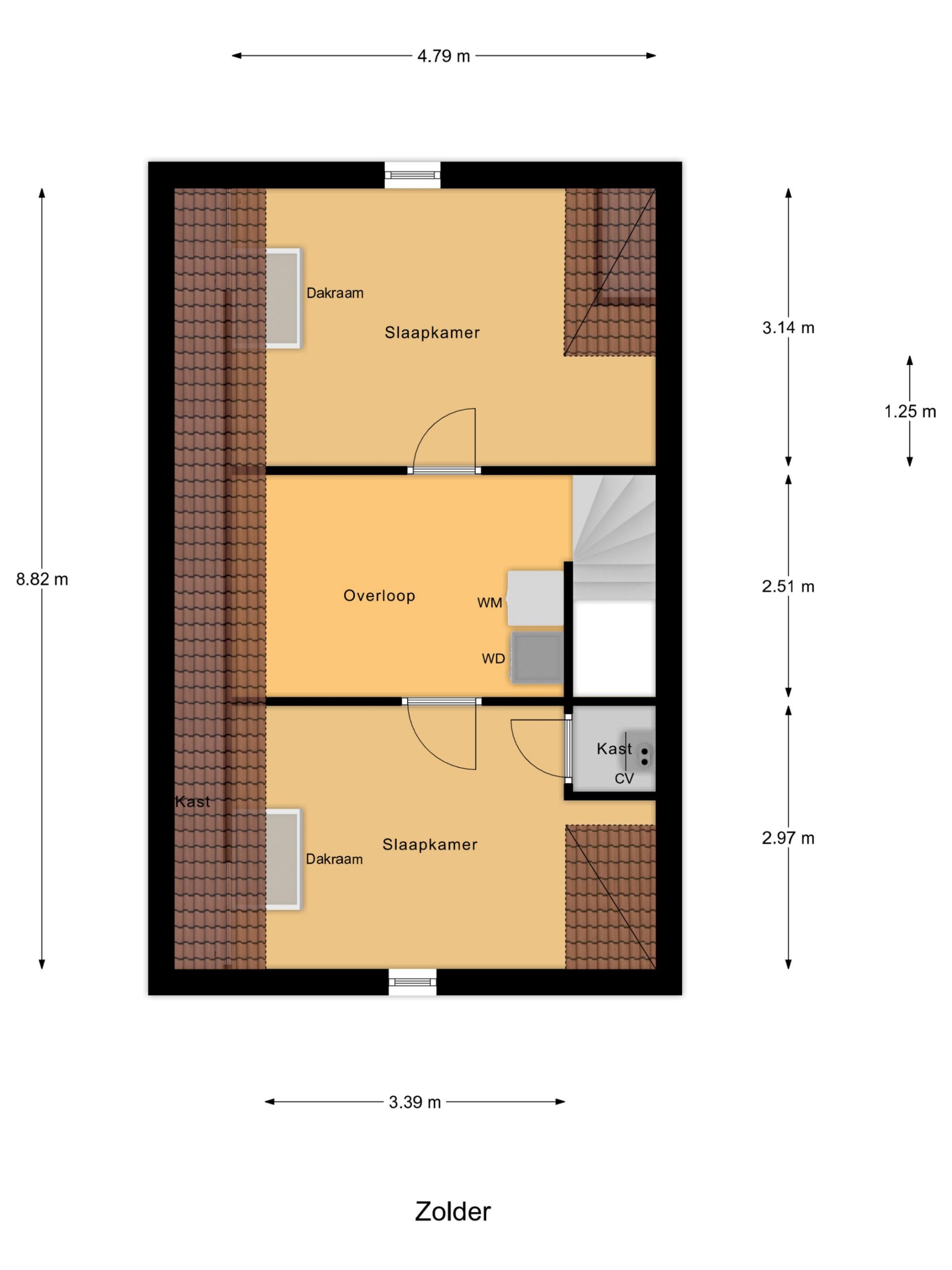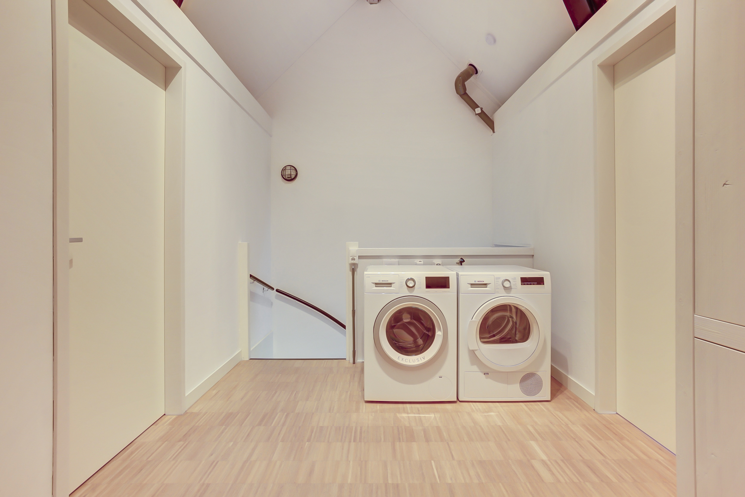 Overloop met wasmachineaansluiting, twee slaapkamers en kast met cv-installatie, toegang tot de vlizozolder.