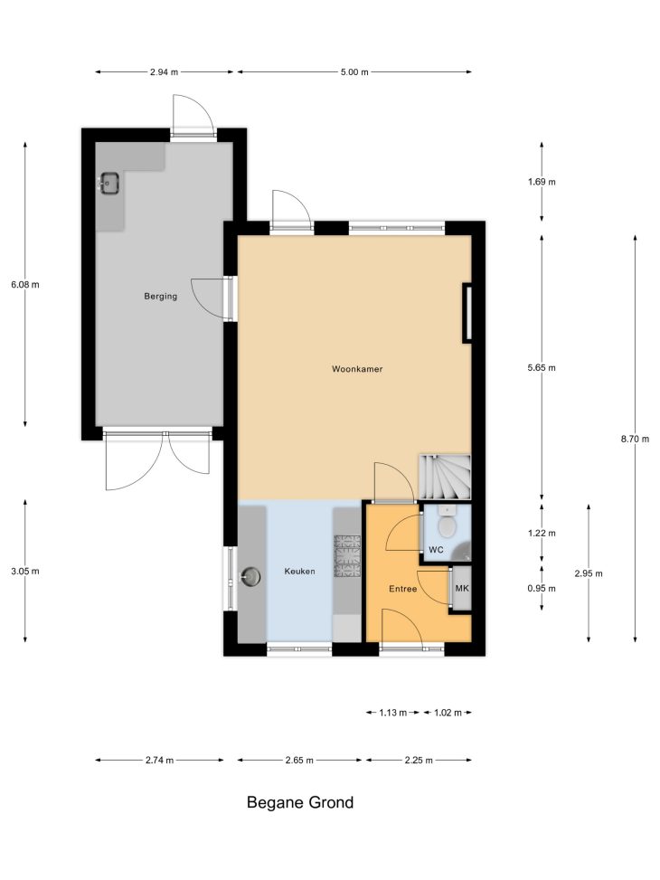 Entree, meterkast, toilet, toegang tot de ruime lichte tuingerichte woonkamer met trapopgang, open keuken met inbouwapparatuur. Toegang tot de berging met extra keukenblok.