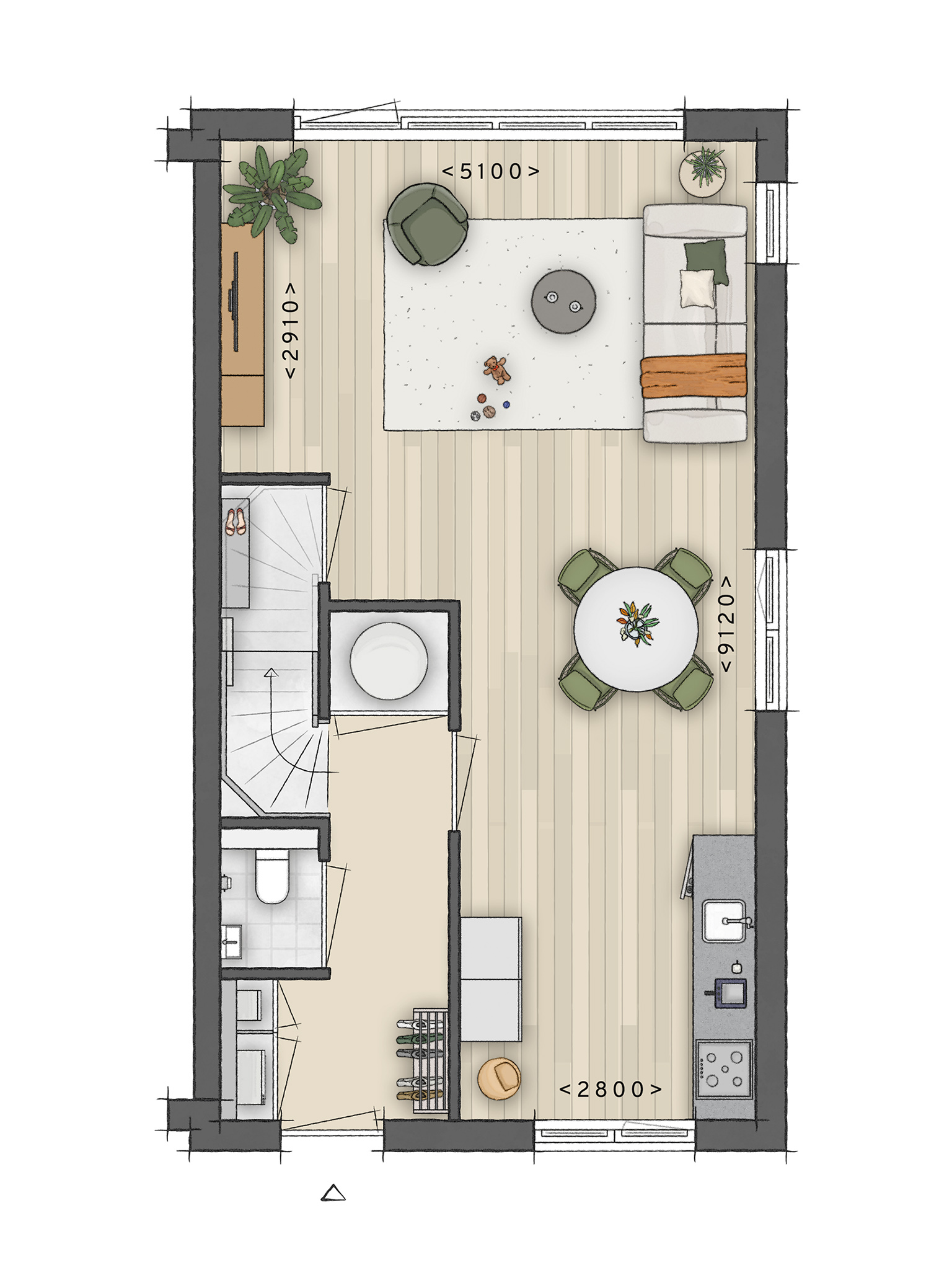 Via de voordeur stap je de royale hal van je nieuwe hoekwoning binnen. Hier vind je onder andere een separaat toilet, de trap naar boven en de deur tot de lichte leefruimte. Dankzij de open indeling loopt de volledig uitgeruste keuken – met alles wat je nodig hebt om lekker te koken – naadloos over in de ruime woonkamer (5,4 m2 breed). De glazen pui met openslaande deur naar de tuin zorgt voor een heerlijk lichte sfeer. In de tuin is altijd wel een fijn plekje te vinden voor een kop koffie, of ga lekker borrelen en eten in de buitenlucht. De houten berging in de tuin biedt plek voor je fiets, gereedschap of tuinkussens. Zo heb je alles bij de hand!
