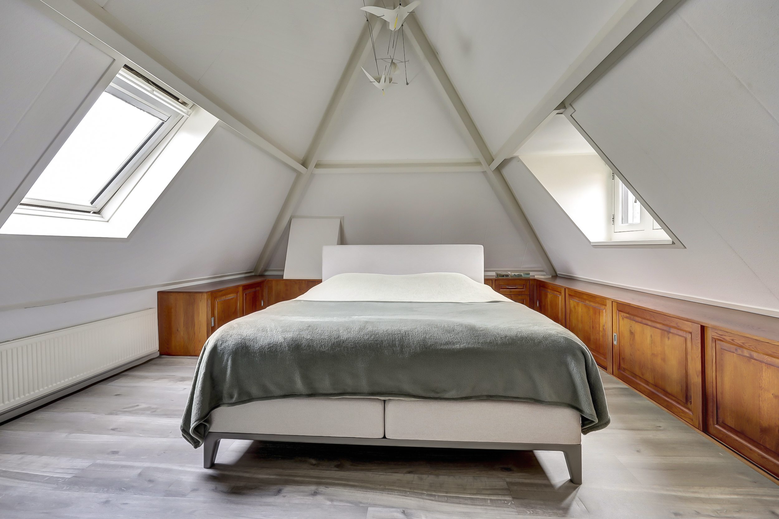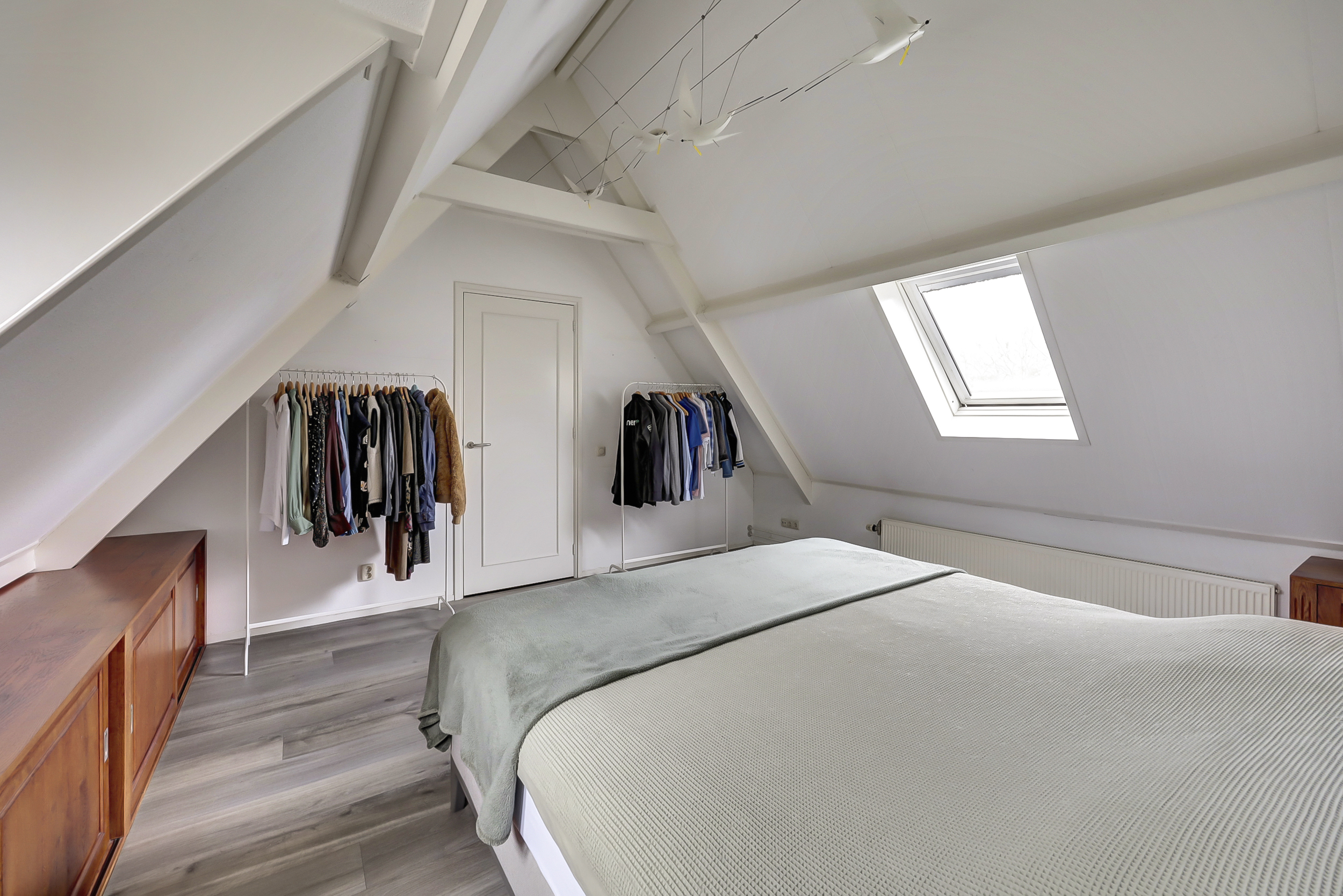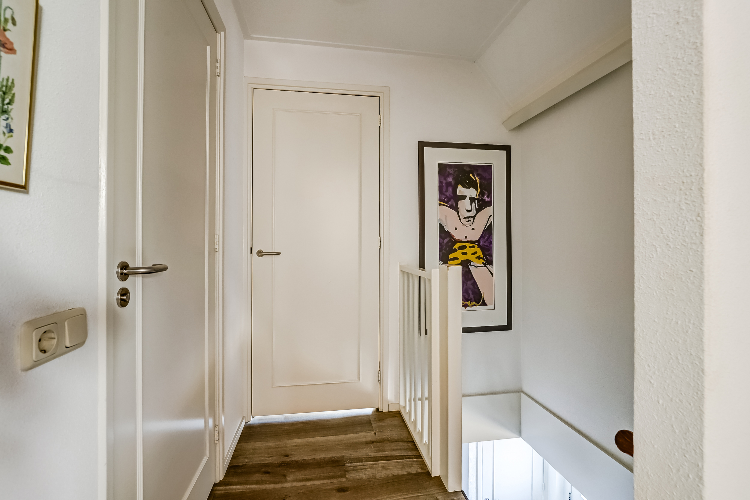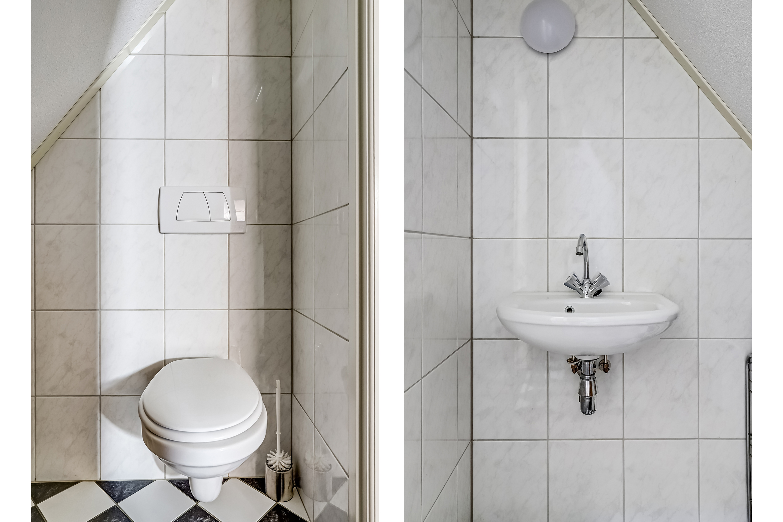 Overloop, toilet met fontein, twee slaapkamers met dakkapel, berging met Cv-installatie.