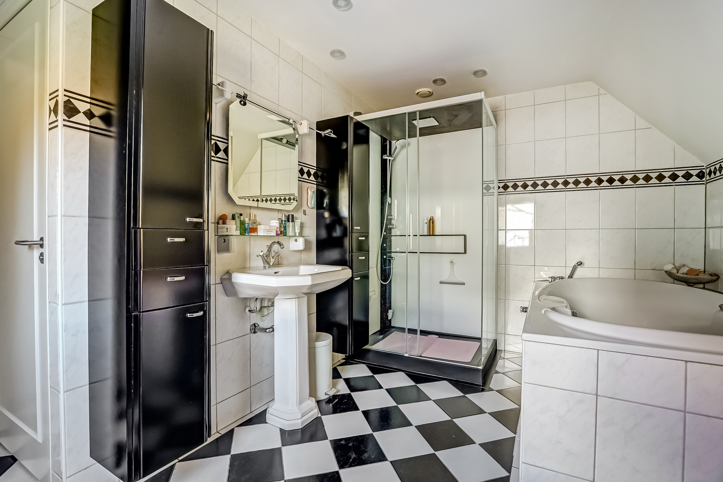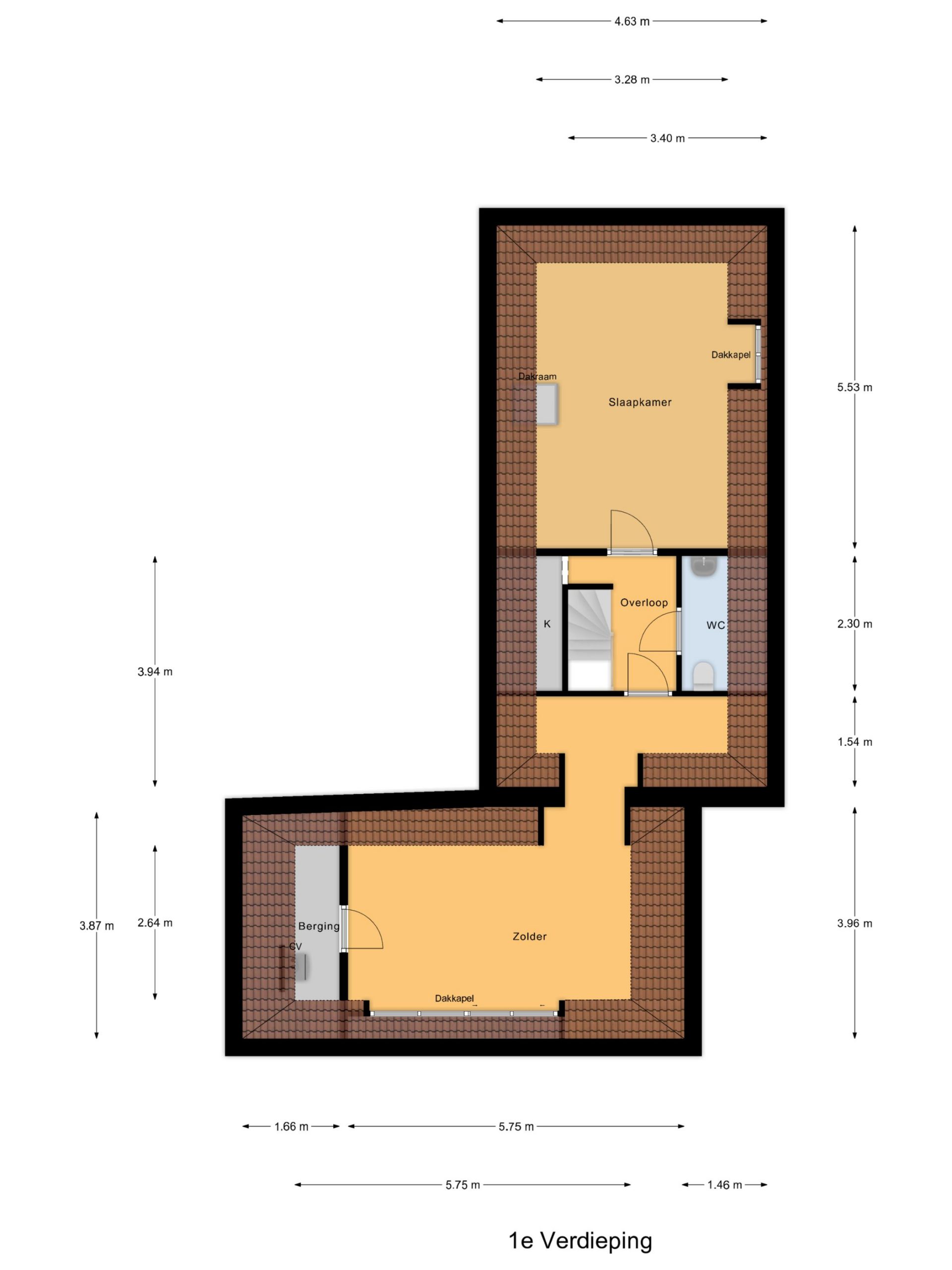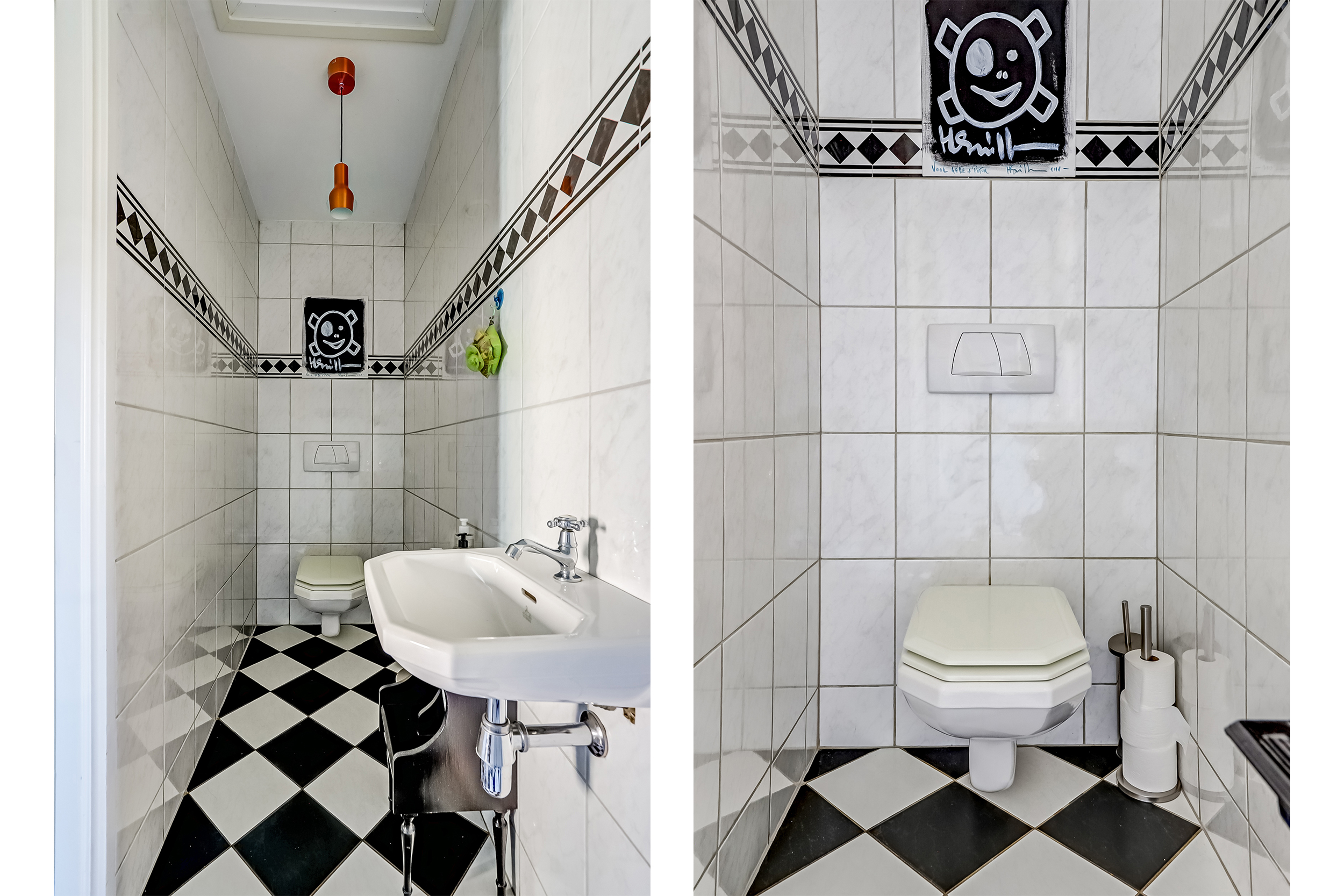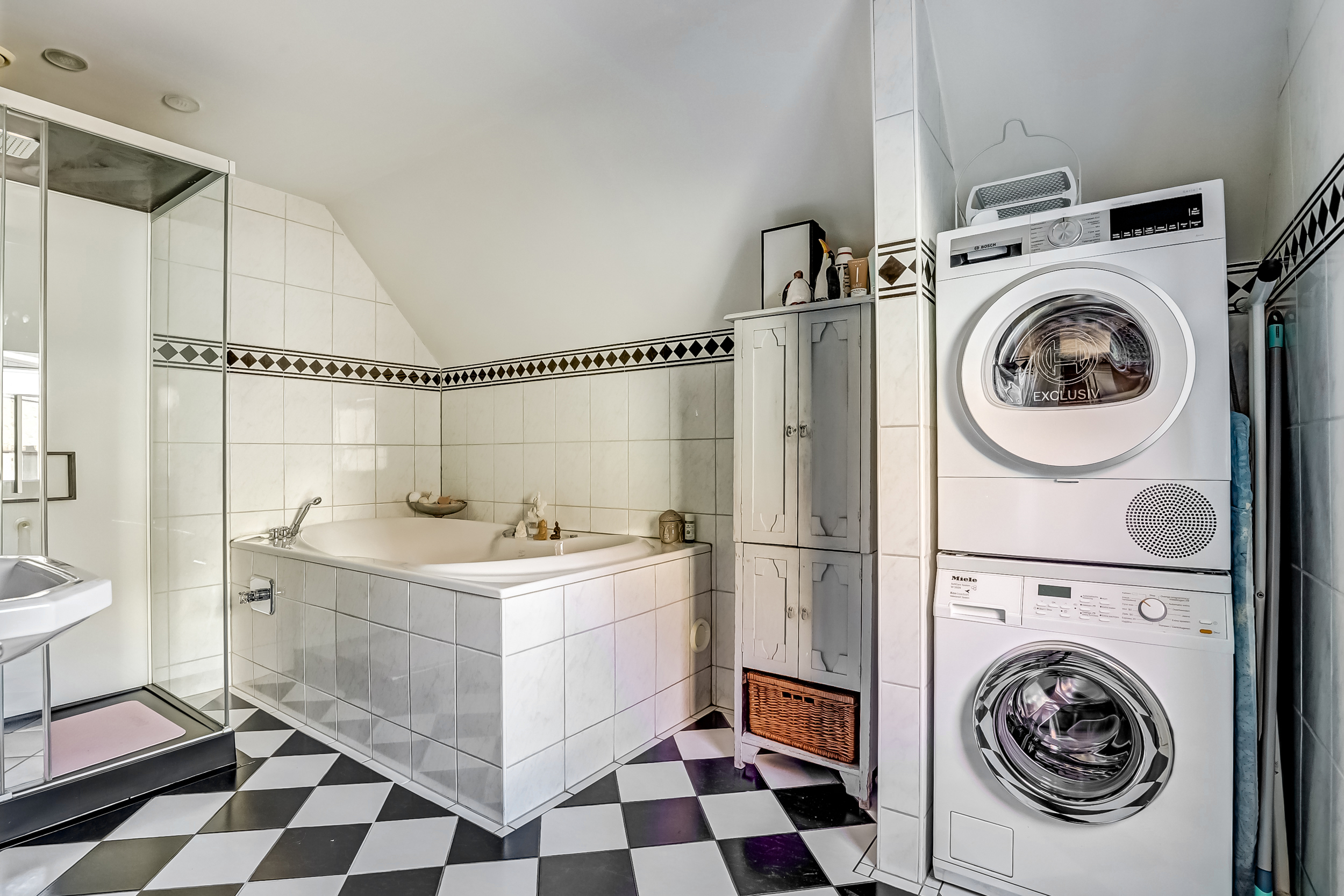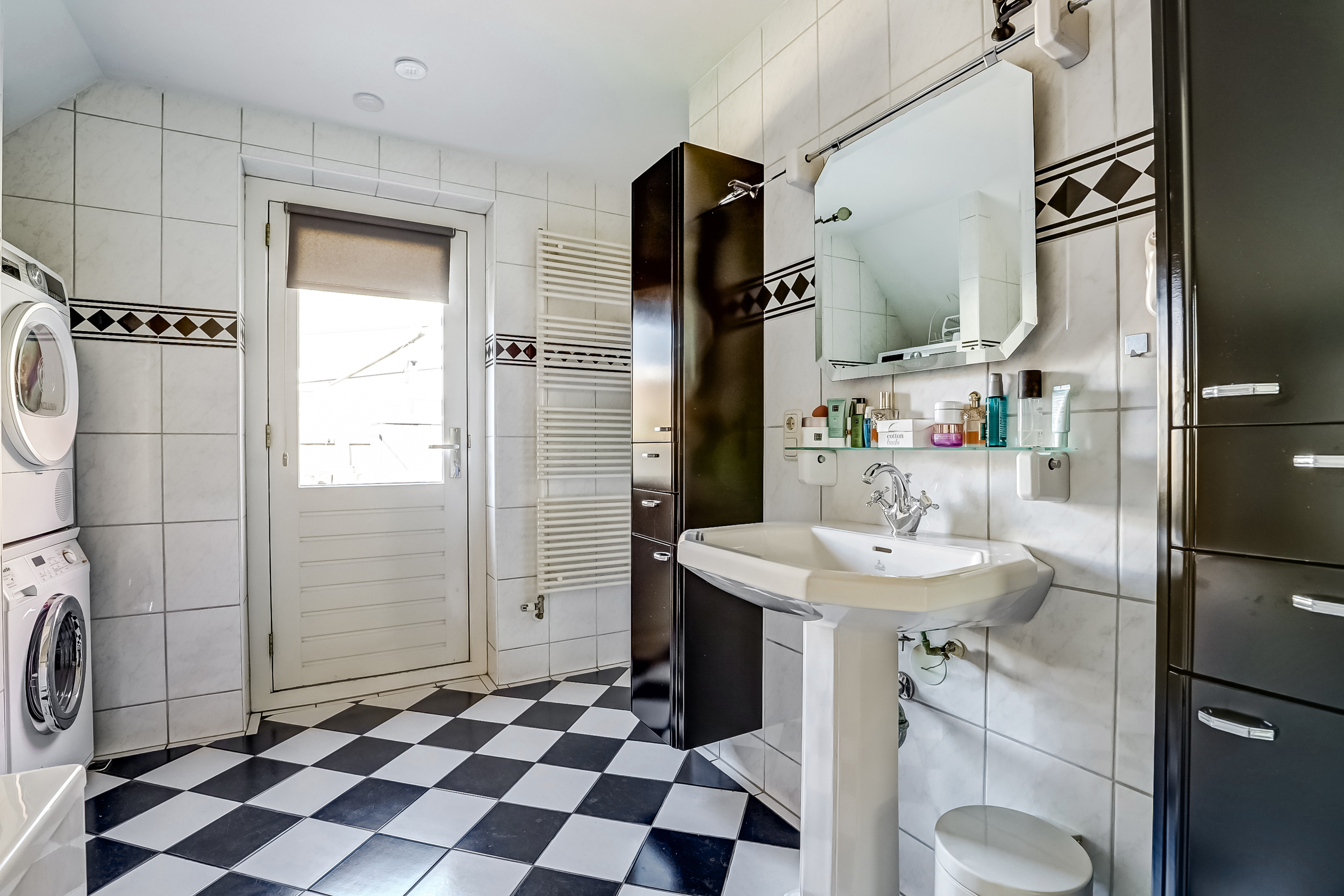 Overloop, toilet met fontein, twee slaapkamers met dakkapel, berging met Cv-installatie.